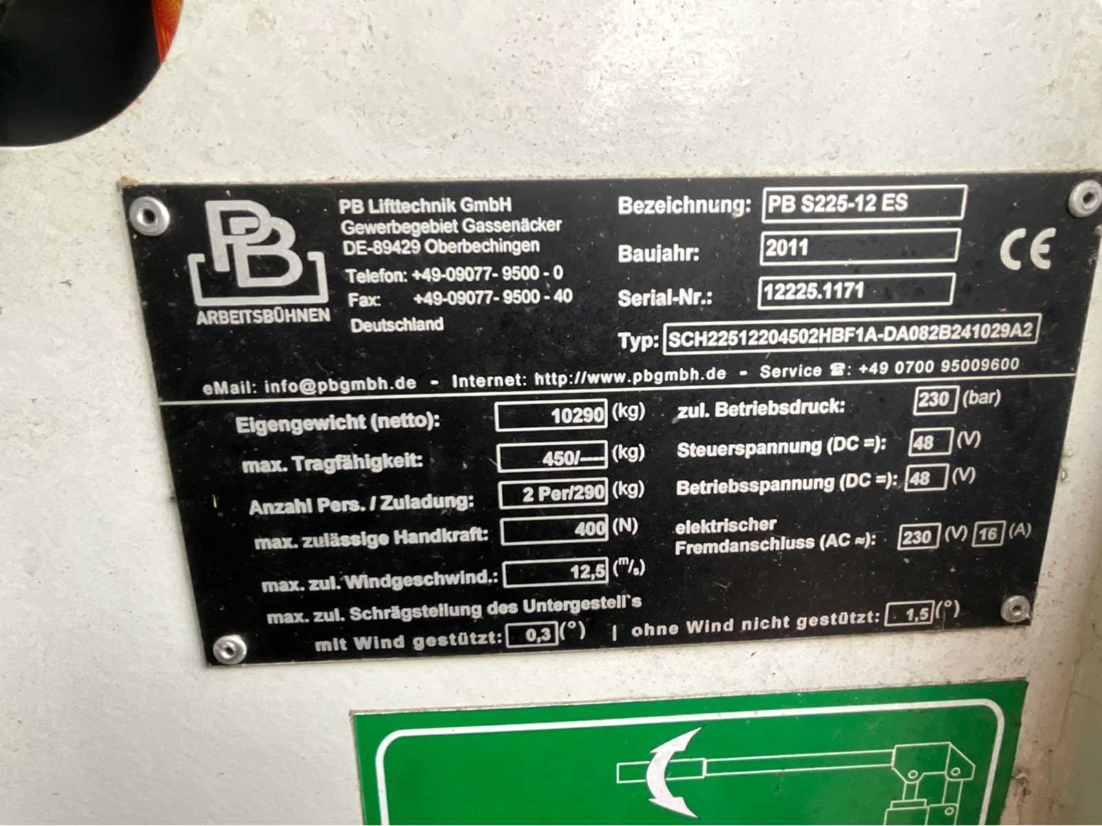 Werkhoogte 22,5m, laadvermogen 450 kg, platformafmetingen 1.19x3.98m. uitschuifbaar tot 5.48m Draaicirkel buiten 3.65m. Nee Merk: PB Type: S225-12ES Bouwjaar: 2011 Serienummer: 12225.1171 Elektrisch: true Schaarhoogwerker: true Werkhoogte: 22500mm Plateau afm. l: 3980mm Plateau afm. b: 11900mm Accu lader: true Eigen gewicht: 10290kg Totale afmeting L: 44900mm Totale afmeting Breedte: 12200mm Totale afmeting Hoogte: 29100mm