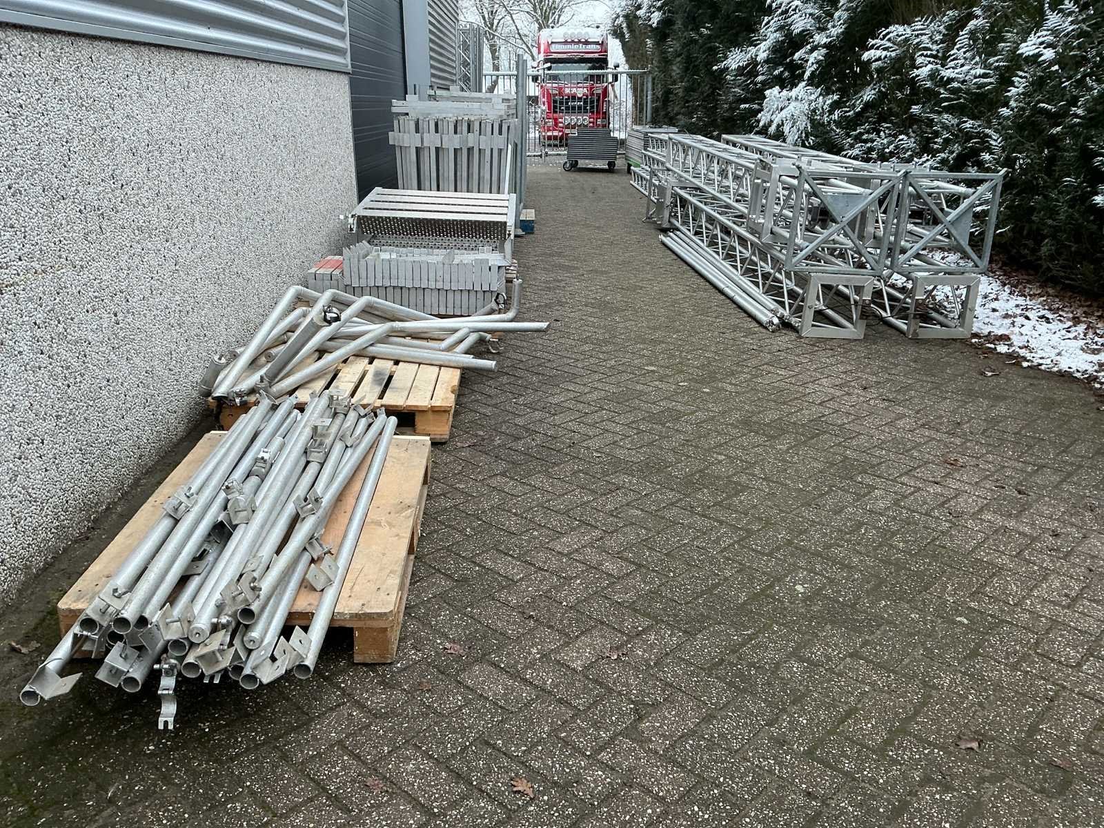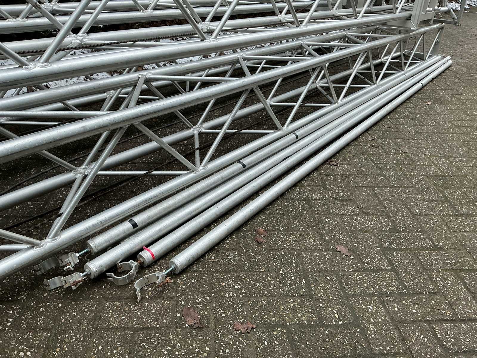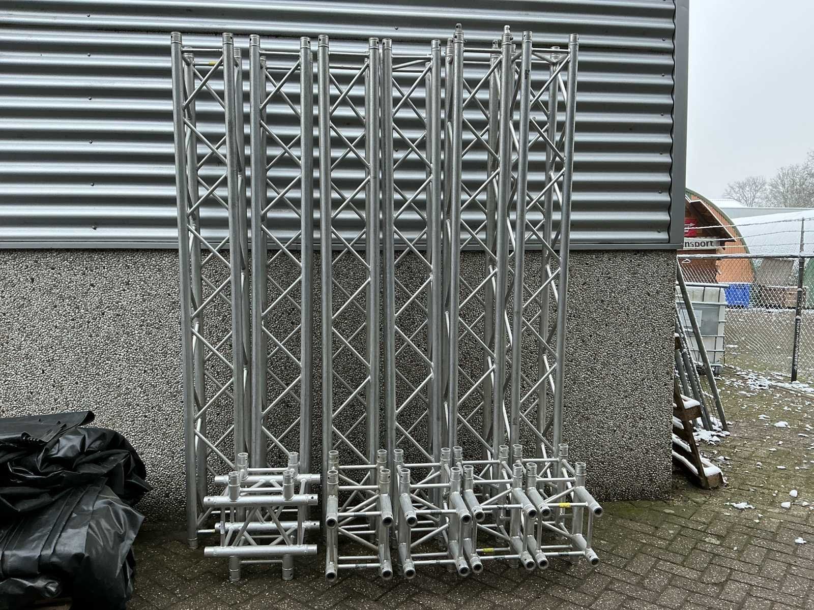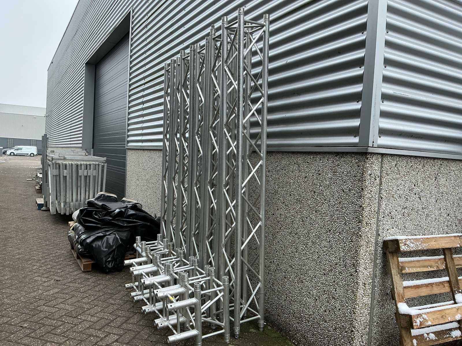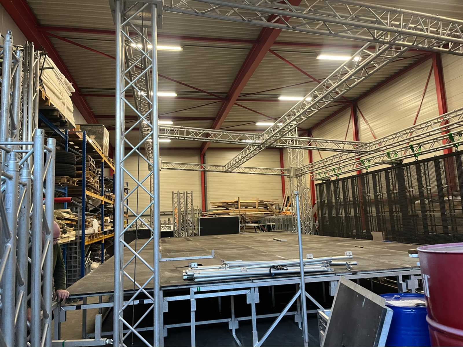 Voorzien van: opbergrekken, verhoogde vloer (100cm hoog), 2x trap, complete railing, 4x truss tower met lier voor dak omhoog te hijsen, 6x Truss (5 meter), 6x Truss ( 2,5 meter), 4x T-stuk, 1 x kruisstuk, 2x zeilenpakket, 28x vloerdeel (2,5m x 1m), 4x vloerdeel (67cm x 250cm), 4 passtuk, diverse koppelstukken vloer, complete set voor opbouwen podium Nee Merk: Global Truss Type: Aluminium Opbouw Aluminium poten lengte: 1000mm Totale afmeting L: 11000mm Totale afmeting Breedte: 7000mm Totale afmeting Hoogte: 5500mm