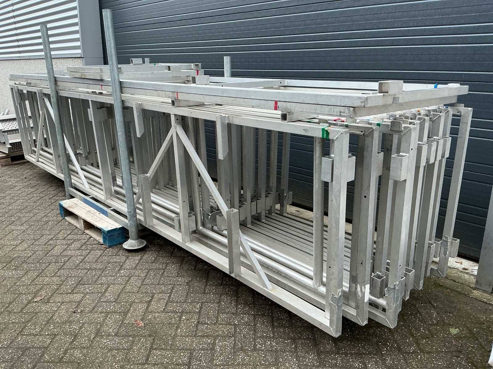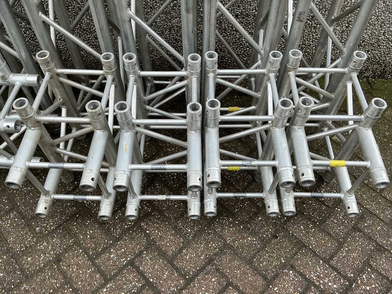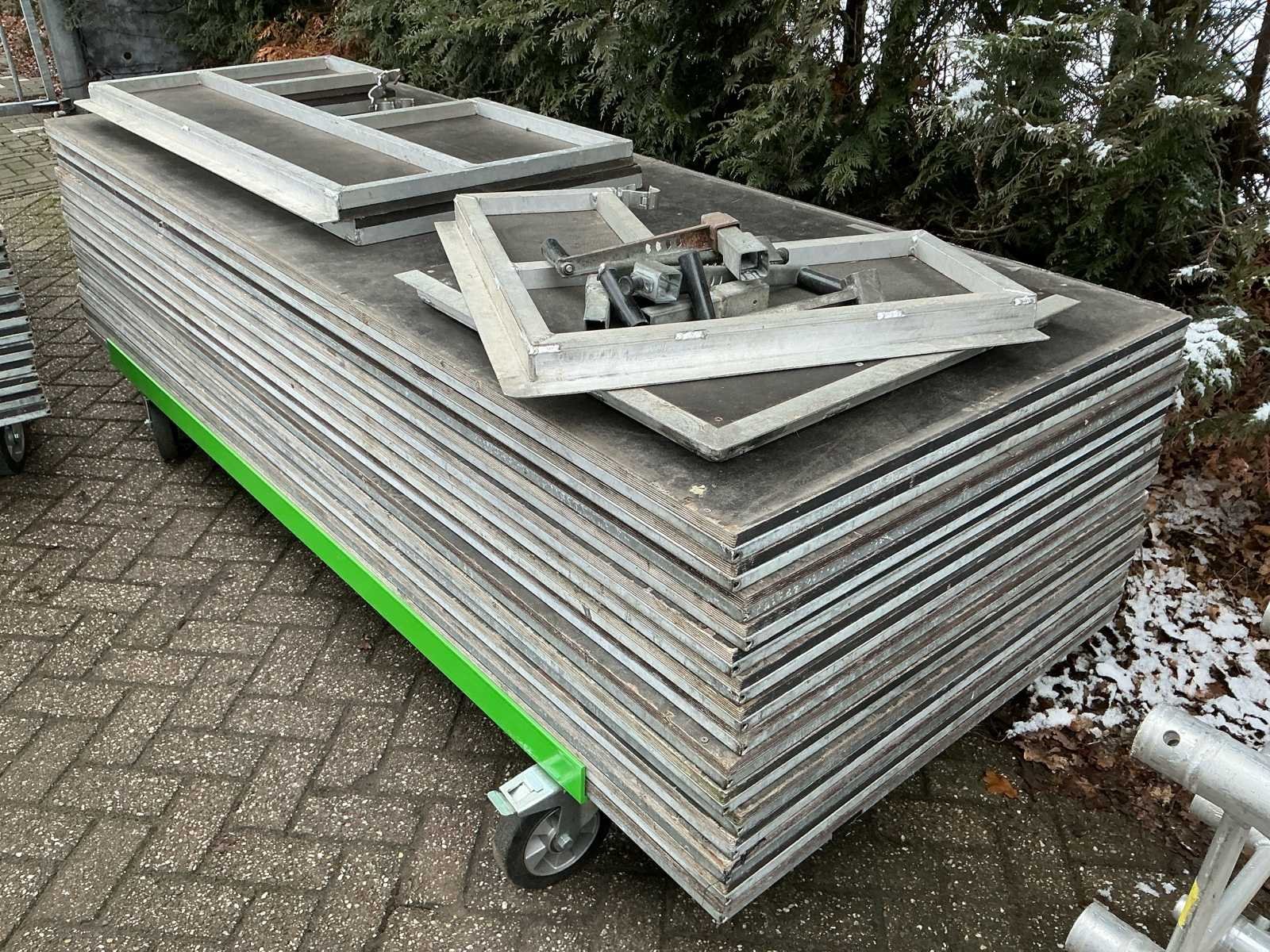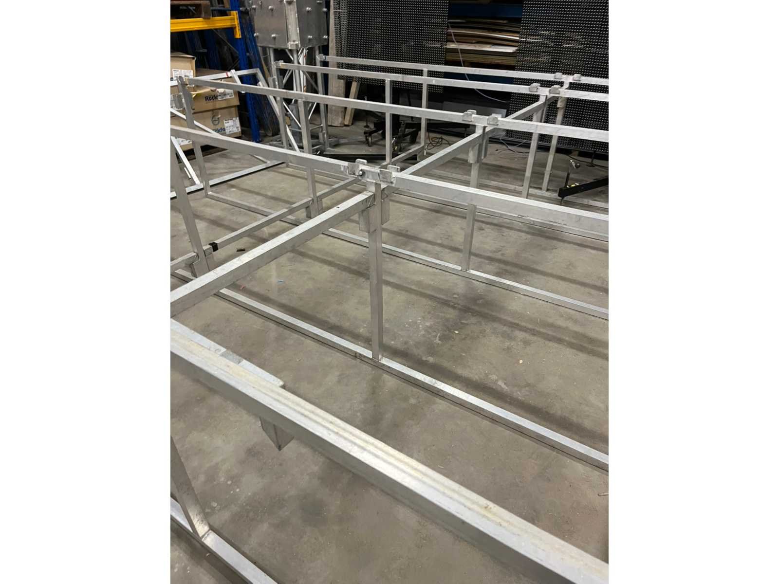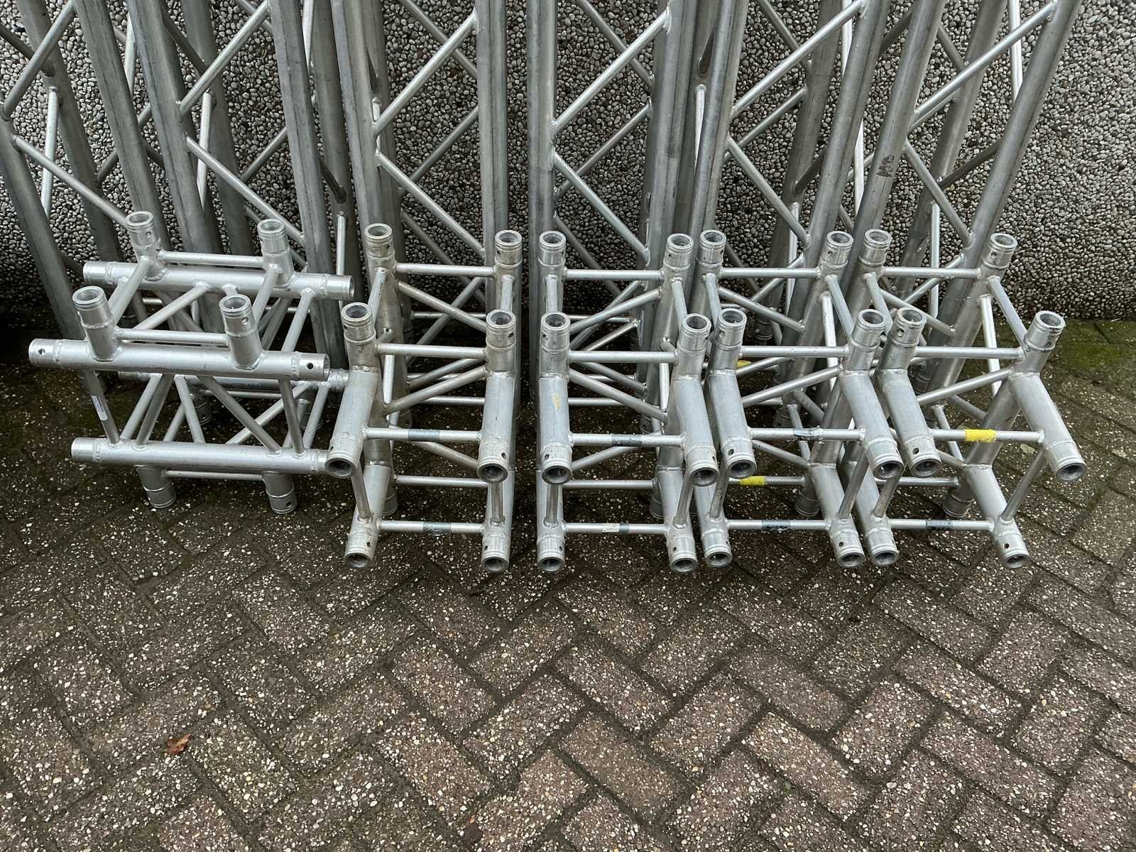 Voorzien van: opbergrekken, verhoogde vloer (100cm hoog), 2x trap, complete railing, 4x truss tower met lier voor dak omhoog te hijsen, 6x Truss (5 meter), 6x Truss ( 2,5 meter), 4x T-stuk, 1 x kruisstuk, 2x zeilenpakket, 28x vloerdeel (2,5m x 1m), 4x vloerdeel (67cm x 250cm), 4 passtuk, diverse koppelstukken vloer, complete set voor opbouwen podium Nee Merk: Global Truss Type: Aluminium Opbouw Aluminium poten lengte: 1000mm Totale afmeting L: 11000mm Totale afmeting Breedte: 7000mm Totale afmeting Hoogte: 5500mm