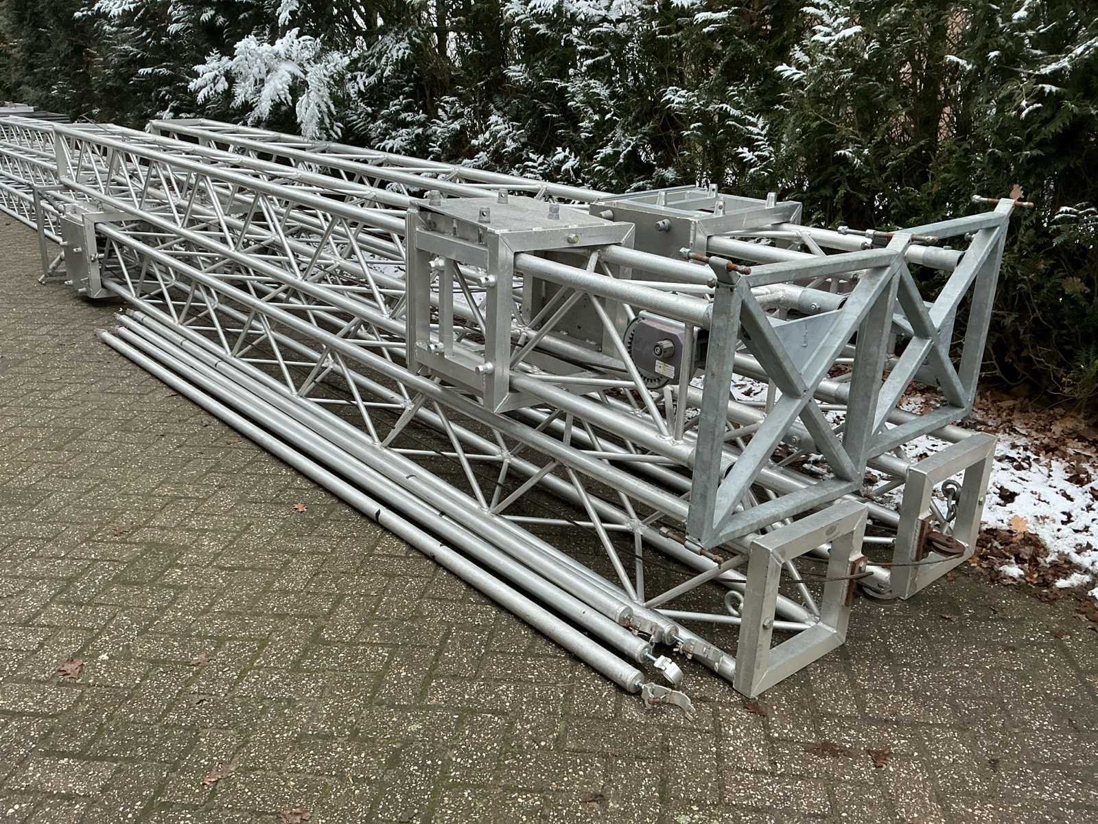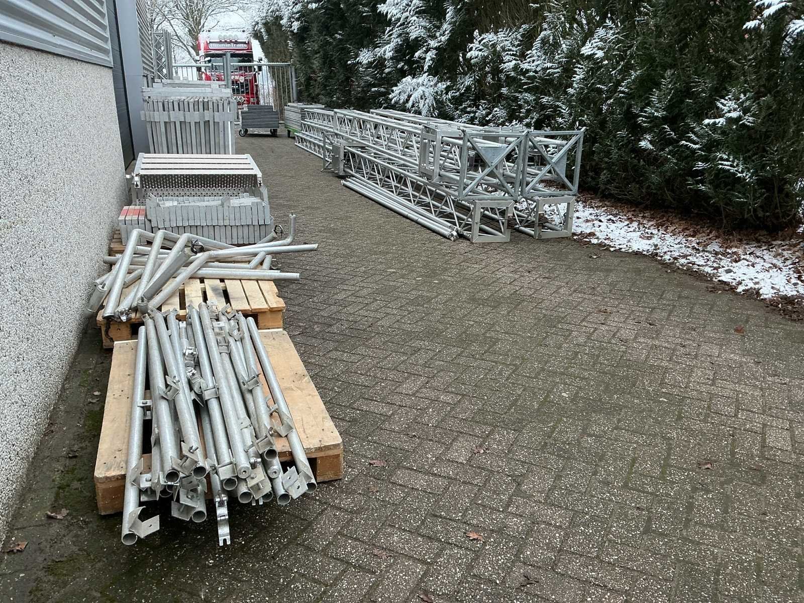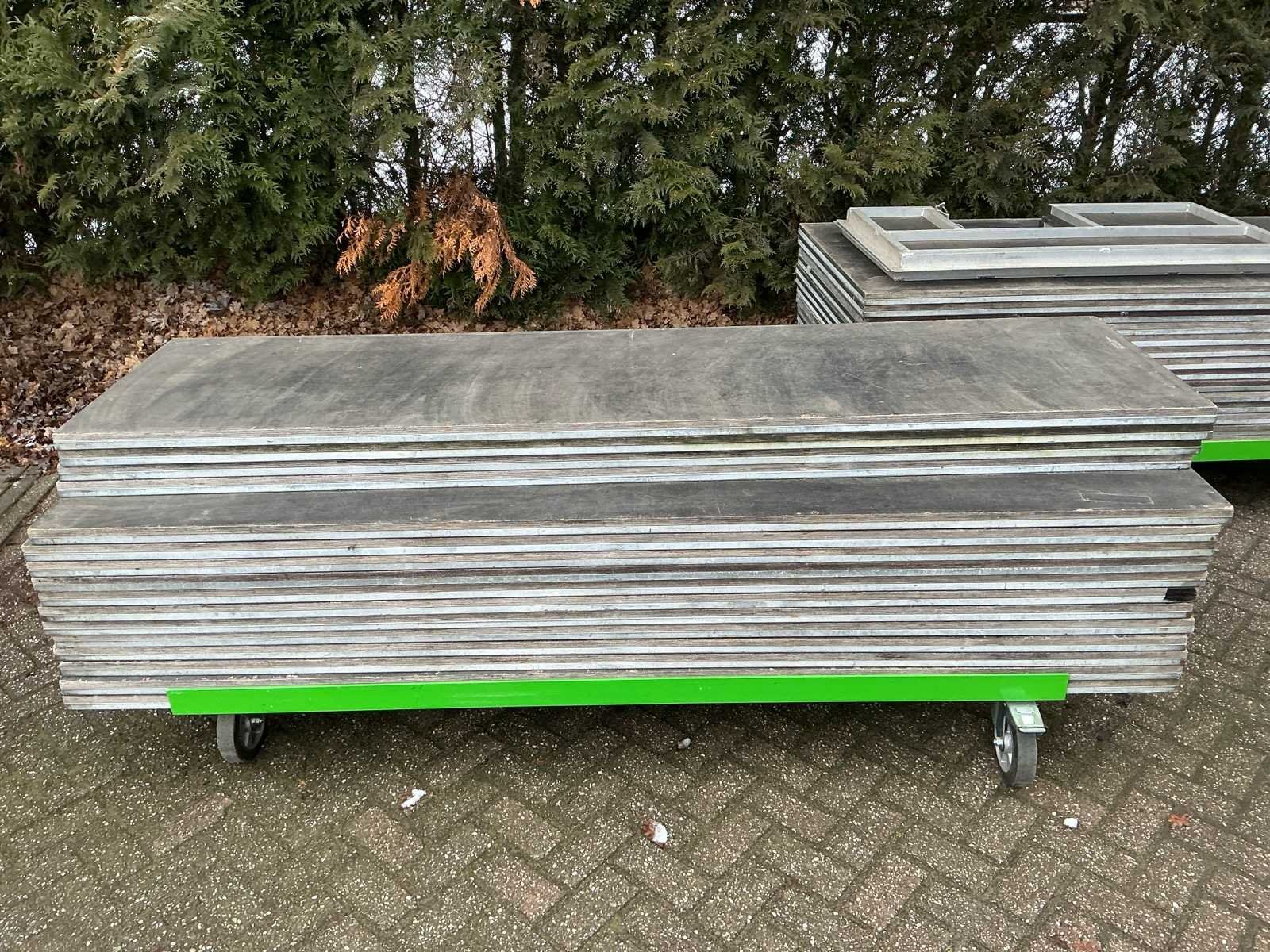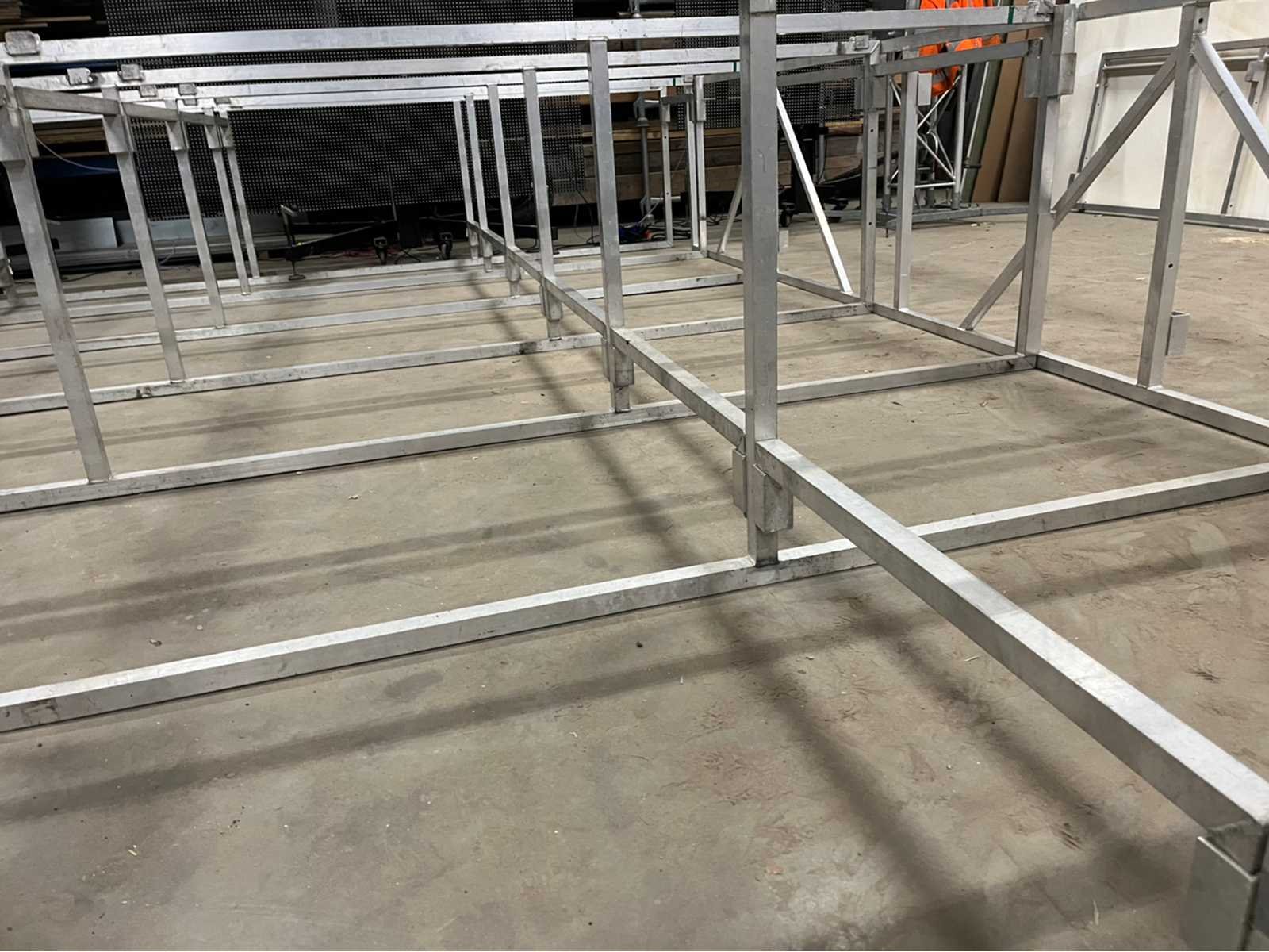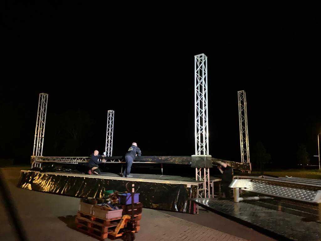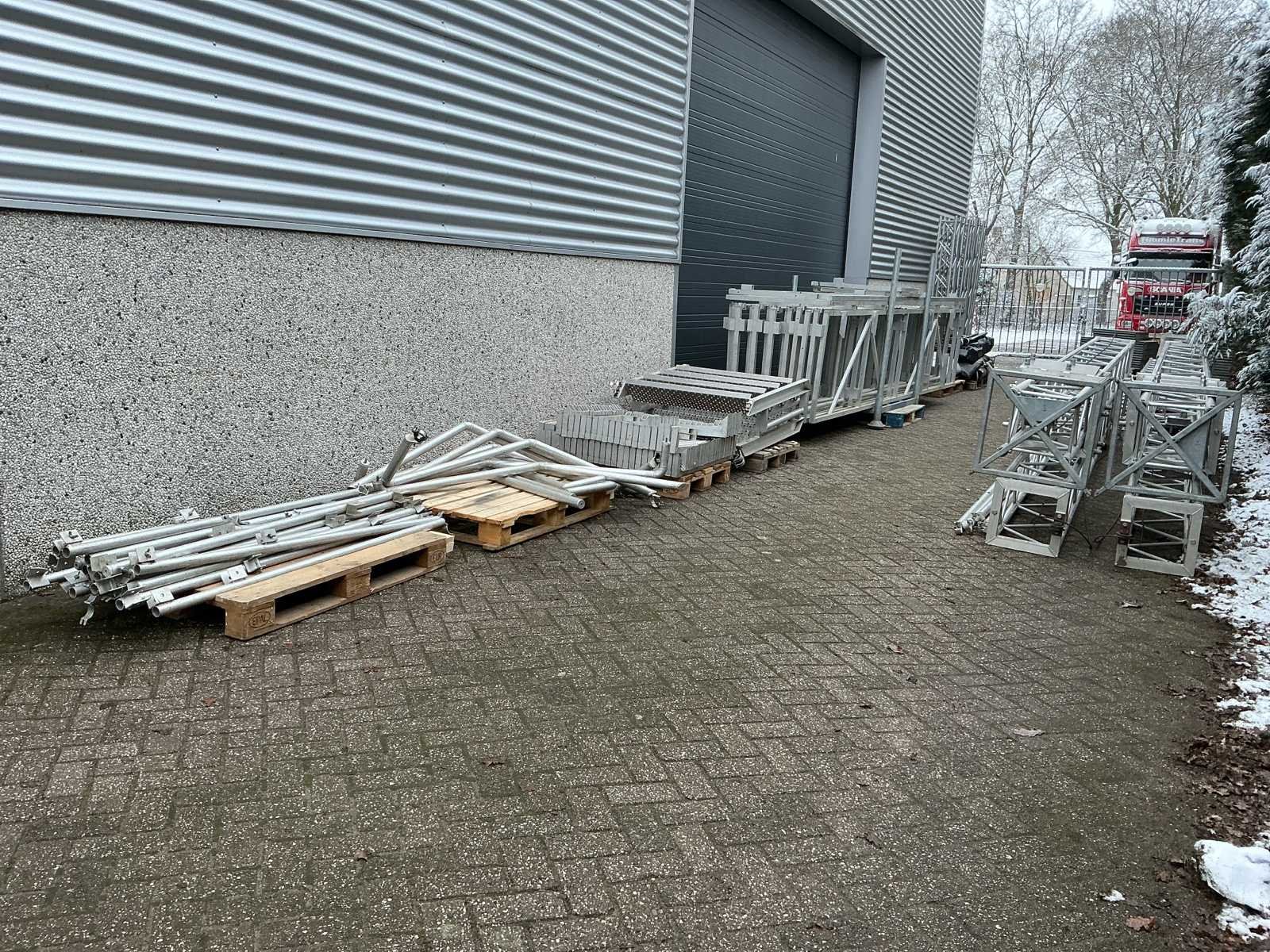 Voorzien van: opbergrekken, verhoogde vloer (100cm hoog), 2x trap, complete railing, 4x truss tower met lier voor dak omhoog te hijsen, 6x Truss (5 meter), 6x Truss ( 2,5 meter), 4x T-stuk, 1 x kruisstuk, 2x zeilenpakket, 28x vloerdeel (2,5m x 1m), 4x vloerdeel (67cm x 250cm), 4 passtuk, diverse koppelstukken vloer, complete set voor opbouwen podium Nee Merk: Global Truss Type: Aluminium Opbouw Aluminium poten lengte: 1000mm Totale afmeting L: 11000mm Totale afmeting Breedte: 7000mm Totale afmeting Hoogte: 5500mm