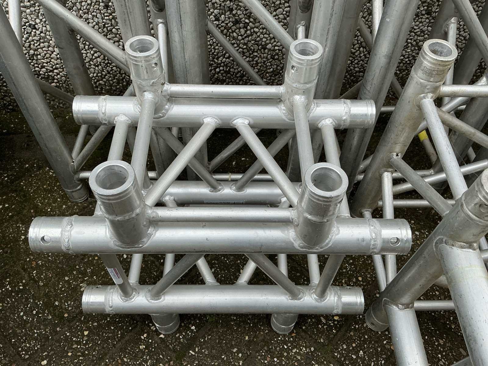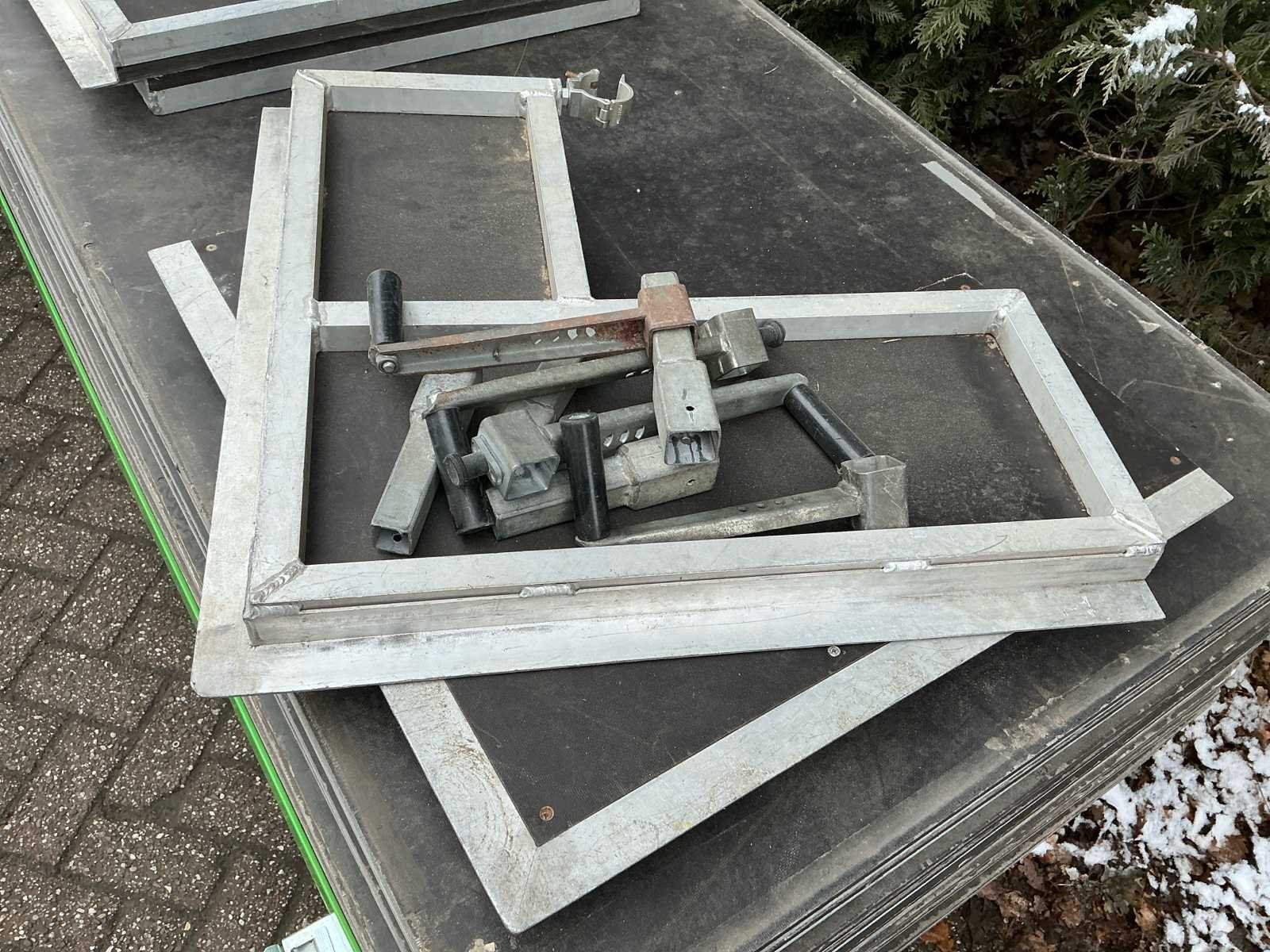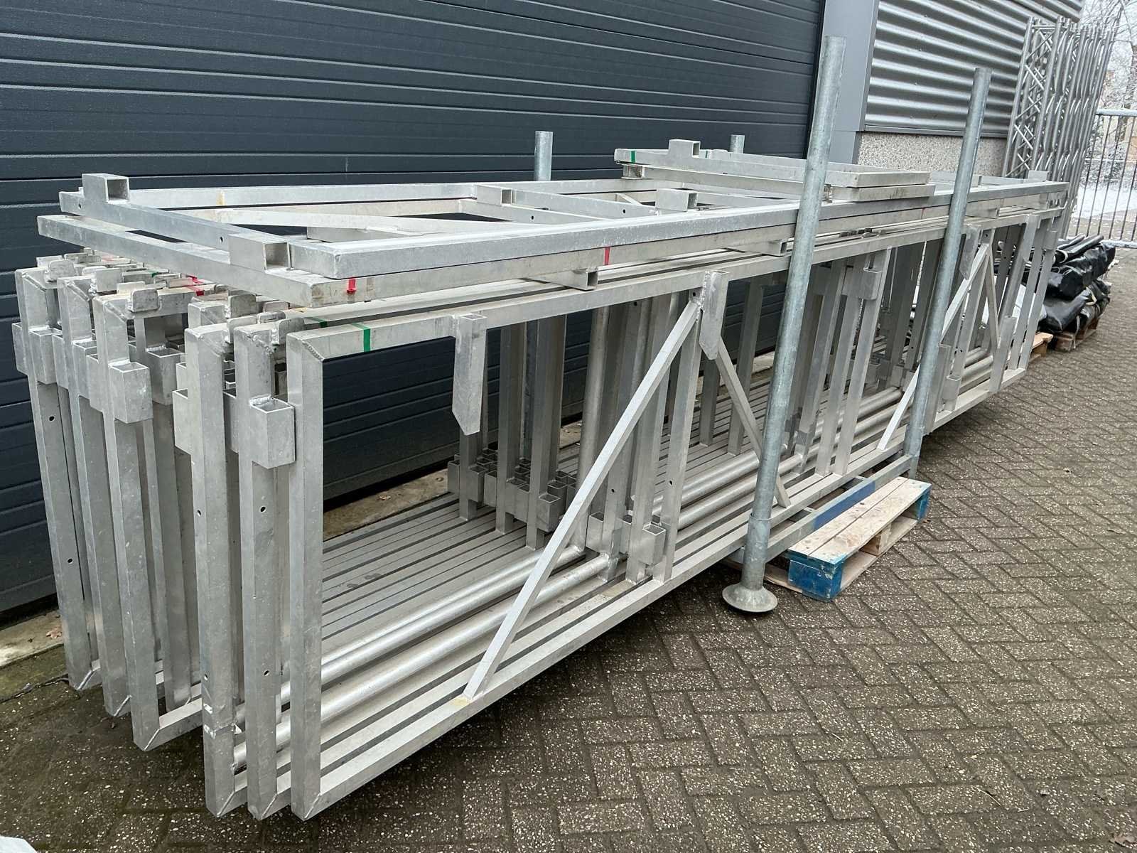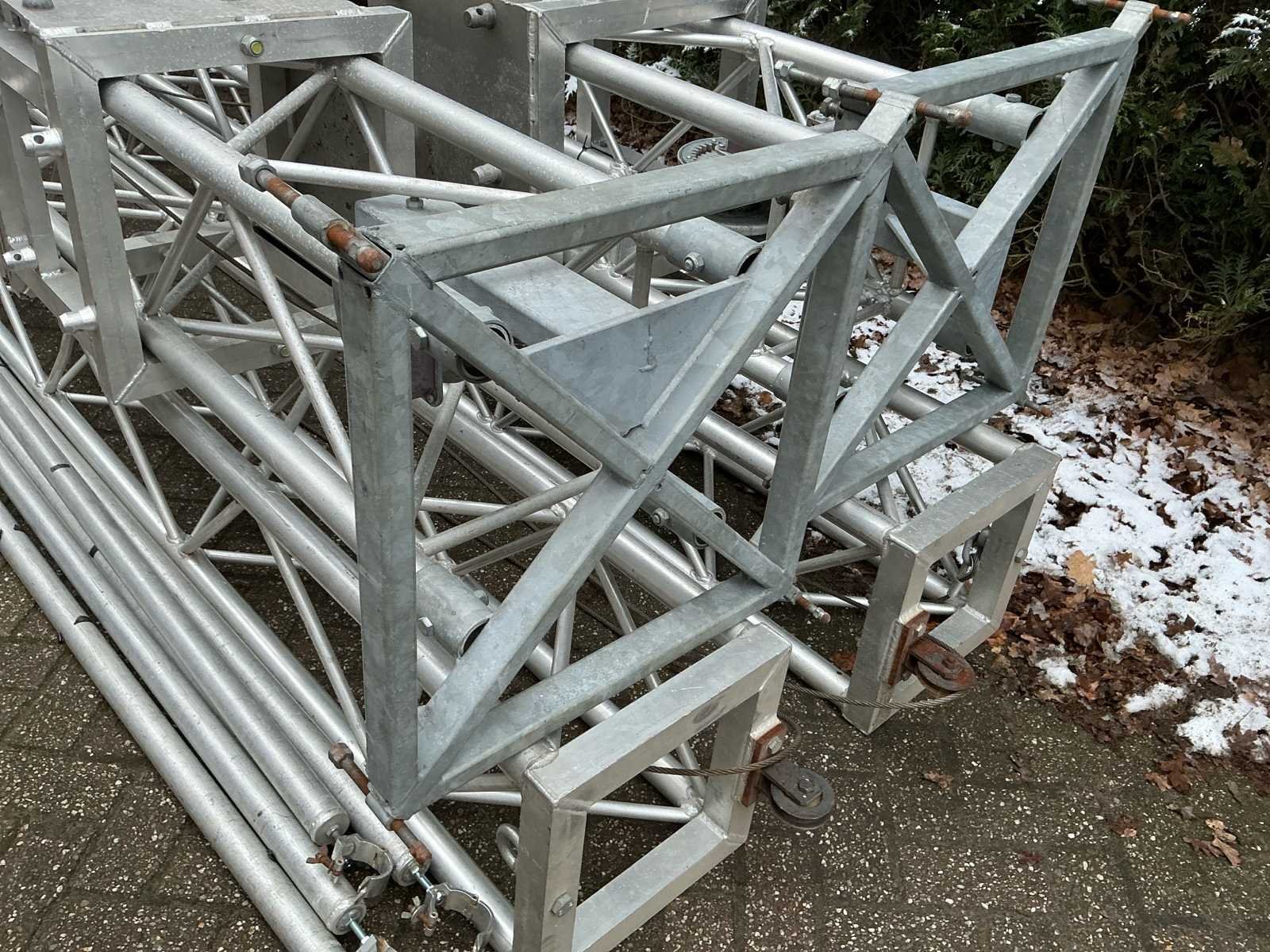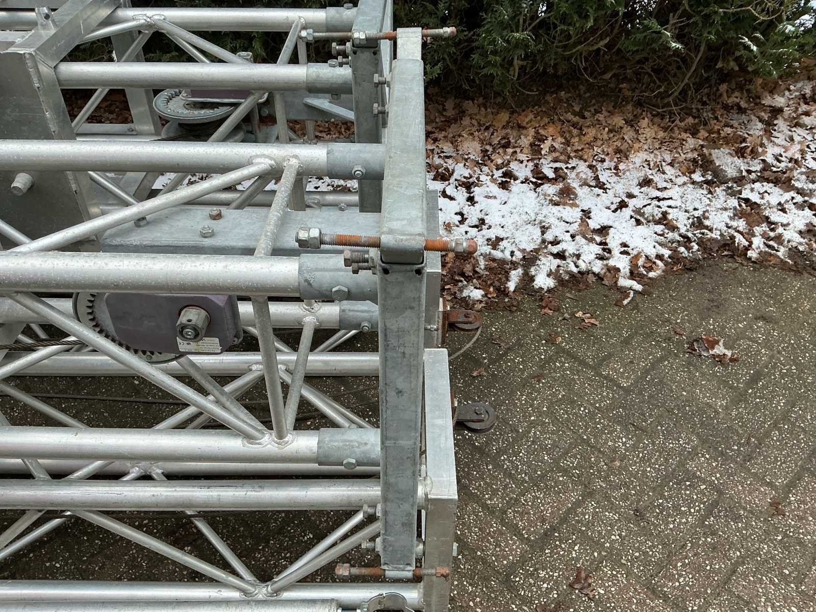 Voorzien van: opbergrekken, verhoogde vloer (100cm hoog), 2x trap, complete railing, 4x truss tower met lier voor dak omhoog te hijsen, 6x Truss (5 meter), 6x Truss ( 2,5 meter), 4x T-stuk, 1 x kruisstuk, 2x zeilenpakket, 28x vloerdeel (2,5m x 1m), 4x vloerdeel (67cm x 250cm), 4 passtuk, diverse koppelstukken vloer, complete set voor opbouwen podium Nee Merk: Global Truss Type: Aluminium Opbouw Aluminium poten lengte: 1000mm Totale afmeting L: 11000mm Totale afmeting Breedte: 7000mm Totale afmeting Hoogte: 5500mm