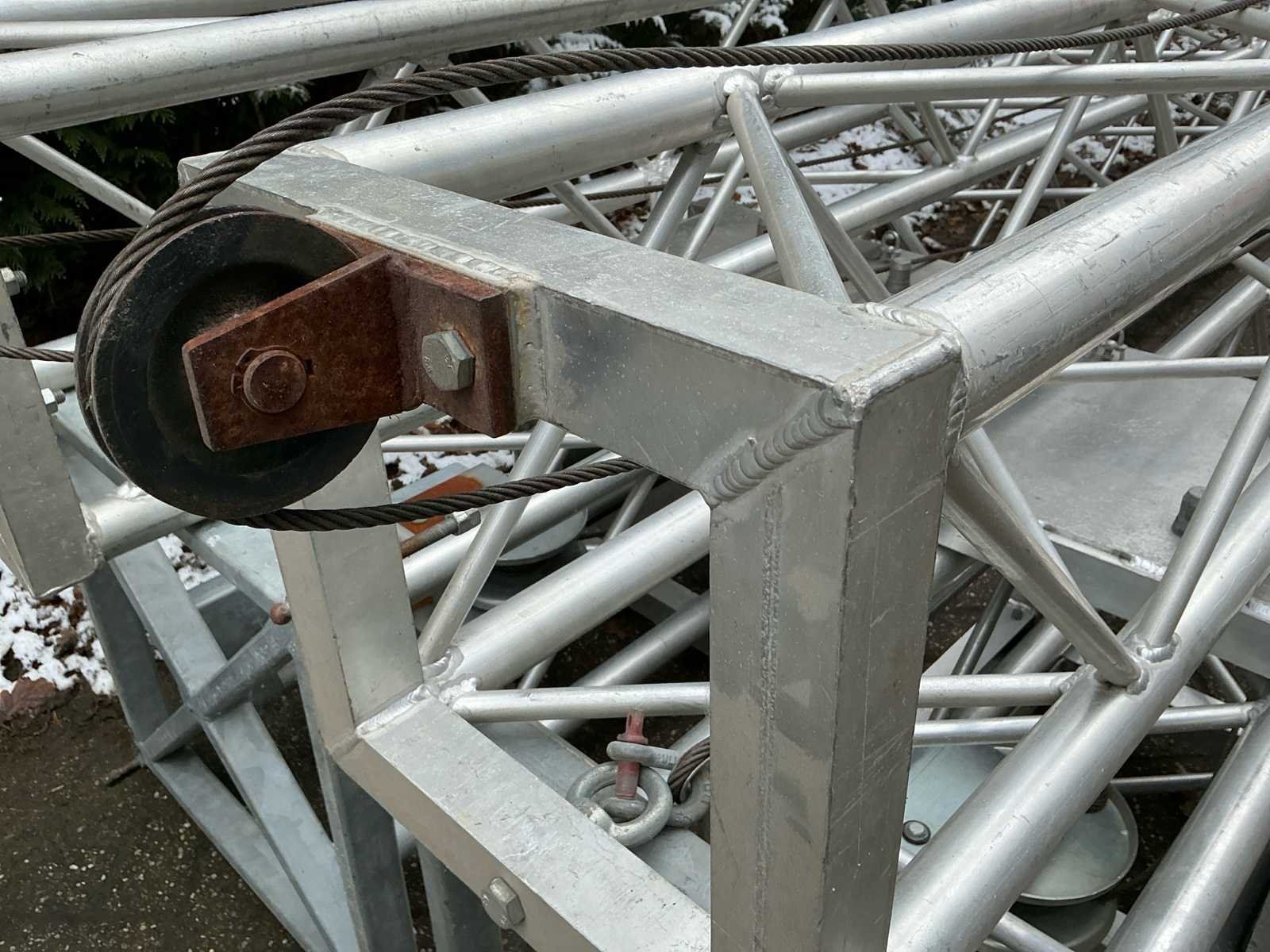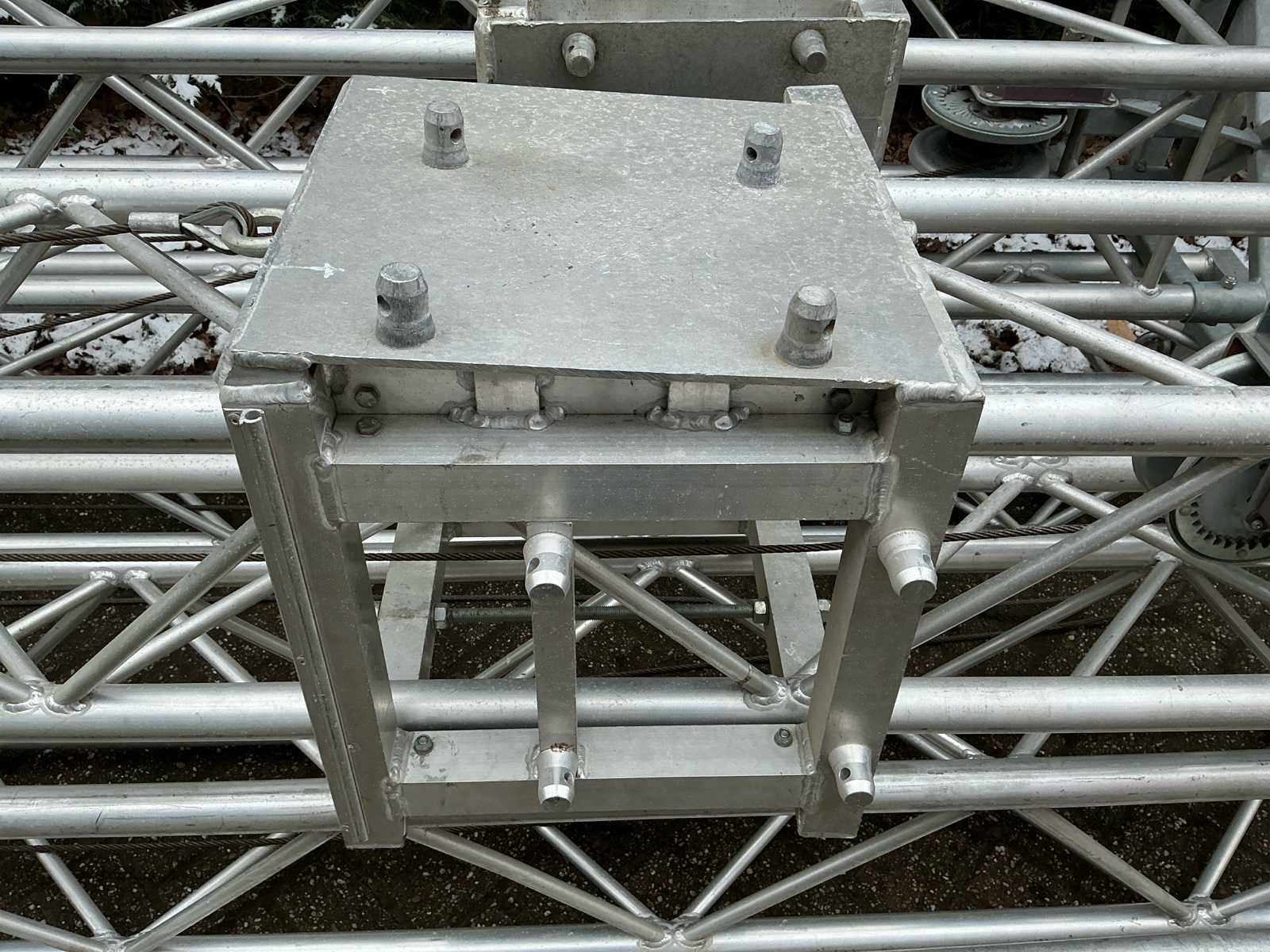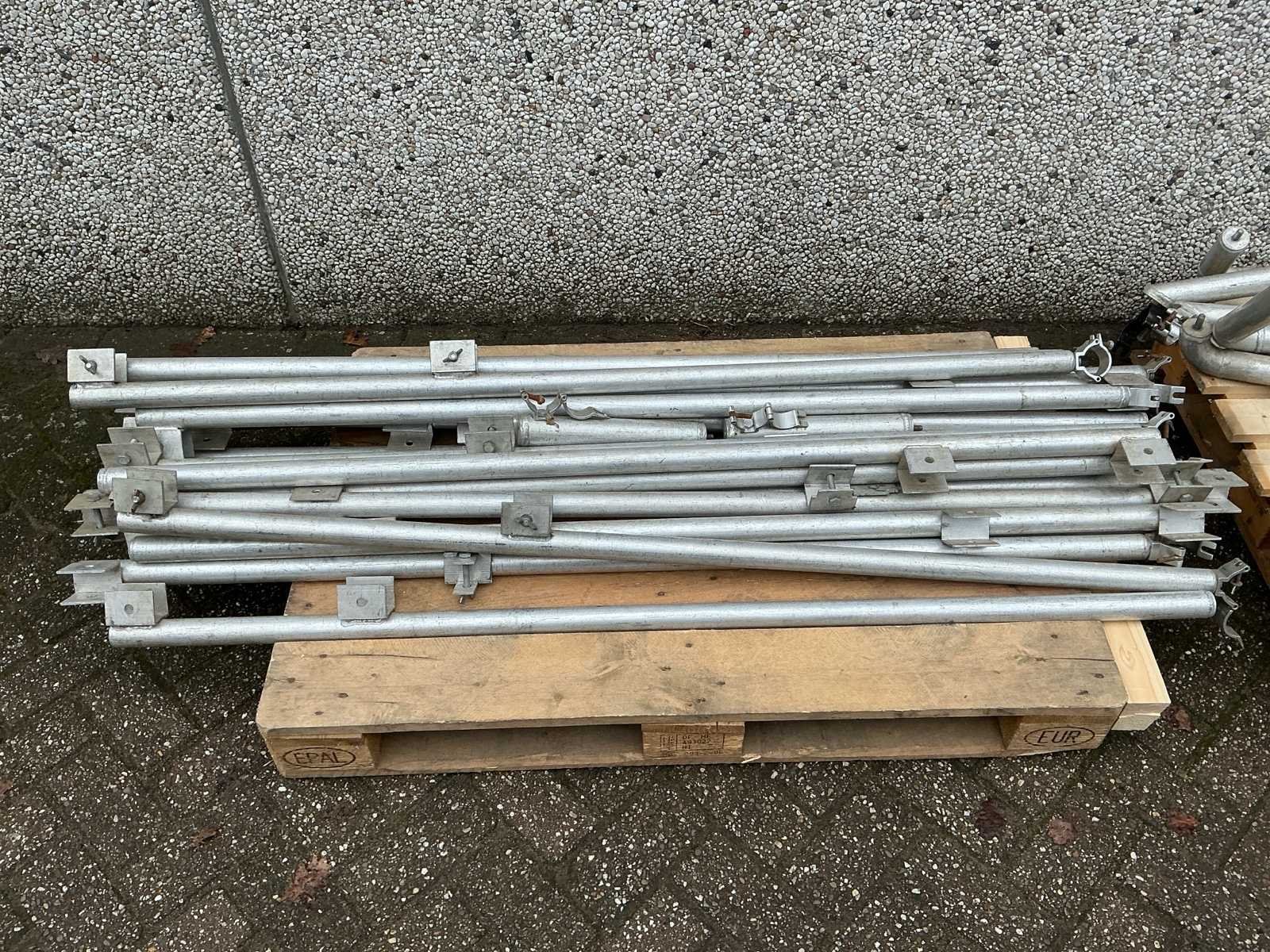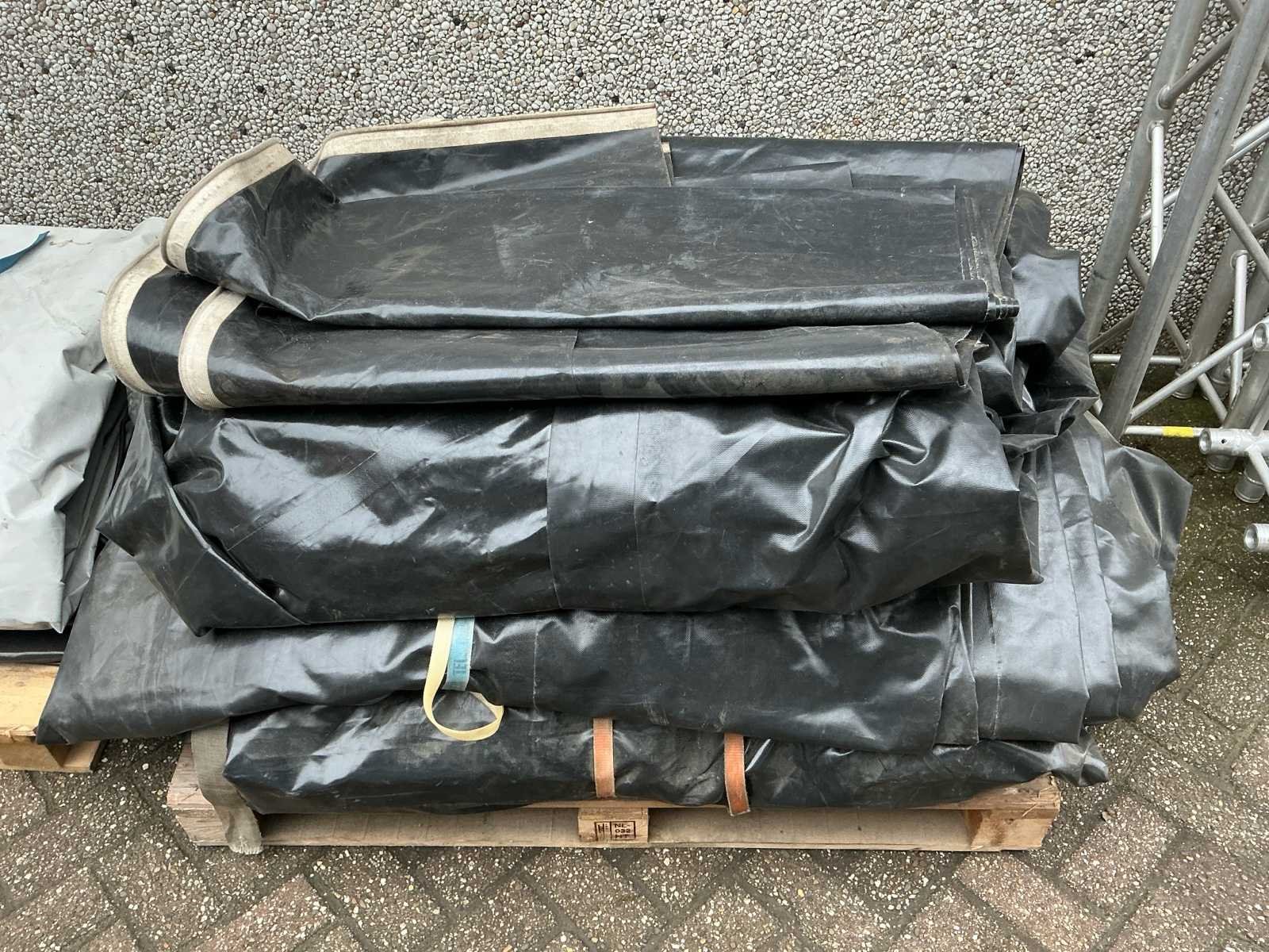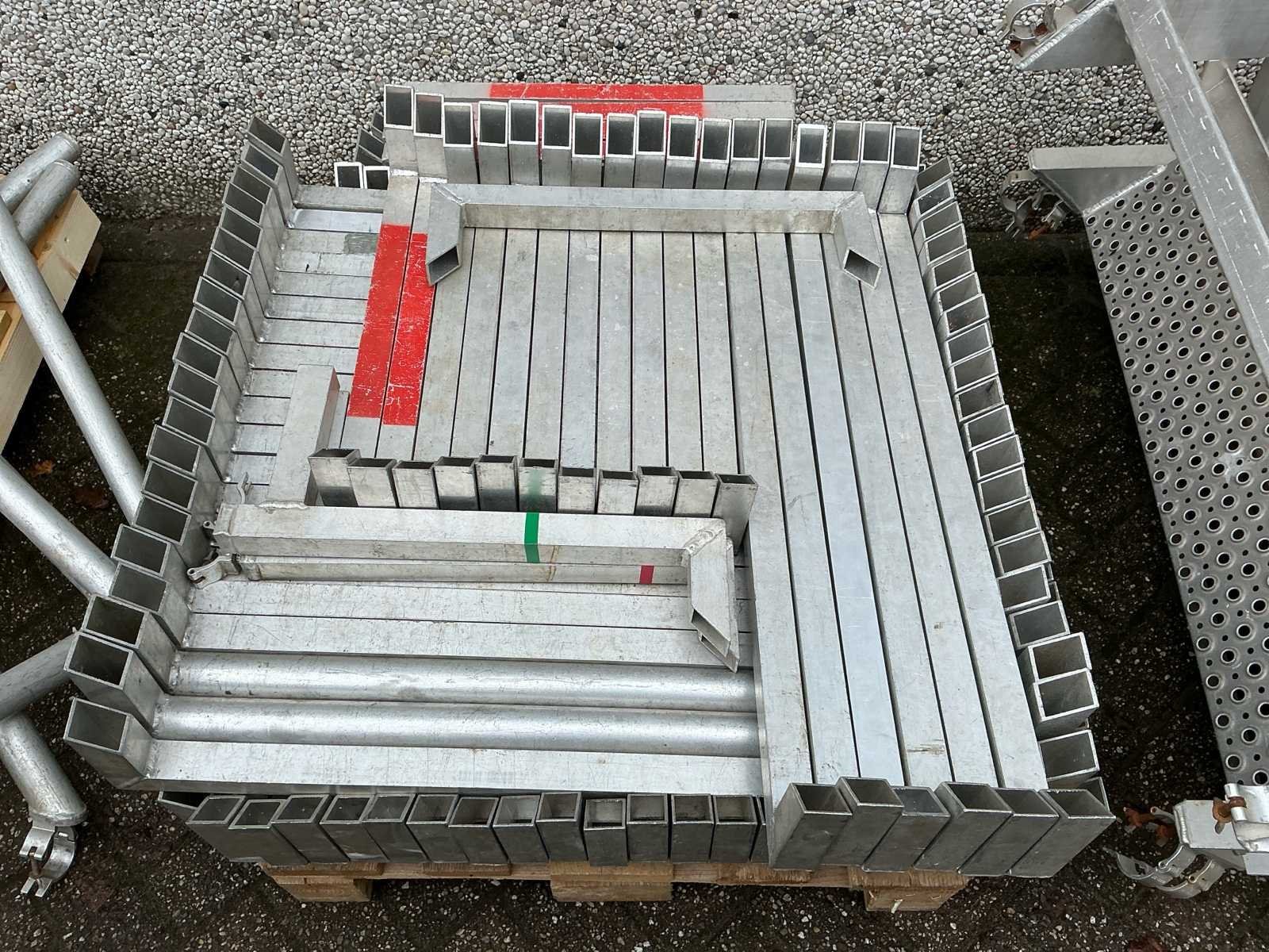 Voorzien van: opbergrekken, verhoogde vloer (100cm hoog), 2x trap, complete railing, 4x truss tower met lier voor dak omhoog te hijsen, 6x Truss (5 meter), 6x Truss ( 2,5 meter), 4x T-stuk, 1 x kruisstuk, 2x zeilenpakket, 28x vloerdeel (2,5m x 1m), 4x vloerdeel (67cm x 250cm), 4 passtuk, diverse koppelstukken vloer, complete set voor opbouwen podium Nee Merk: Global Truss Type: Aluminium Opbouw Aluminium poten lengte: 1000mm Totale afmeting L: 11000mm Totale afmeting Breedte: 7000mm Totale afmeting Hoogte: 5500mm