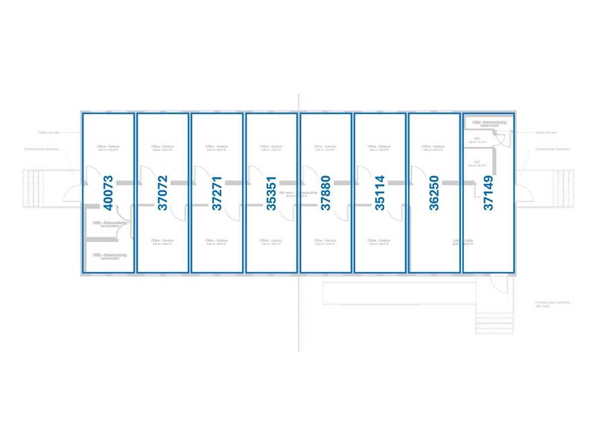 Zie complete omschrijving/ kavel specificatie bij bestanden! Betreft geschakelde kantoorunit set van 8 units, zie opstelling bij foto’s Afmeting per unit Lengte: ca. 9030 mm Breedte: ca. 2970 mm Hoogte: ca. 3200 mm Voorzien van dubbelglas; isolatie ca. 14 cm; Betreft units met serienummer: 40073 (40076) 37072 37271 35351 37880 35114 36250 37149 Nee Totale afmeting L: 9030mm Totale afmeting Breedte: 2970mm Totale afmeting Hoogte: 3200mm