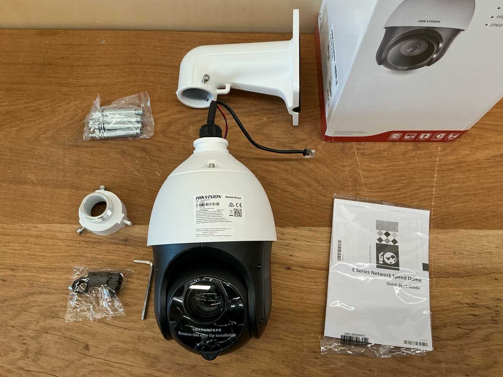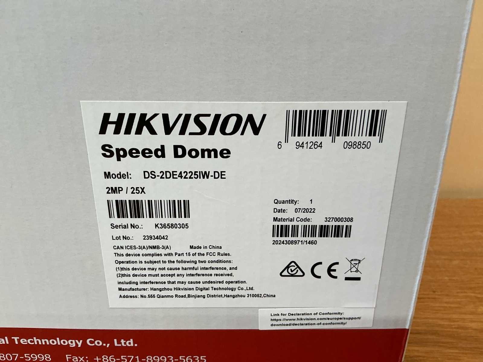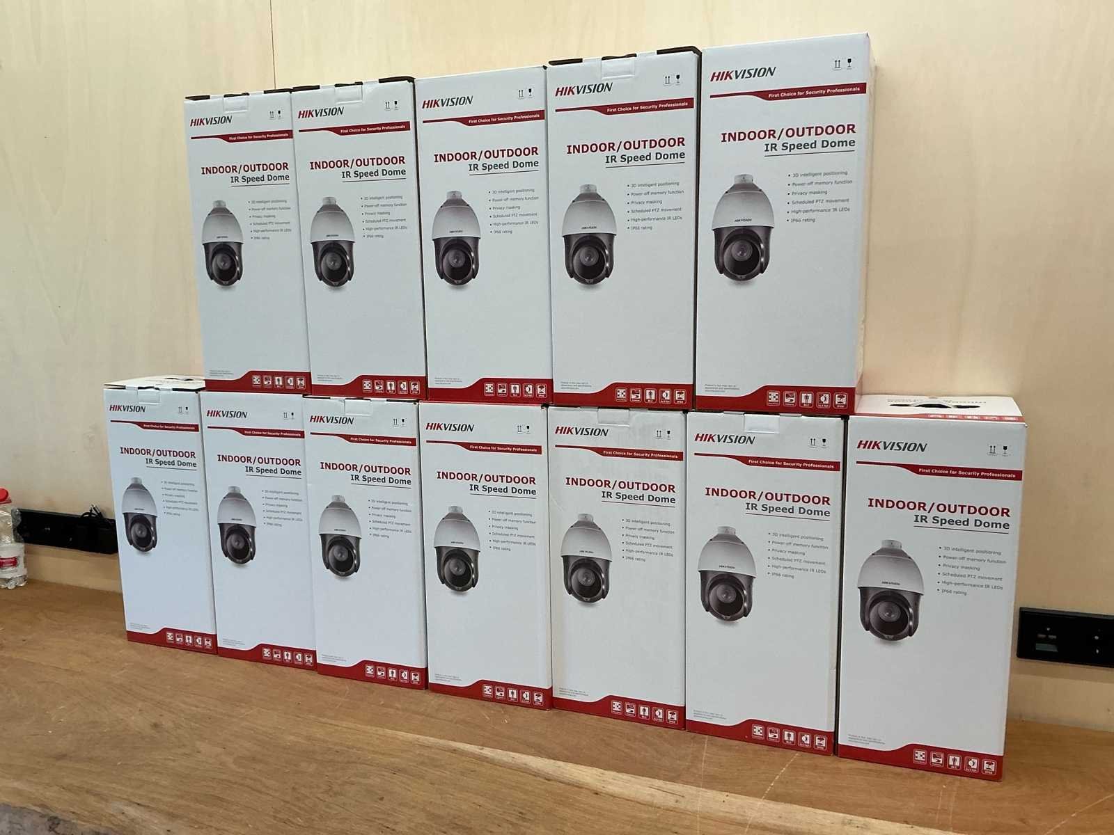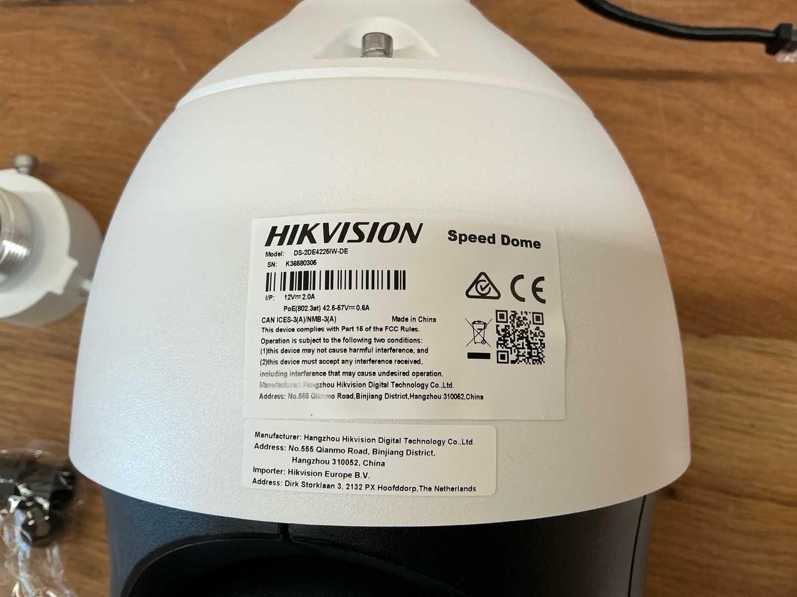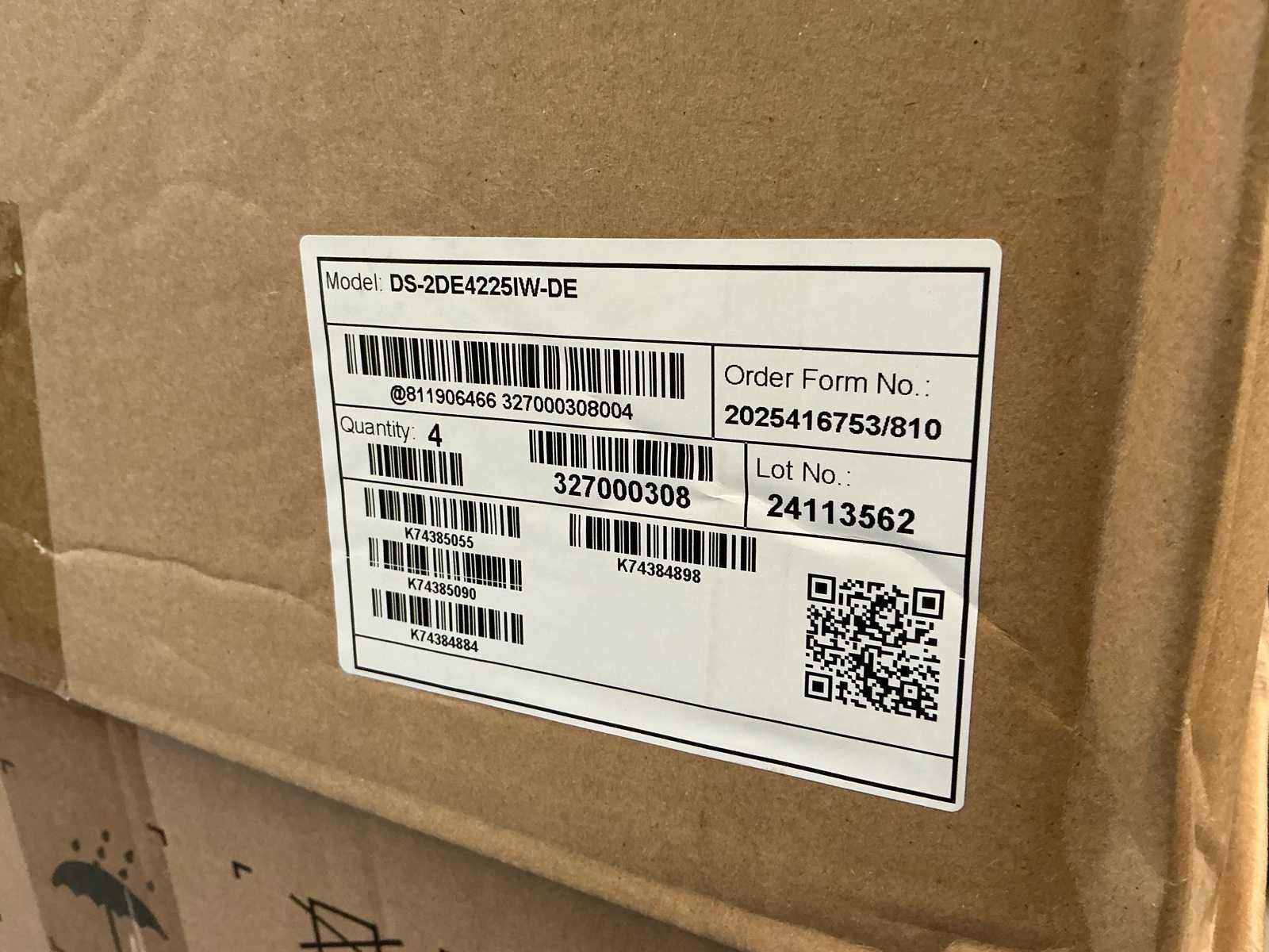 Partij a 48 stuks nieuwe / ongebruikte Hikvision DS-2DE4225IW-DE beveiligingscamera’s. Per stuk verpakt in doos. Per 4 dozen verpakt in 1 omdoos (46 x 46 x 54cm). 12 dozen totaal. Inhoud per stukverpakking: Camera Montagebeugels Montagemateriaal Handleiding Specificaties: Voedingstype: Ethernet / netstroom Soort: IP-beveiligingscamera Ondersteuning voor plaatsing: Binnen en Buiten Connectiviteitstechnologie: Bedraad Ethernet Wifi: Nee Montagewijze: Plafond/muur Kleur van het product: Wit Vormfactor: Dome Resolutie: 1920 x 1080 pixels PTZ functies: 360° PAN bereik Kijkhoek lens, horizontaal: 57.6° Kijkhoek lens, verticaal: 34.4° Kijkhoek lens, diagonaal: 64.5° Type beeldsensor: CMOS Omvang optische sensor: 25,4 / 2,8 mm (1 / 2.8") Optische zoom: 25x Digitale zoom: 16x Brandpuntbereik: 4.8 - 120 mm Infrarood: Ja, tot 100 meter Inclusief recorder: Nee Opslaglocatie extern: SD Weerbestendig: Ja (IP66) Hoogte: 29 cm No Merk: Hikvision Model: DS-2DE4225IW-DE Kleur: Wit Hoogte: 29cm