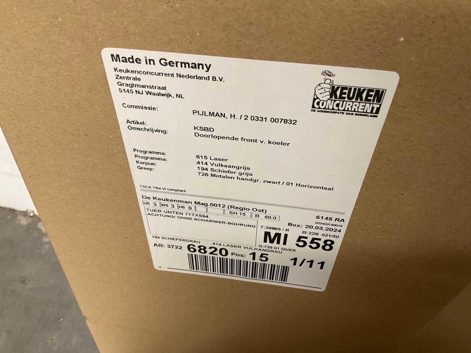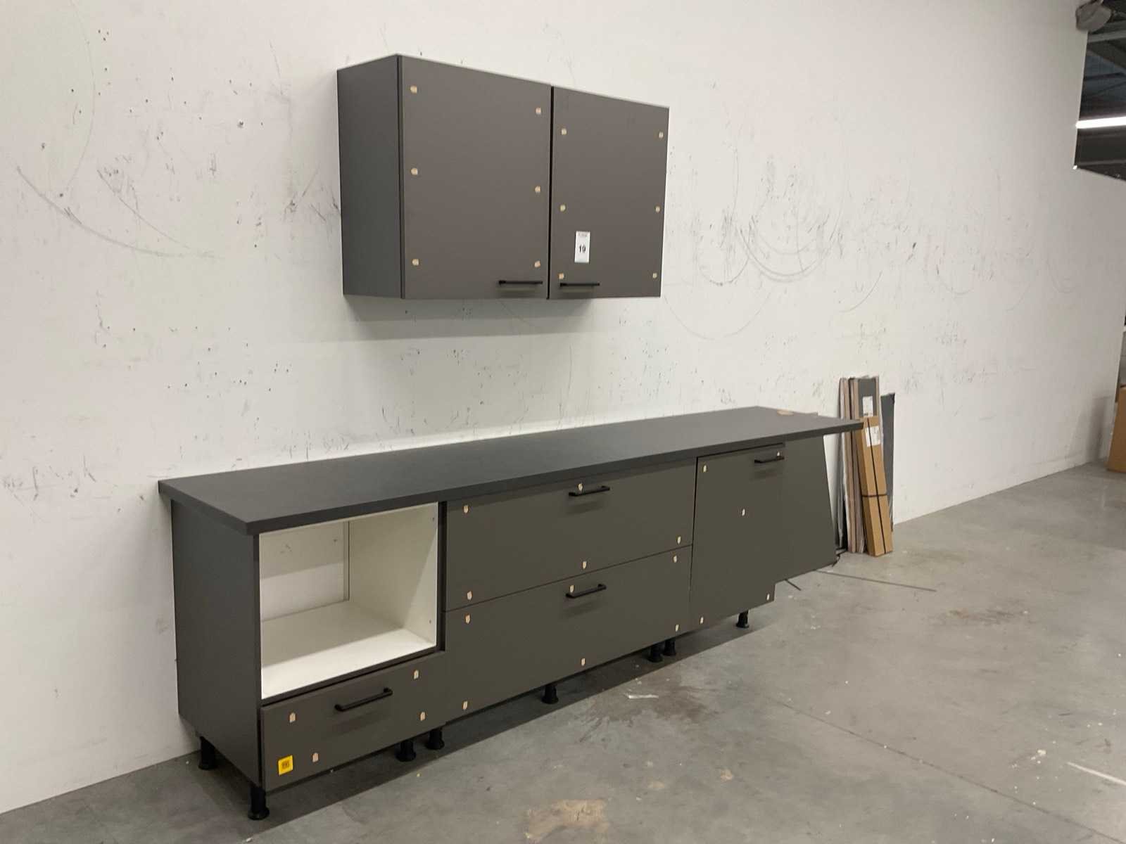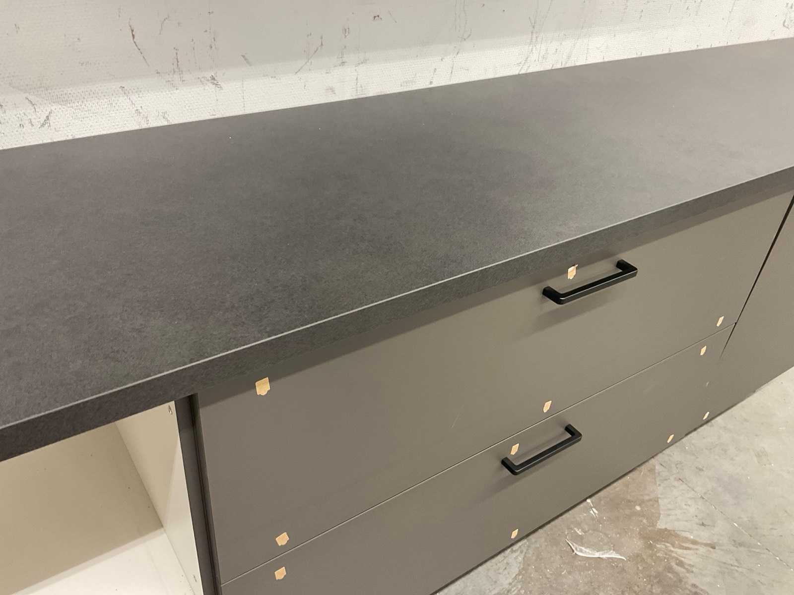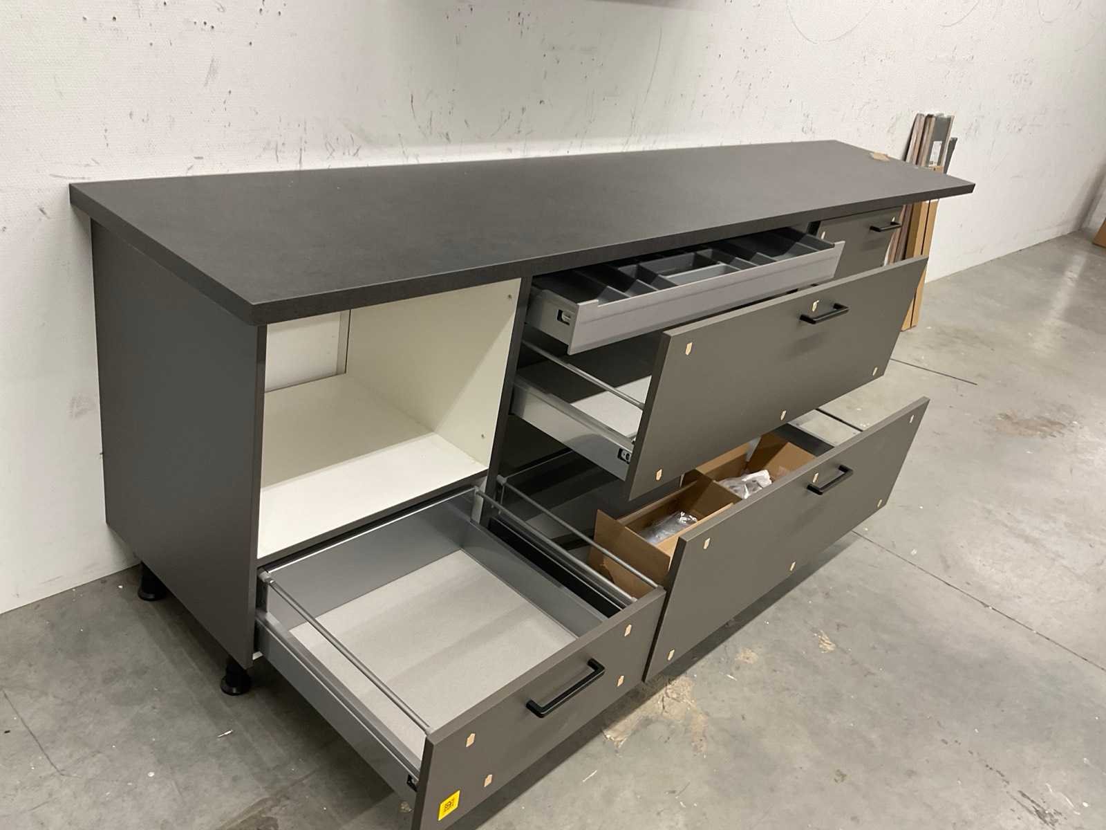 Indeling: 2 onderkasten; 1 ladenkast met binnenlade; deurfront voor onderbouwkoelkast; 2 bovenkasten; reeds gedemonteerd en ingepakt op pallets; werkbladen, plinten en hoge kasten niet ingepakt Nee Lengte: 305cm Kraan: geen Werkblad hoogte: 91cm Aanrechtblad: met hardkunststof toplaag kleur grey Hoofdkleur: taupe dark
