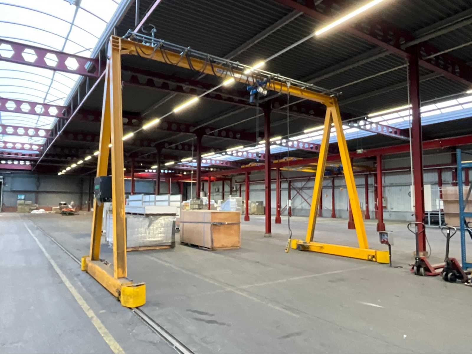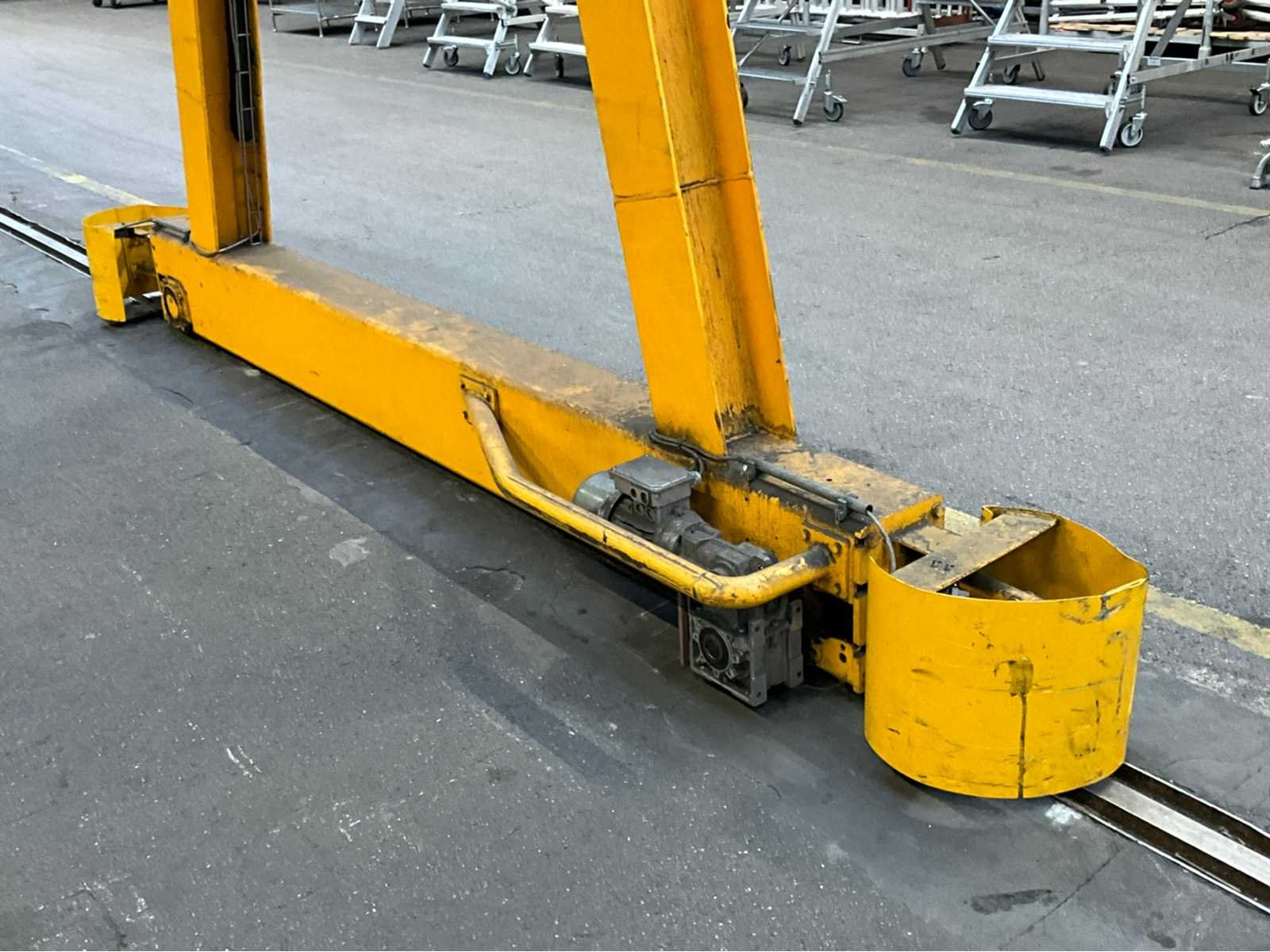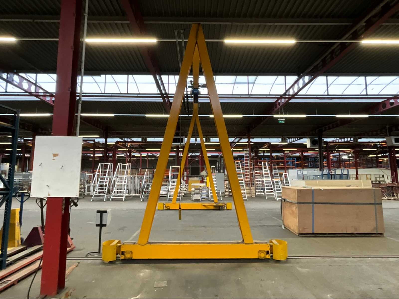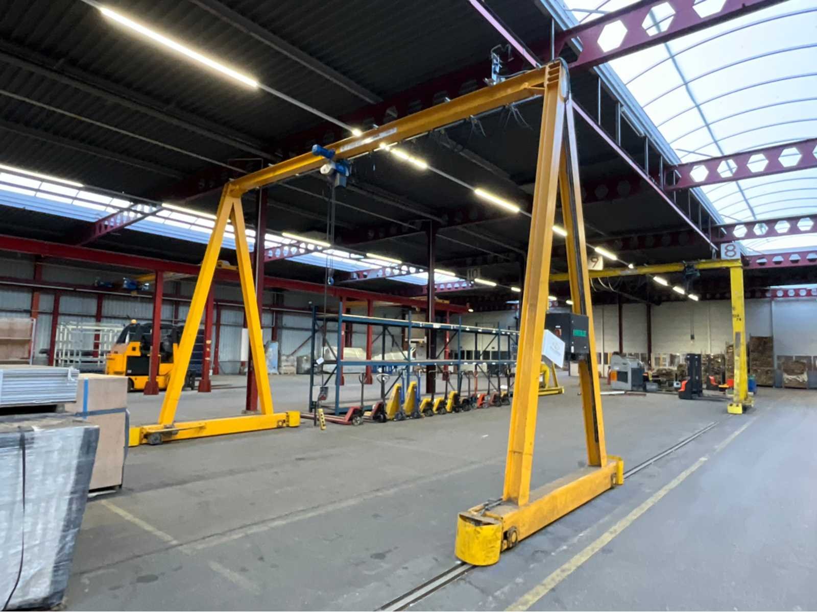 Zelfrijdende portaalkraan; demontabel (geschroefd); rijdend over spoor; zonder spoor; voorzien van Abus (Bj. 2012) elektrisch rijdende kettingtakel capaciteit 1000 Kg; draadbediend; voorzien van aanrijdbeveiliging; breedte over de sporen 7050 mm; wiel afstand 2700 mm; elektro schakelkast; kraanboek; Nee Merk: Norden / Verlinde Bouwjaar: 2015 Serienummer: 524-77 Overspanning: 6700m Hijsvermogen: 1000kg Max. hijshoogte: 4000m Zelfrijdend: true Met kraanboek: true Aansluiting: 400V Totale afmeting L: 7400mm Totale afmeting Breedte: 3800mm Totale afmeting Hoogte: 4300mm