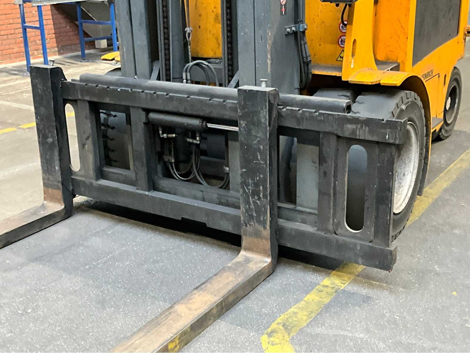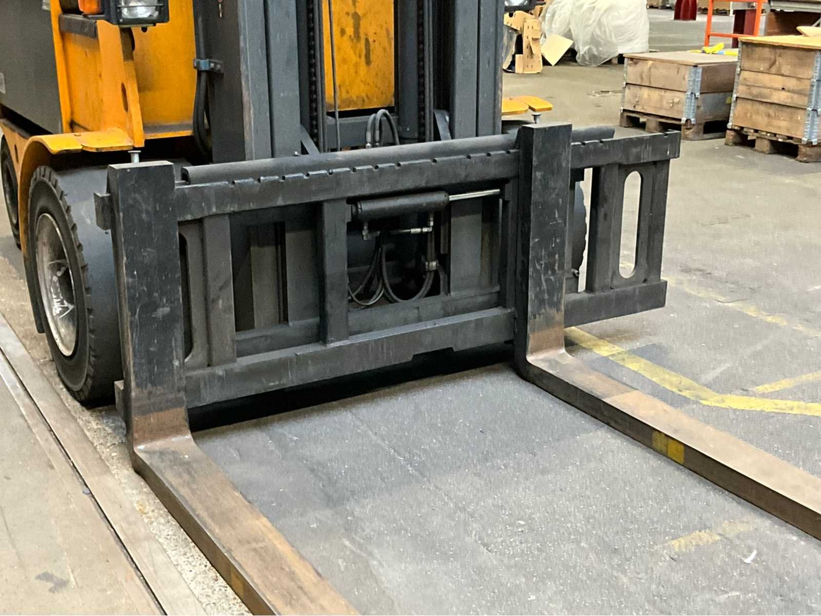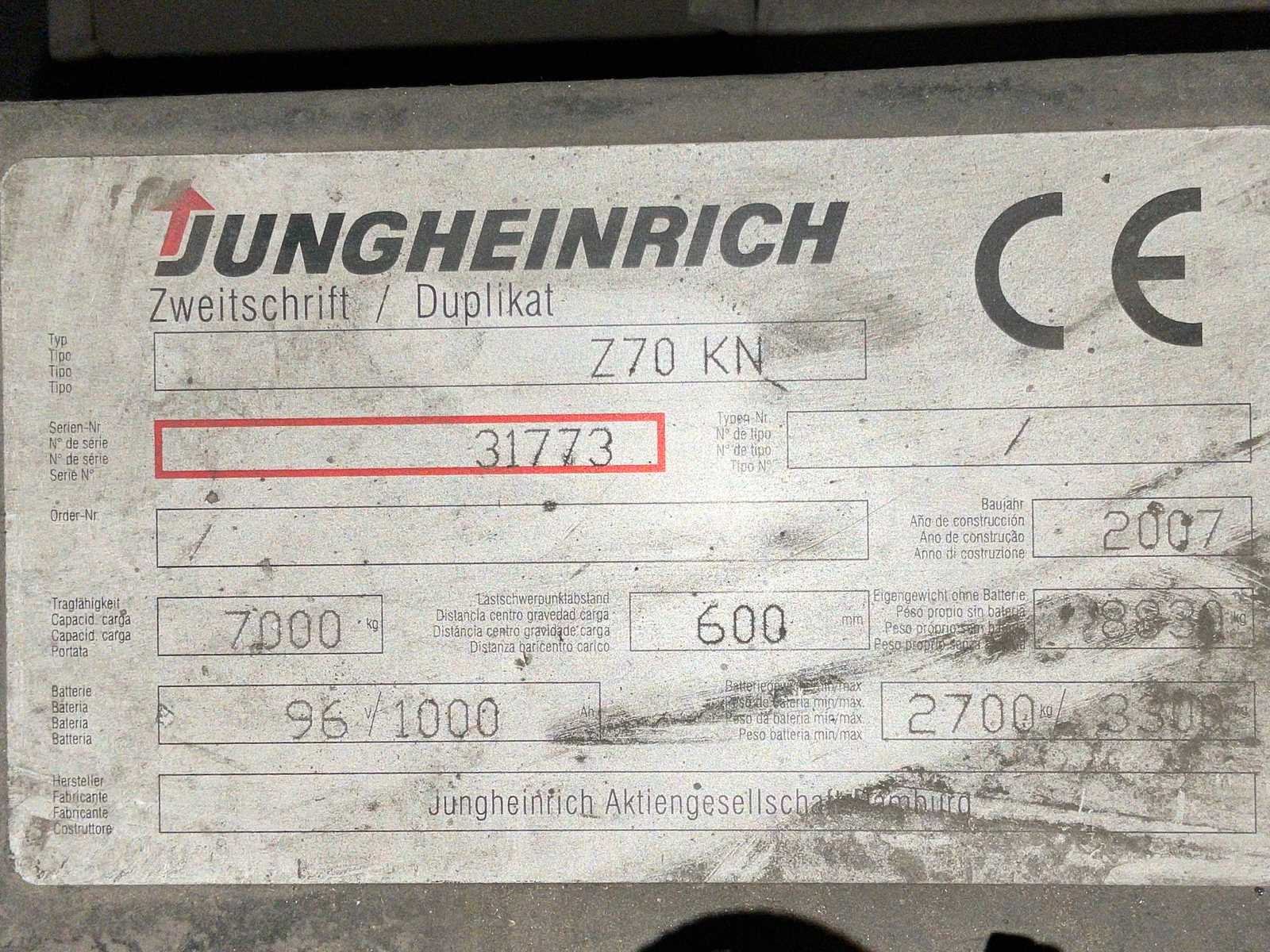 Maximale breedte over de vorken 1980 mm; vorkbreedte 150 mm; mast voorzien van neigcilinders; dubbele wielen vooraan; werkverlichting; rijverlichting; signalisatie lamp; inclusief acculader 96 - 400 Volt; 100 Ampère; Nee Merk: Jungheinrich Type: Z70KN Bouwjaar: 2007 Serienummer: 31773 Brandstof: Elektrisch Mast: Triple Soort band: Volrubber banden Aantal wielen: 4 Afgelezen urenstand: 8480 Side-shift: true Triple mast: true Eigen gewicht: 12100kg Hefvermogen: 7000kg Lepellengte: 2600mm Max. hefhoogte: 5400mm Totale afmeting L: 5700mm Totale afmeting Breedte: 1850mm Totale afmeting Hoogte: 2750mm