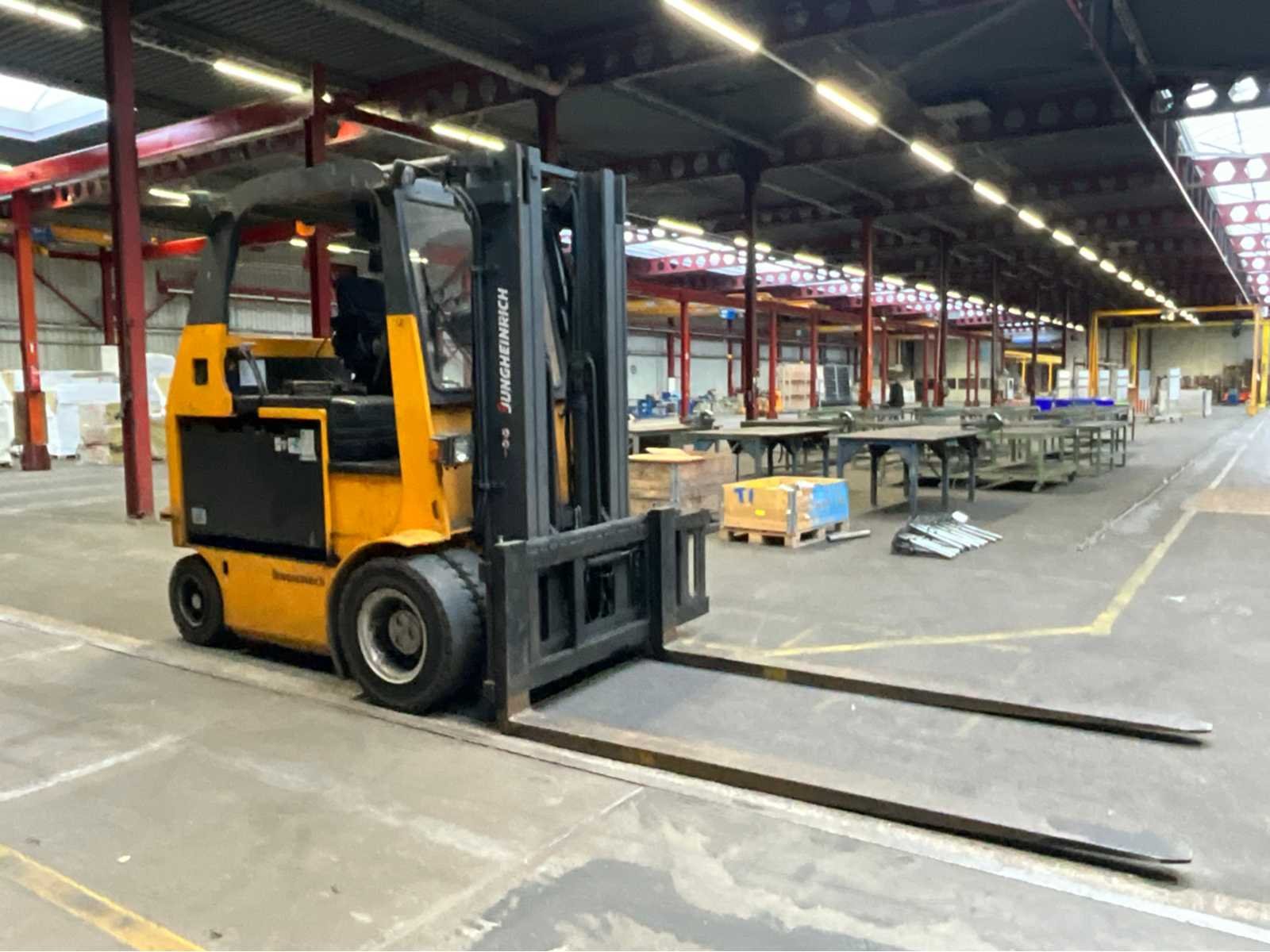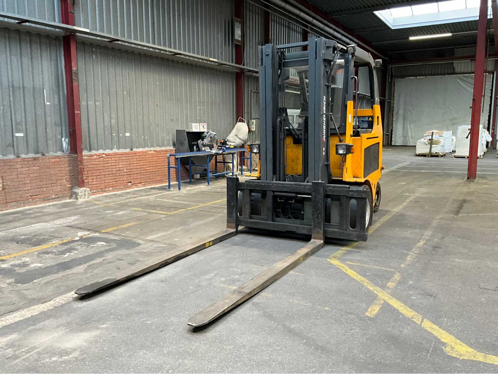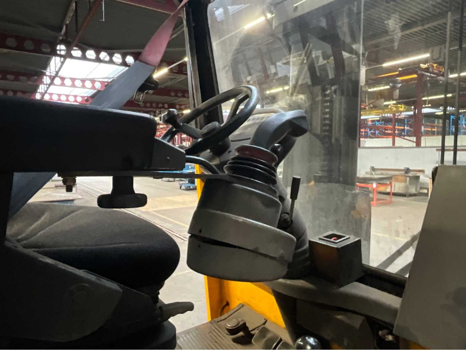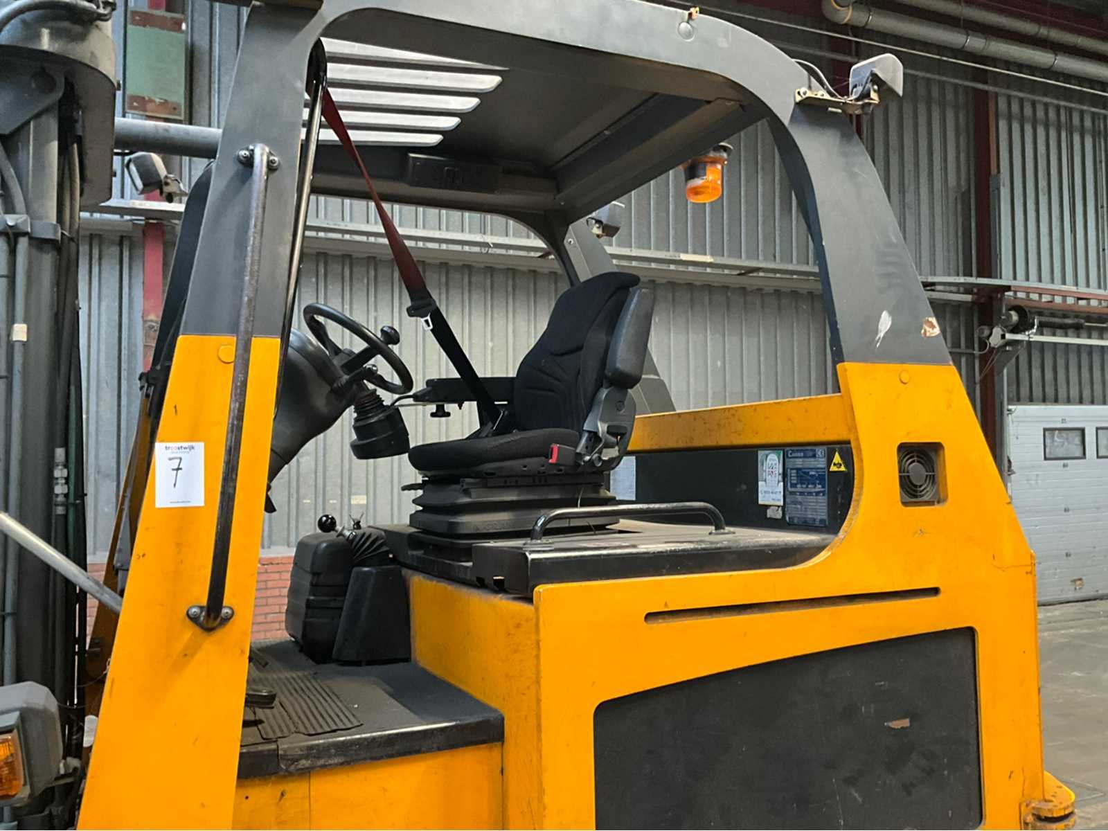 Maximale breedte over de vorken 1980 mm; vorkbreedte 150 mm; mast voorzien van neigcilinders; dubbele wielen vooraan; werkverlichting; rijverlichting; signalisatie lamp; inclusief acculader 96 - 400 Volt; 100 Ampère; Nee Merk: Jungheinrich Type: Z70KN Bouwjaar: 2007 Serienummer: 31773 Brandstof: Elektrisch Mast: Triple Soort band: Volrubber banden Aantal wielen: 4 Afgelezen urenstand: 8480 Side-shift: true Triple mast: true Eigen gewicht: 12100kg Hefvermogen: 7000kg Lepellengte: 2600mm Max. hefhoogte: 5400mm Totale afmeting L: 5700mm Totale afmeting Breedte: 1850mm Totale afmeting Hoogte: 2750mm