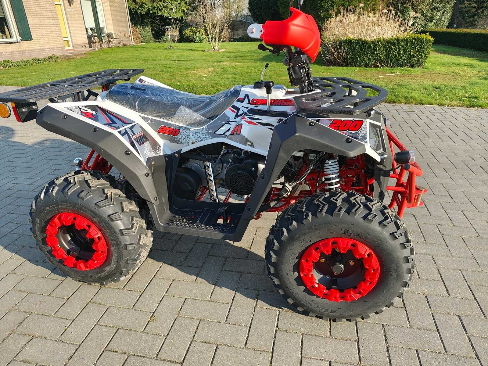 Ongebruikt AIII Commander 200CC Quad, Motortype: 200 CC, FNR, CVT, eencilinder, oliekoeling. Carburateur: PD24. Rijden: #530 kettingaandrijving. Ontsteking: Elektrische start. Maximum snelheid: 60 km/h. Tankinhoud: 6L/Staal. FR&RR Wielen: Fr: Stalen velg: 23×7-10" Rr: Stalen velg: 22×10-10" off-road banden. Snelheidsmeter: LCD-scherm. Schokdempers: hydraulische schokdempers. Rem: Fr &; Rr schijfrem. Stuur/Frame: Staal. Achterbrug: staal. Bagagerek: voor en achter (staal). Stuurbescherming: kunststof. Zithoogte: 79 cm. Draagvermogen: 150 kg. GW/ NW: 180 kg / 208 kg. Bodemvrijheid: 16 cm. Product afmetingen: 167 cm x 102 cm x 110 cm. Sleutel. LED dagrij verlichting. Trekoog voor. Trekhaak met 7-polige stekker 12V achter. wordt geleverd in doos. off road use Nee Merk: AIII Model: Commander 200 Gewicht: 180kg Aantal zitplaatsen: 2 Transmissie: Traploos Bouwjaar: 2025 Afgelezen kilometerstand: 0km Brandstof: benzine 4 takt Kleur omschrijving: rood/wit Carrosserie: staal Lengte: 167cm Breedte: 102cm Hoogte: 110cm