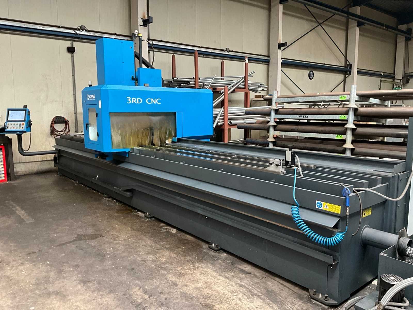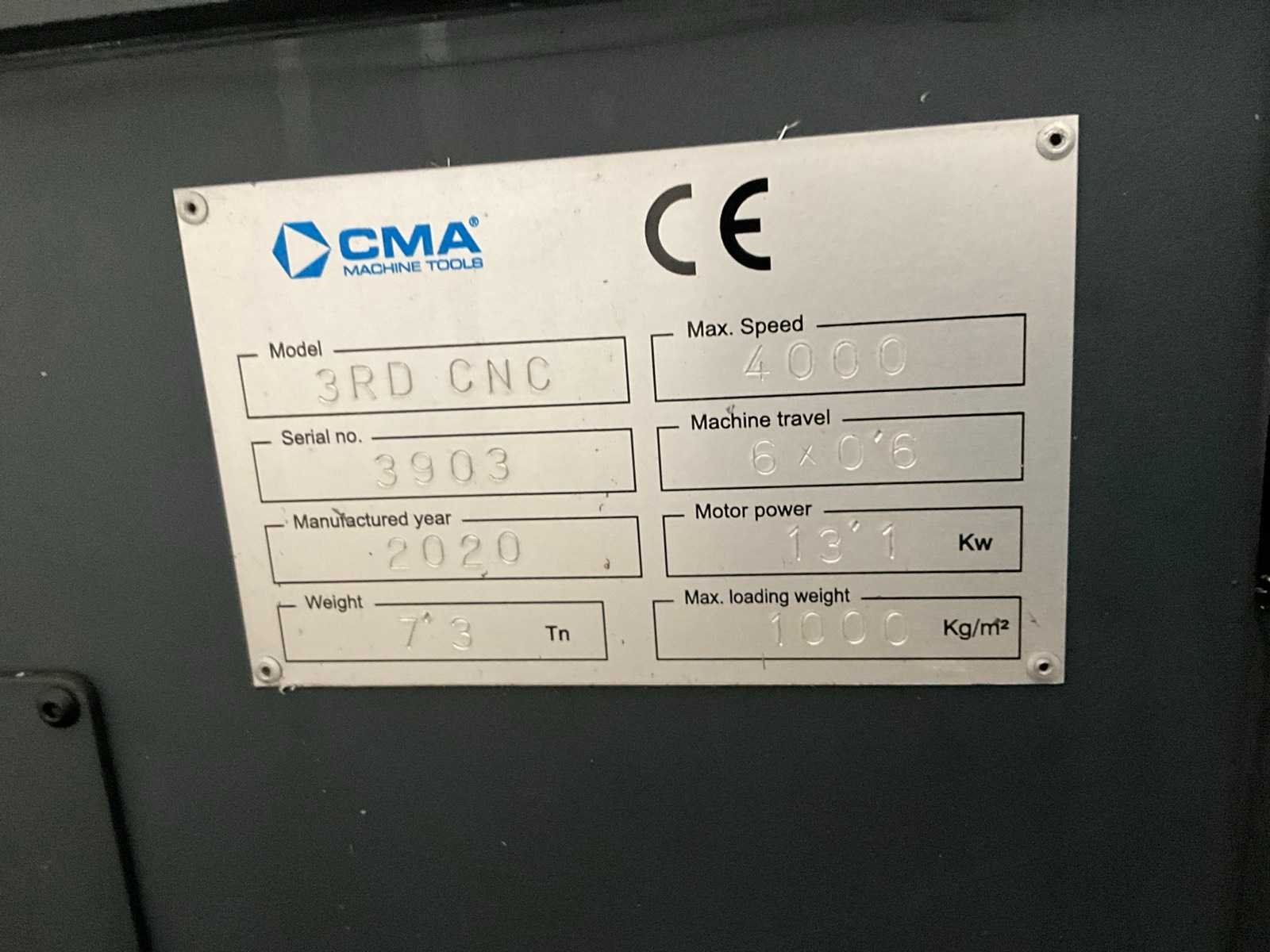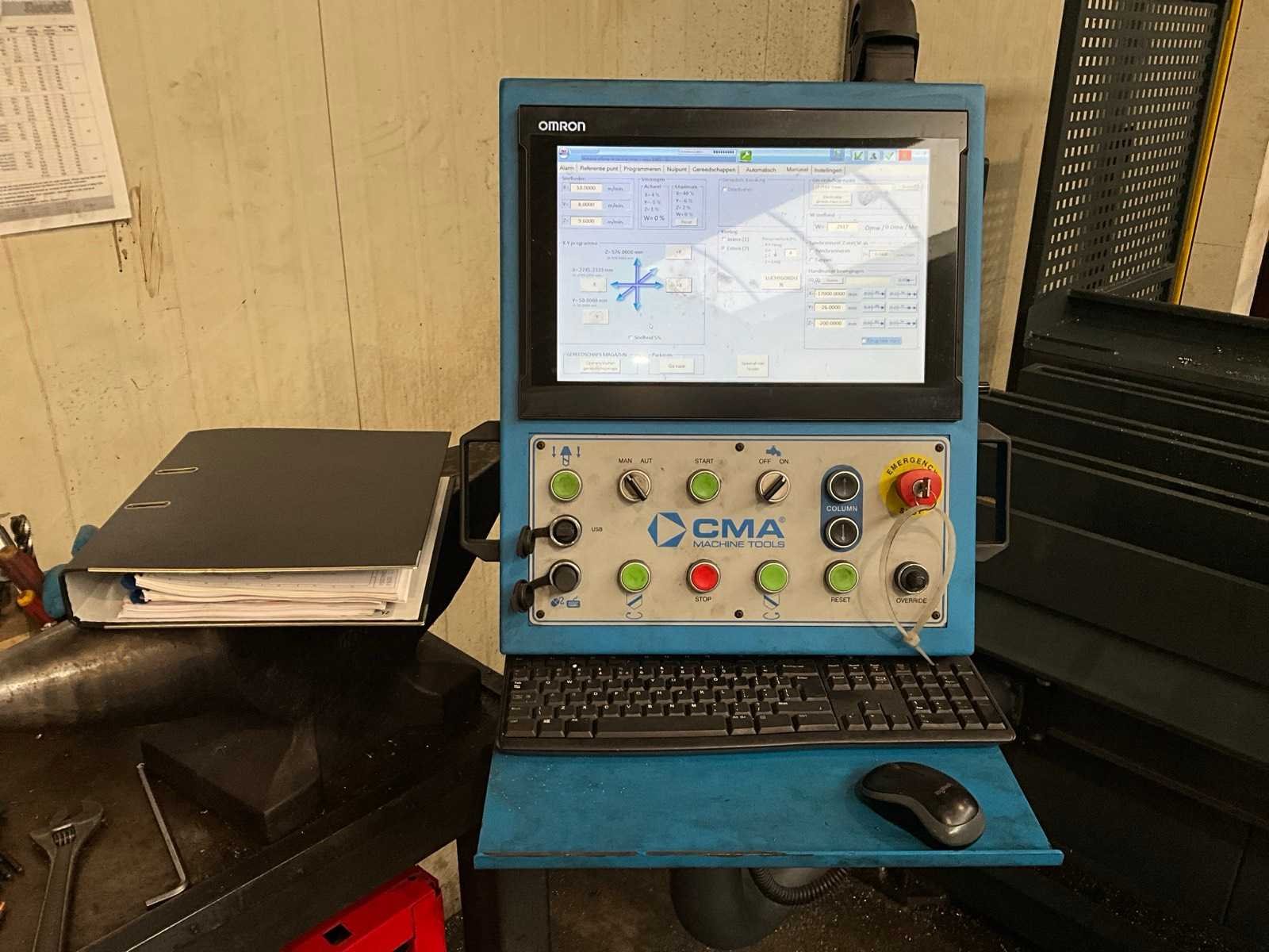 Boor cap. Ø 36 mm; v.v. “OMRON” touchscreen PC; automatische gereedschapswisselaar met 10-posities; laser-gebiedsdetector; schakelkast; incl. (4x) hydraulische machineklem en werkplaatskast met diverse toebehoren; handboeken aanwezig Nee Merk: CMA Type: 3RD CNC 6006 Bouwjaar: 2020 Serienummer: 3903 Verplaatsing x-as: 6000mm Verplaatsing y-as: 600mm Verplaatsing z-as: 450mm Opname iso: BT40 Snelheid van n =: 4000rpm Snelheid tot n =: 4000rpm T-gleuf opspantafelafmeting L: 6000mm T-gleuf opspantafelafmeting B: 580mm Koelmiddelpomp: true Spanentransporteur: true CNC-besturing, merk, type: OMRON Afgelezen urenstand: 788 Motorvermogen (kW): 13.1kW Aansluiting: 400V Machinegewicht: 7150kg