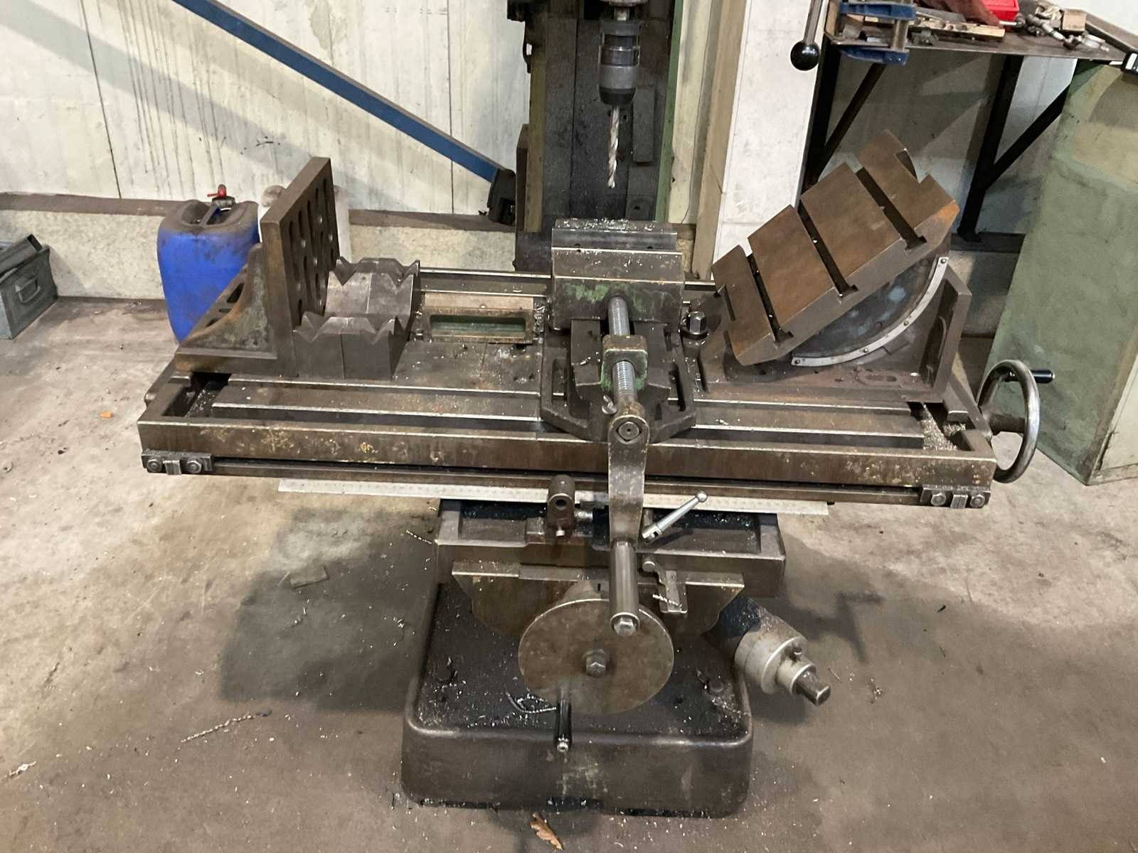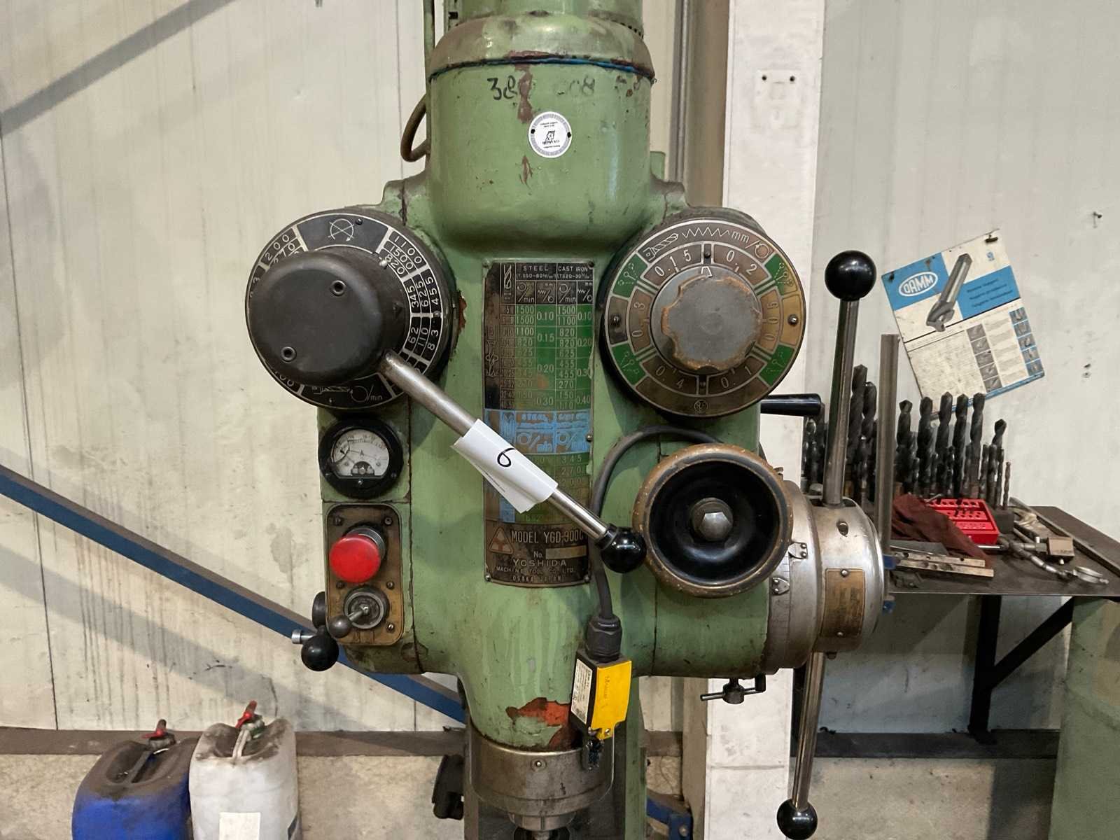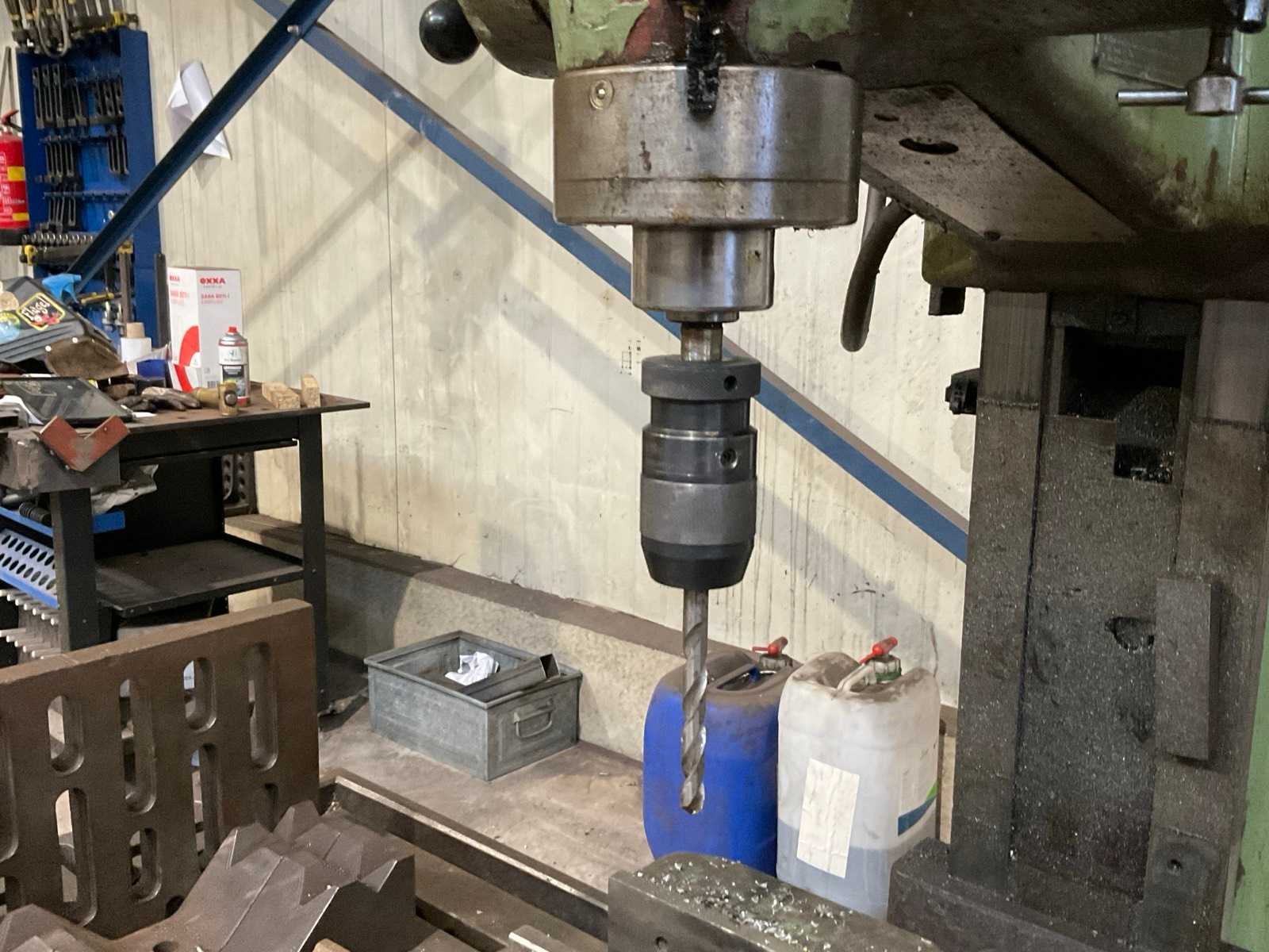 Boormachine met tap functie tot M24; tafelverplaatsing 220x300x600 mm; incl. kleminrichting; opspangereedschap en diverse boren Nee Merk: Yoshida Type: YGD-900CT Boorcapaciteit: 50mm Aantal snelheden: 24 Snelheid van n =: 8.3rpm Snelheid tot n =: 1500rpm Uitlading: 475mm T-gleuf opspantafelafmeting L: 600mm T-gleuf opspantafelafmeting B: 1150mm Motorvermogen (kW): 2.2kW Aansluiting: 400V Afmeting l: 1250mm Afmeting b: 1700mm Afmeting h: 2550mm