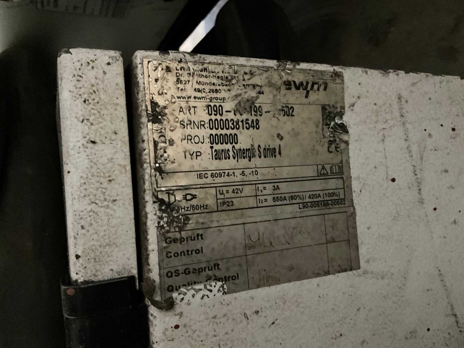 Voorzien van “EWM” Taurus Synergic S Drive 4 draadaanvoerunit, inschakelduur 550A 60% en 420A 100%; koffer met diverse lastoebehoren Nee Merk: EWM Type: Taurus 401 Synergic S FDW Serienummer: 0000383001 Inschakelduur: 100% Max. lasvermogen: 400A Aansluiting: 400V Digitale uitlezing: true Draadaanvoerunit: true Afmeting l: 1050mm Afmeting b: 460mm Afmeting h: 950mm