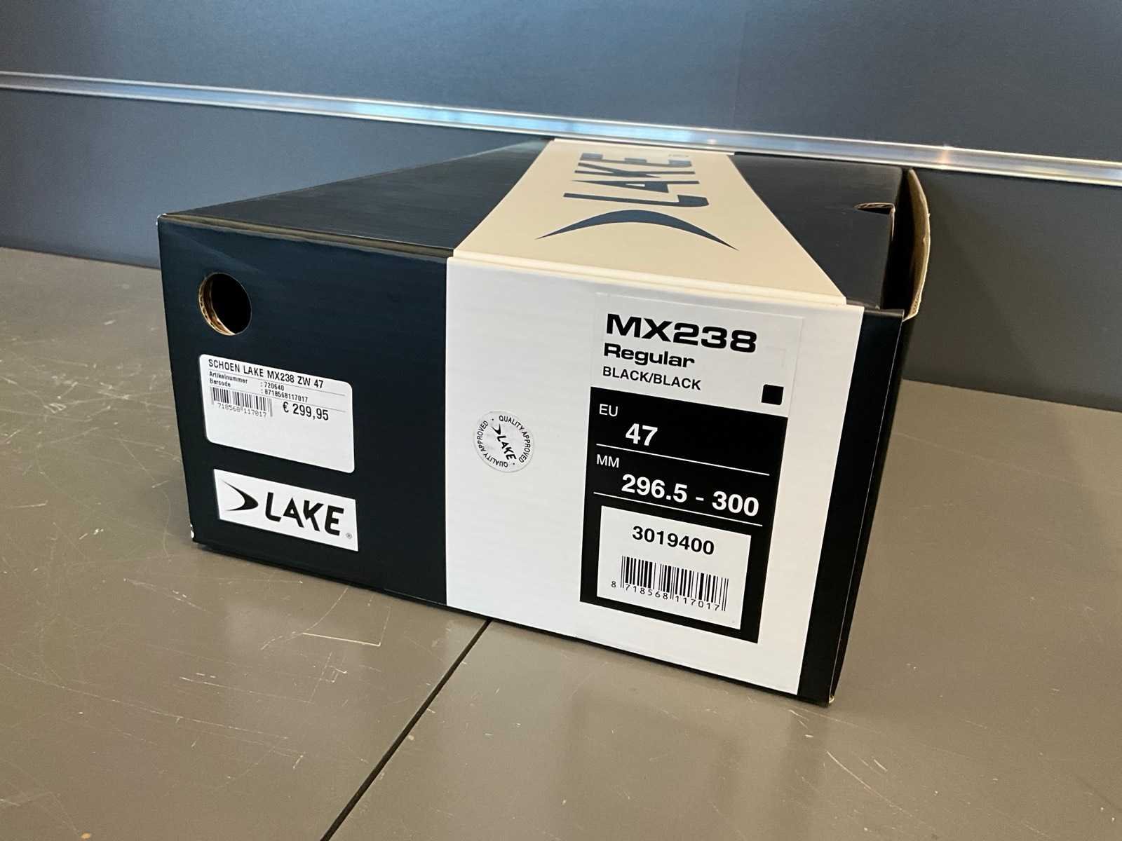 Voetlengte mm: 296.5 - 300 Nee Merk: Lake Product type: MX238 Regular Maat: 47 Bevesting schoenplaat: Nee Type sluiting: BOA dubbel Kleur: Black/Black