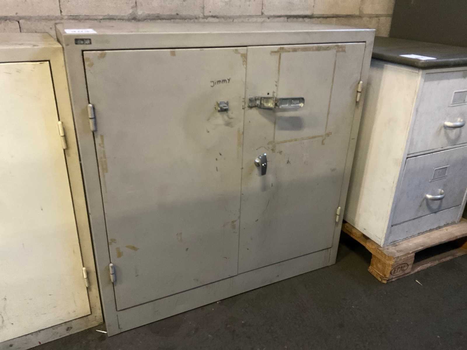 V.v. 2 legplanken, geen sleutel aanwezig. Nee Model: 2-deurs Lengte: 100cm Breedte: 40cm Hoogte: 100cm Materiaal: Staal