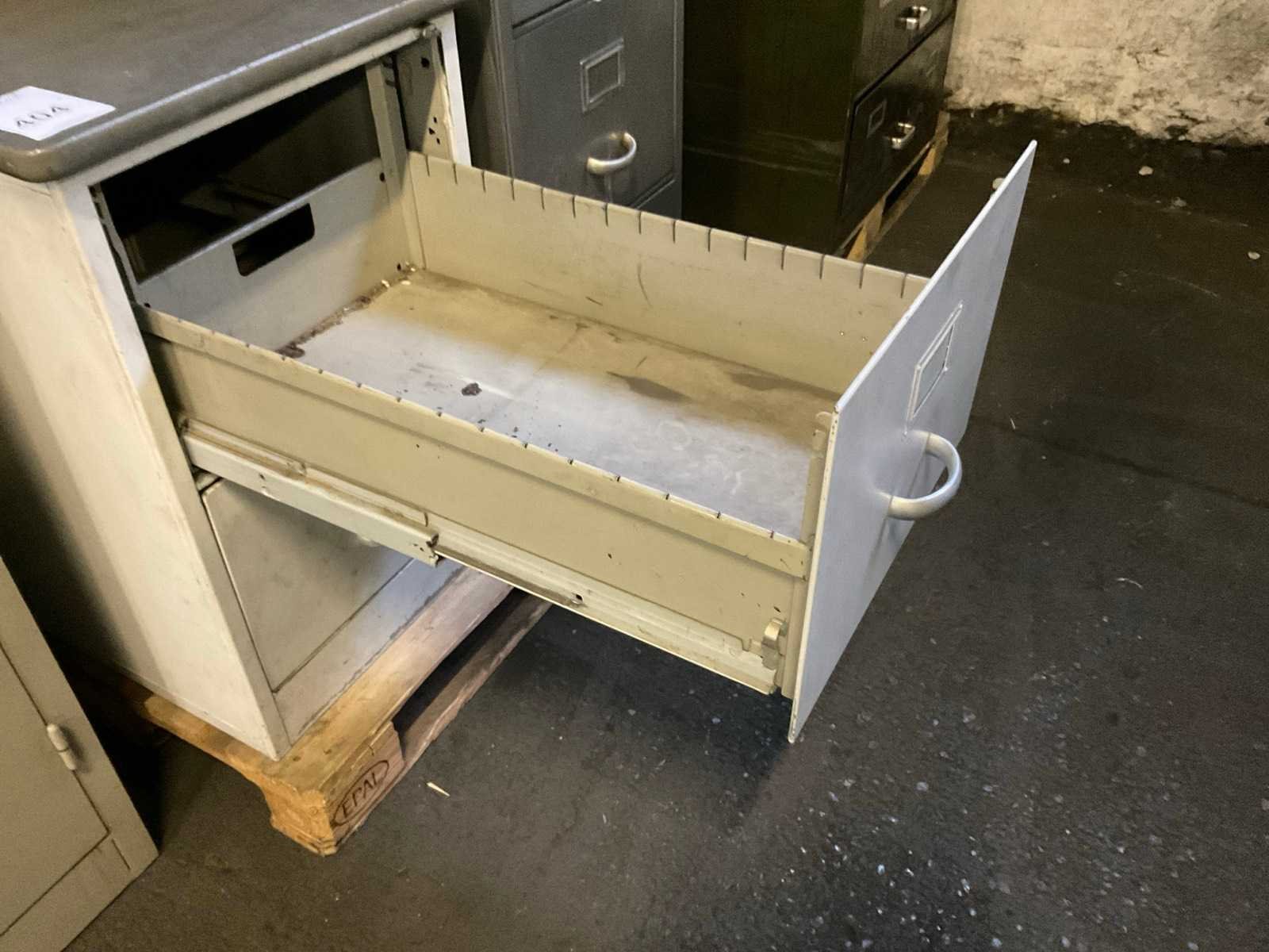 V.v. extra bovenblad, geen sleutel aanwezig. Nee Model: 2-lades Lengte: 70cm Breedte: 50cm Hoogte: 75cm Materiaal: Staal