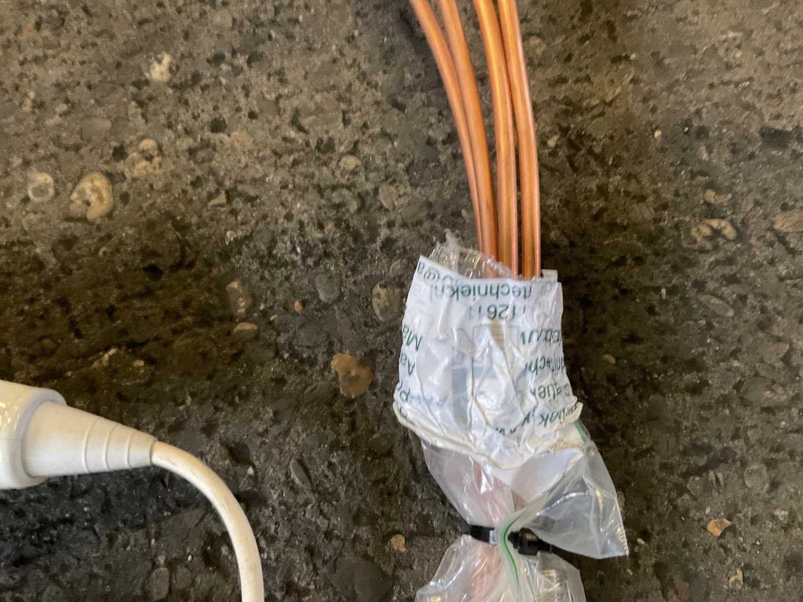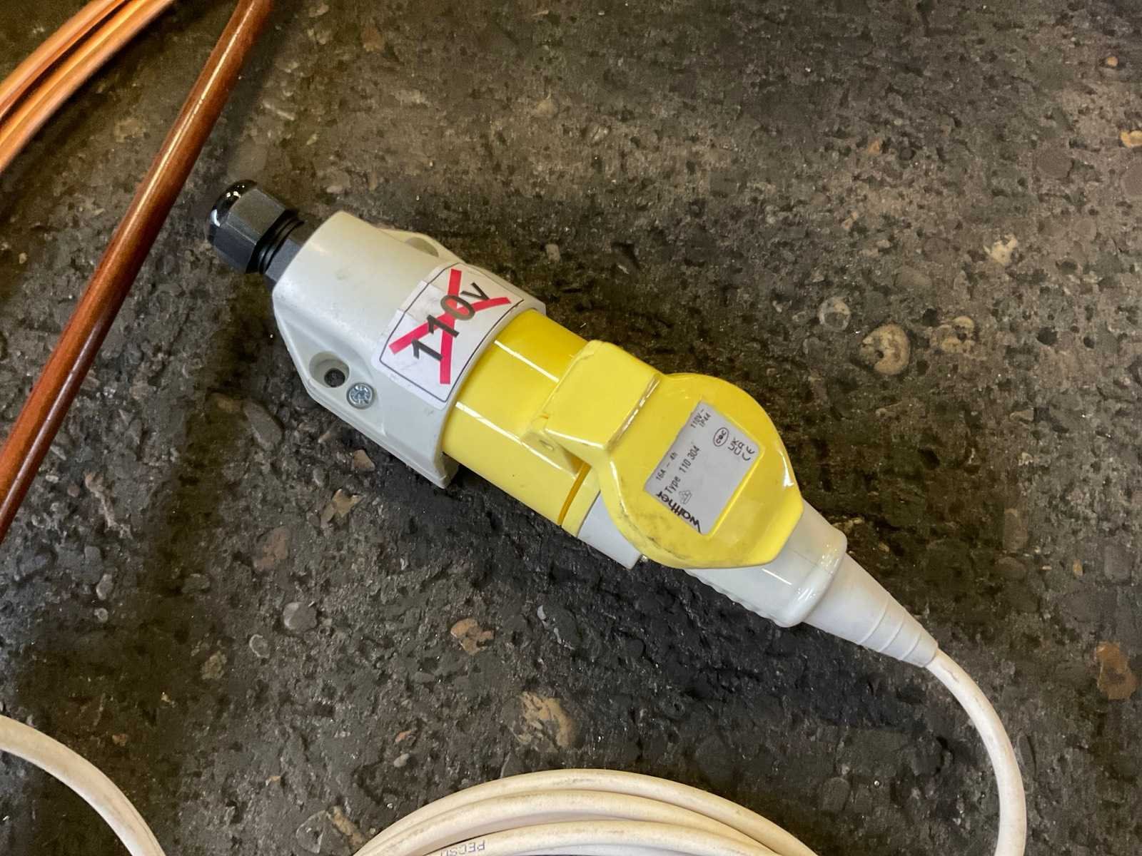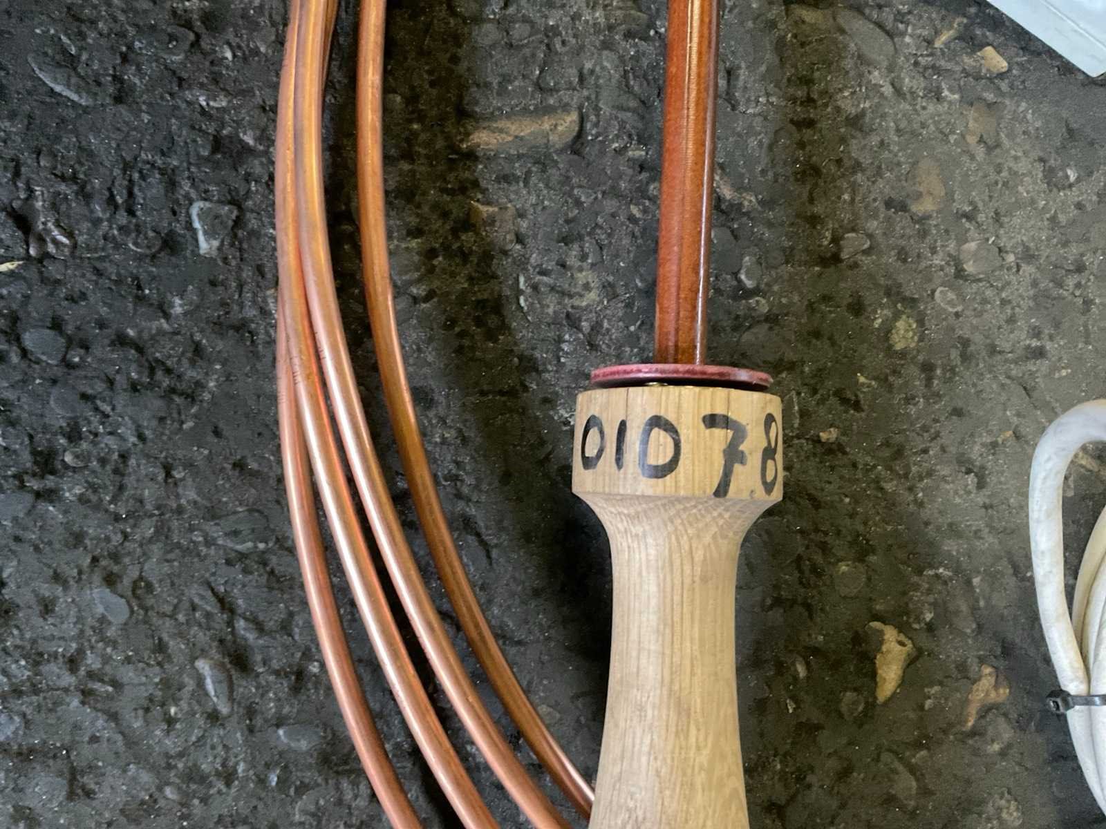 Pin met houten handvat v.v. stroom aansluiting, inclusief koperen leiding op rol, buitendiameter ca. 7mm. Nee Lengte: 98cm
