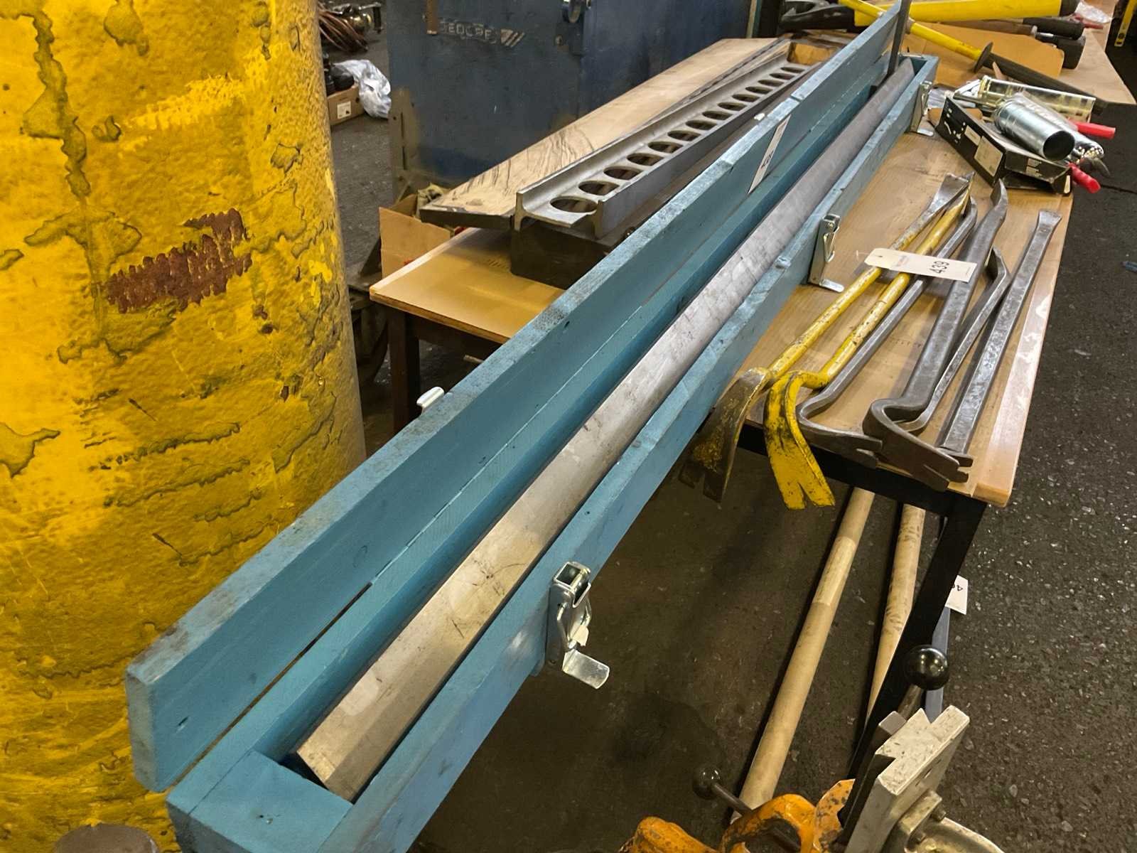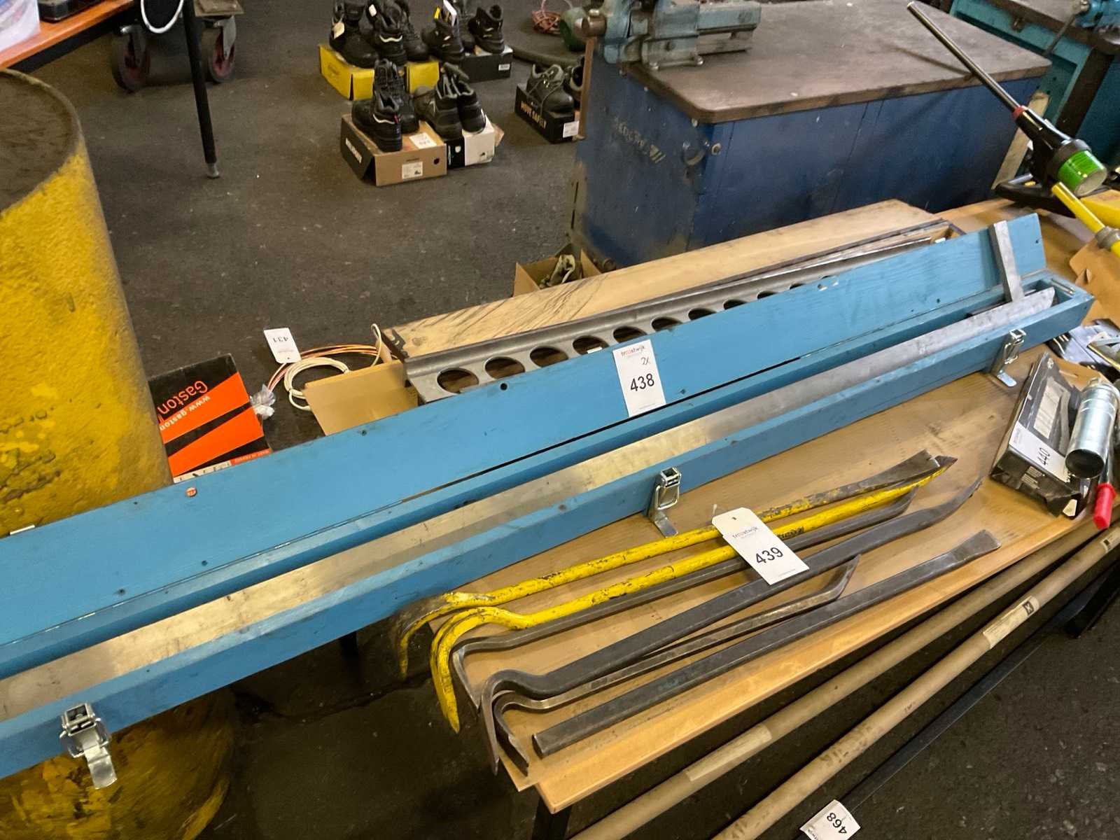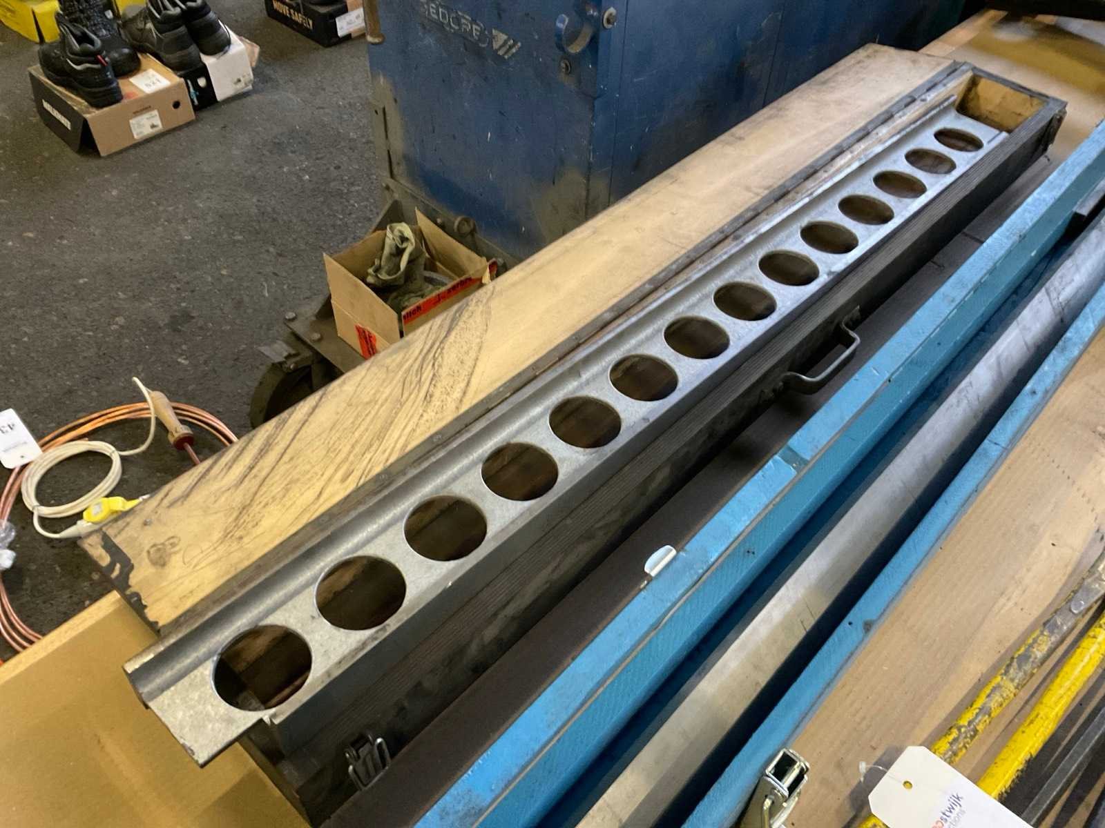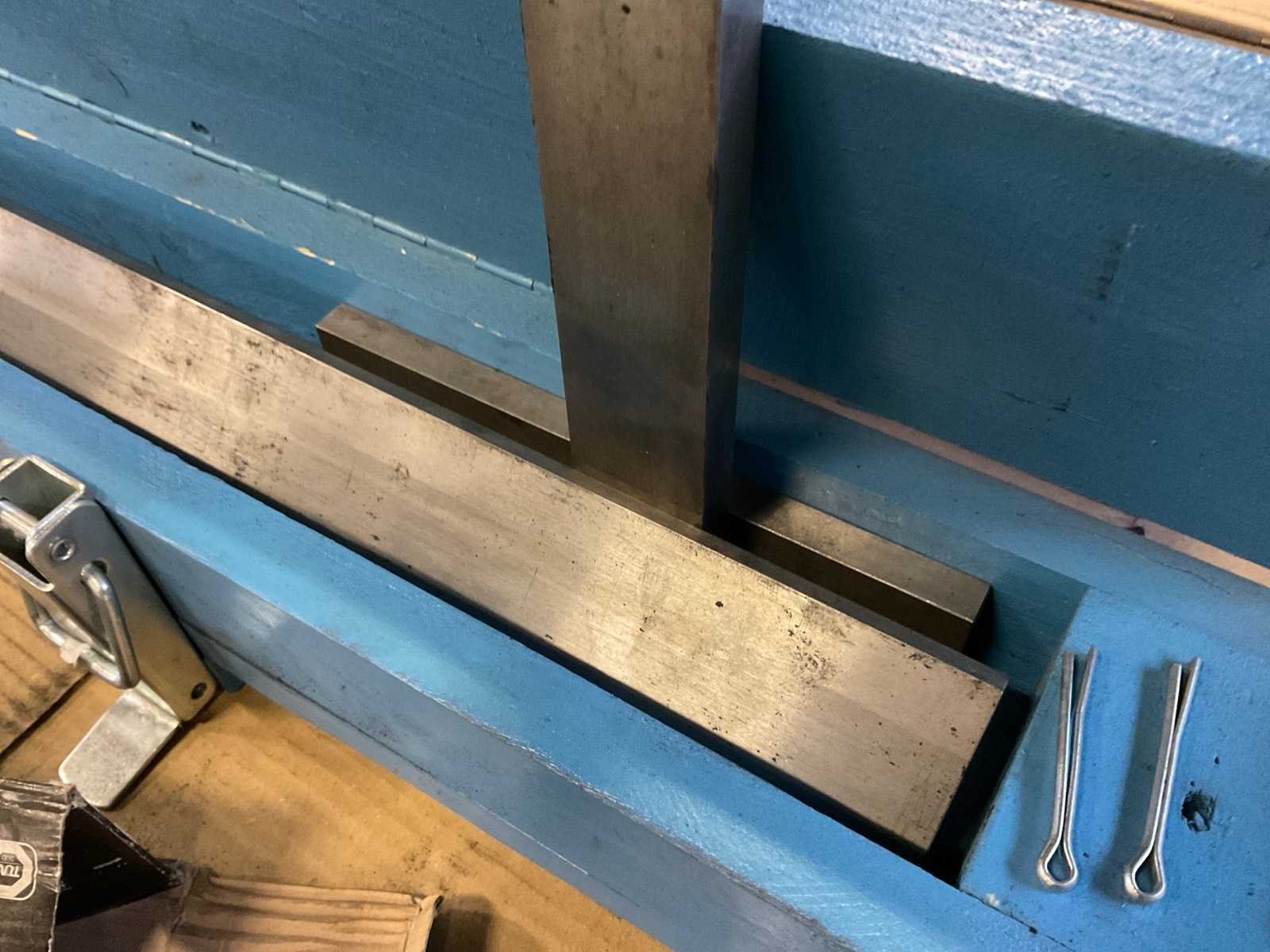1X verhoogde rei, ca. 120x10x5 cm en 1 vlakke rei, ca. 200x6x1 cm inclusief 2 hulp strips, beide in houten kist, geschikt voor uitlijnen van transportband vormzandmachine. Nee