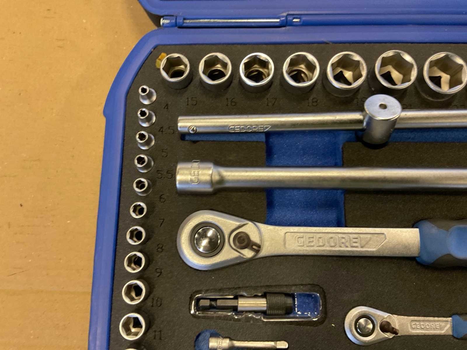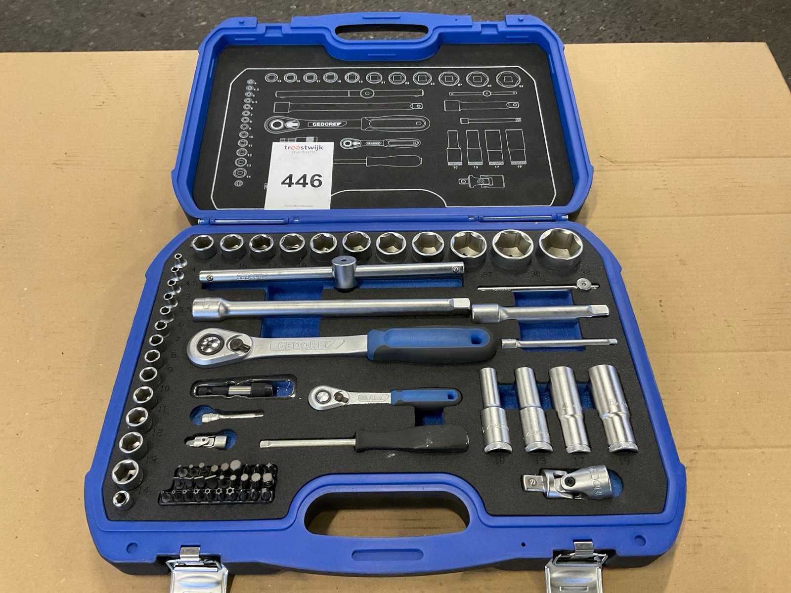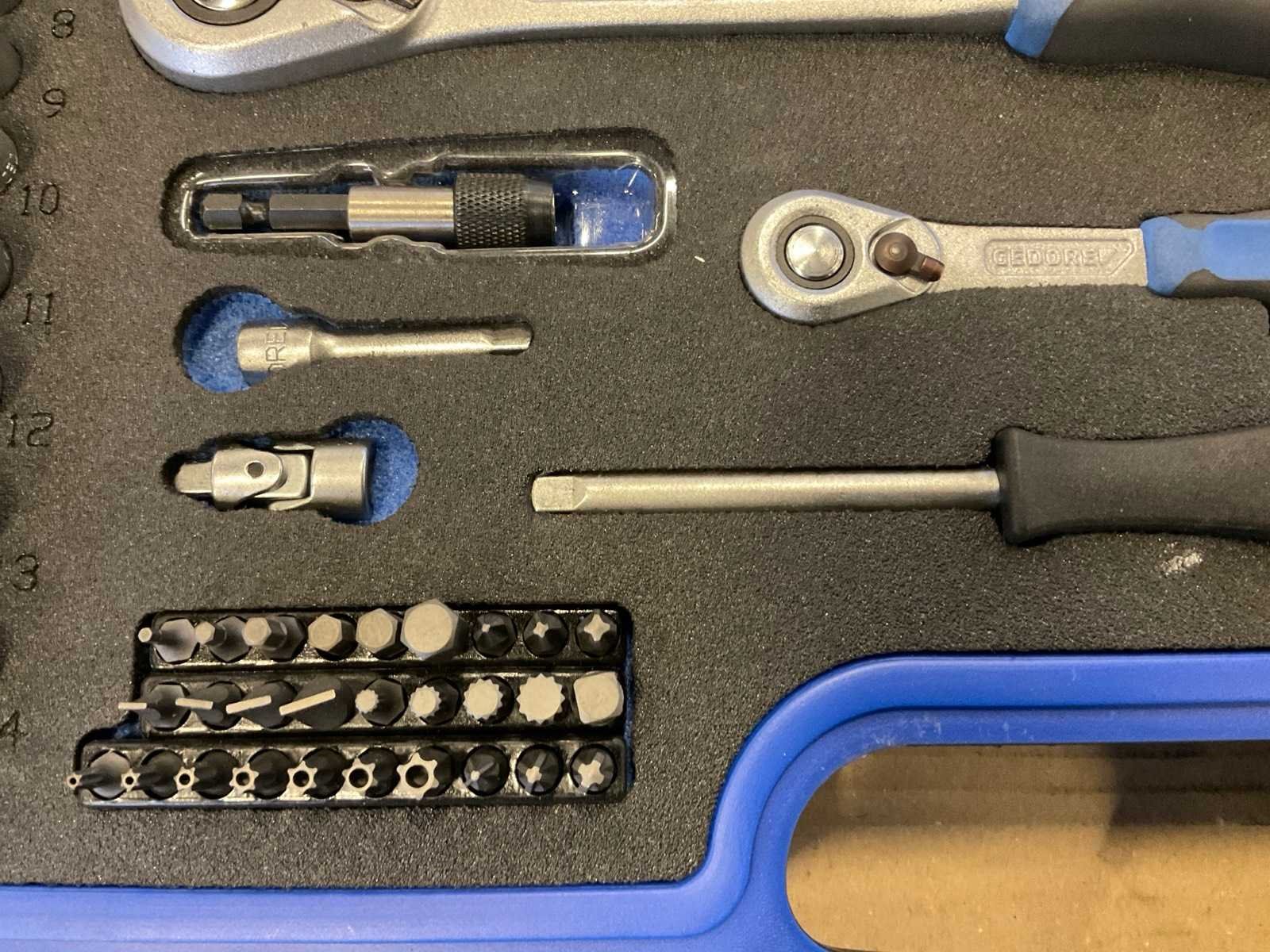 Doppenset bestaande uit 1/4" en 1/2" set met ratel, verlengstukken, bit set etc. Nee Merk: Gedore