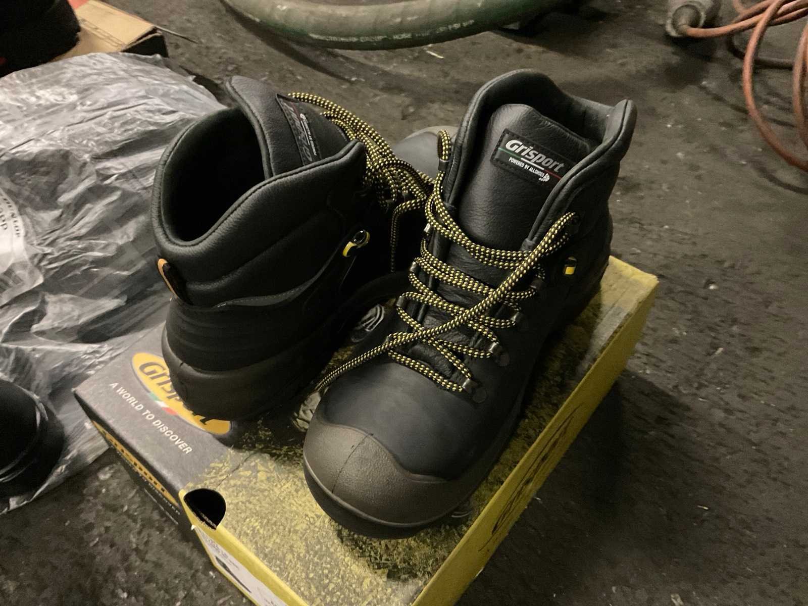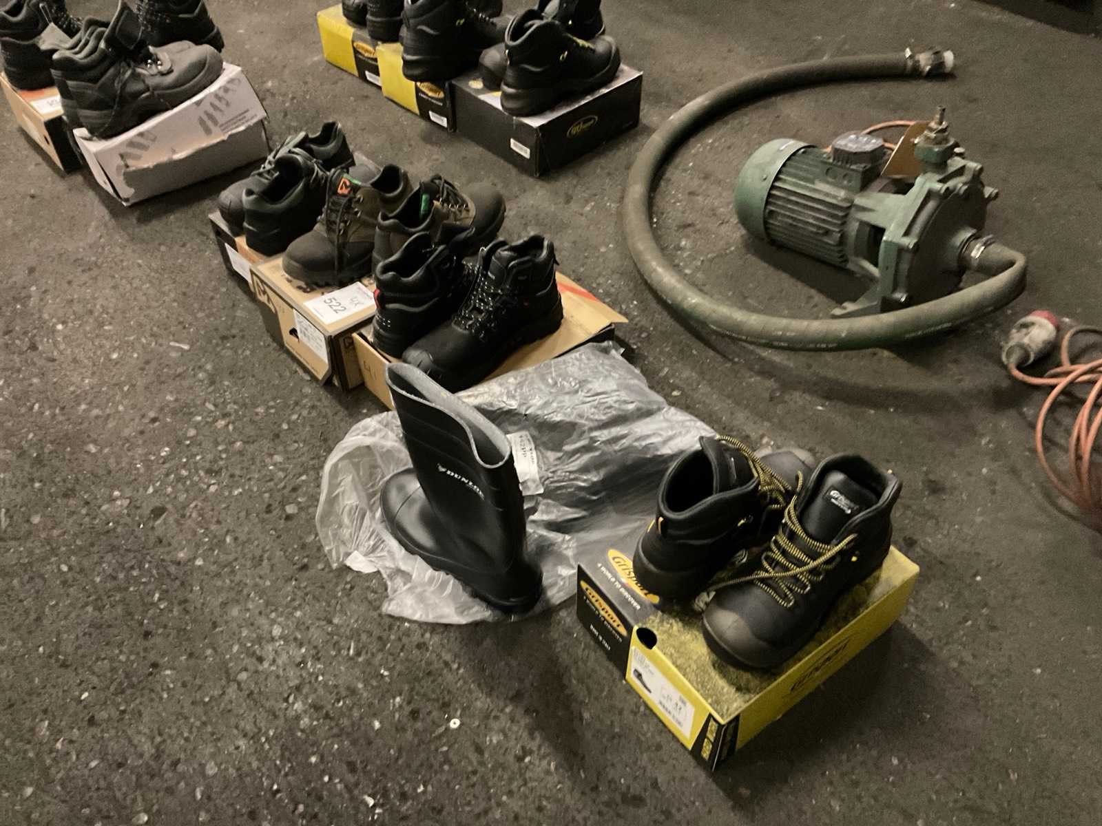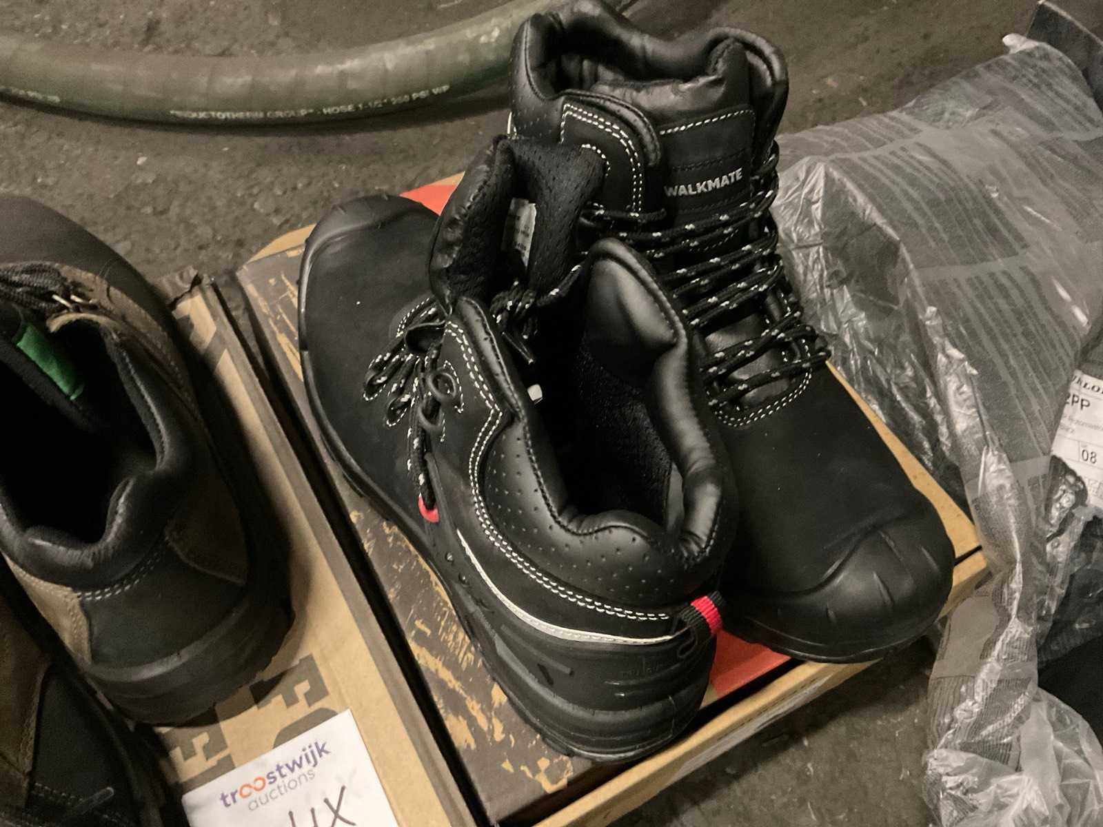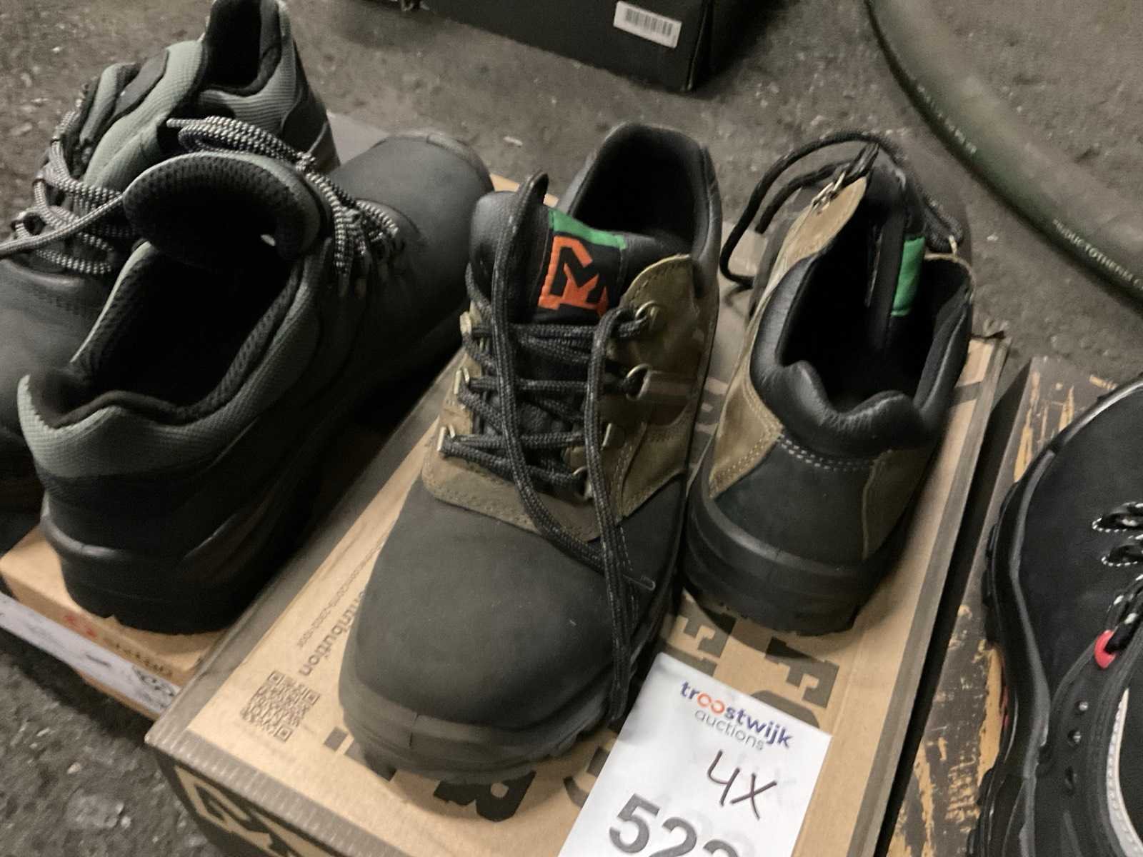 4 paar werkschoenen bestaande uit 2 par laag model maat 39 en 40, hoog model maat 41 en 42 en 1 paar Dunlop laarzen maat 42 met beschermende neuzen. Nee Merk: Emma, move safely, grisport Model: Laag en hoog