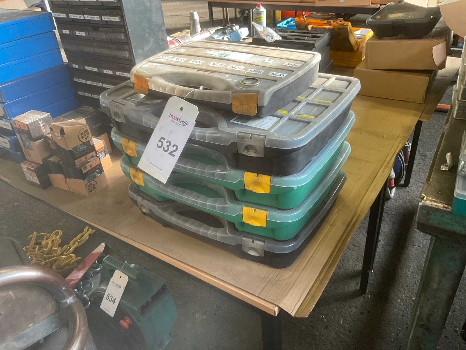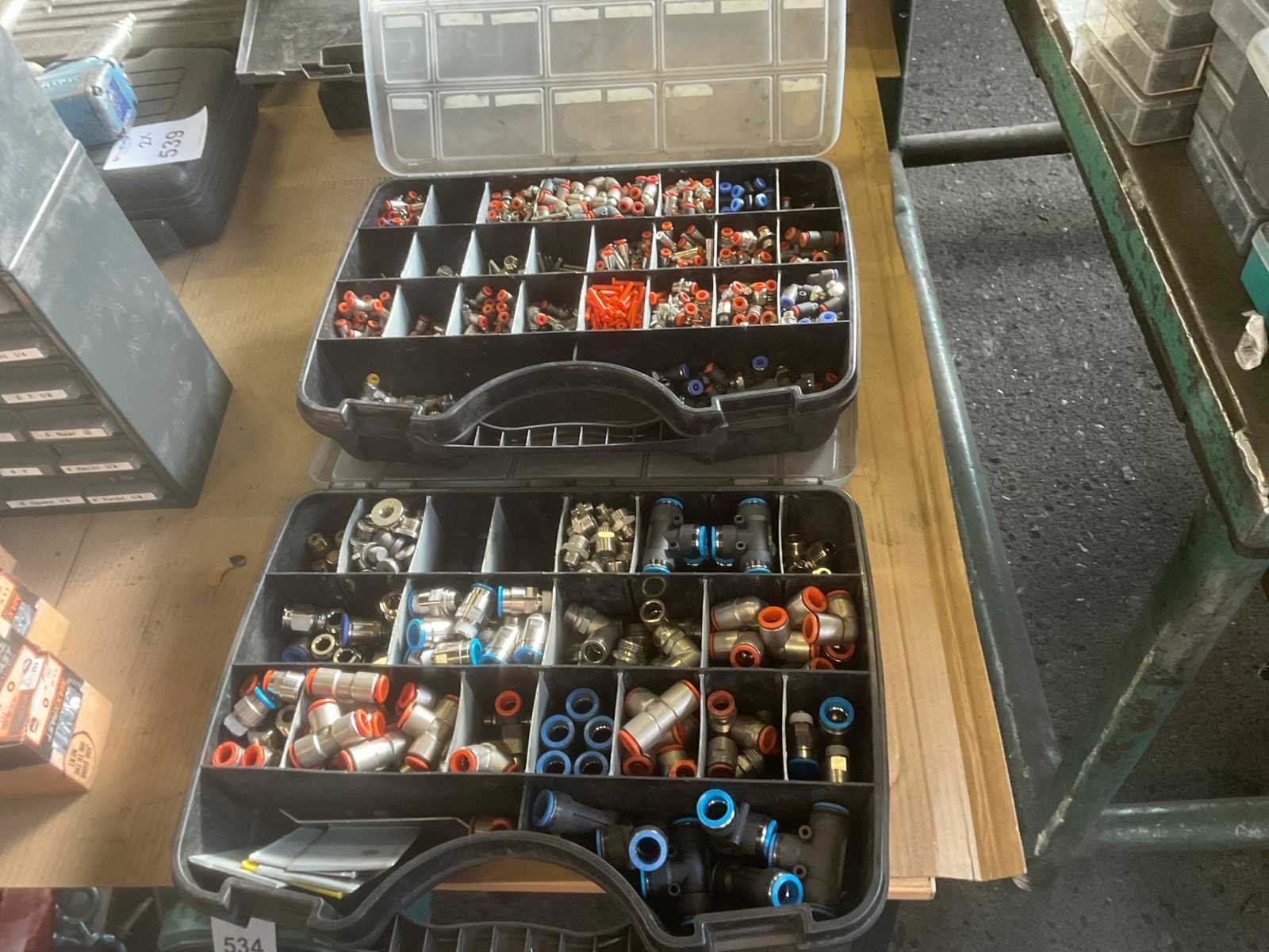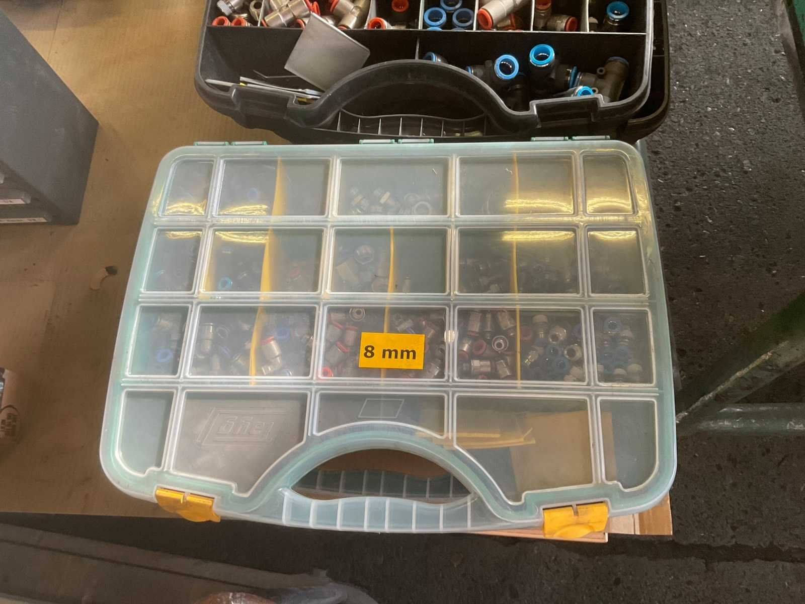 Partij van 4 opbergboxen met diverse afmetingen pneumatische koppelingen en 1 opbergbox afdichtringen Nee