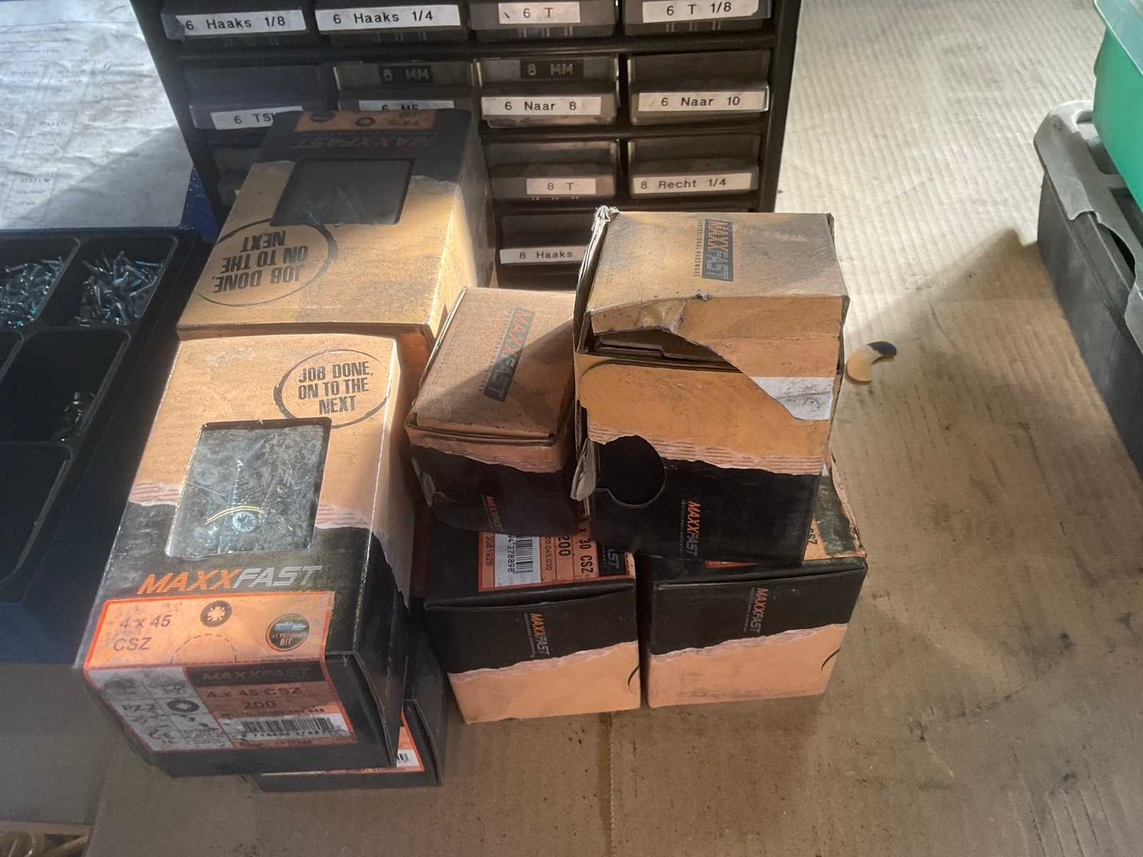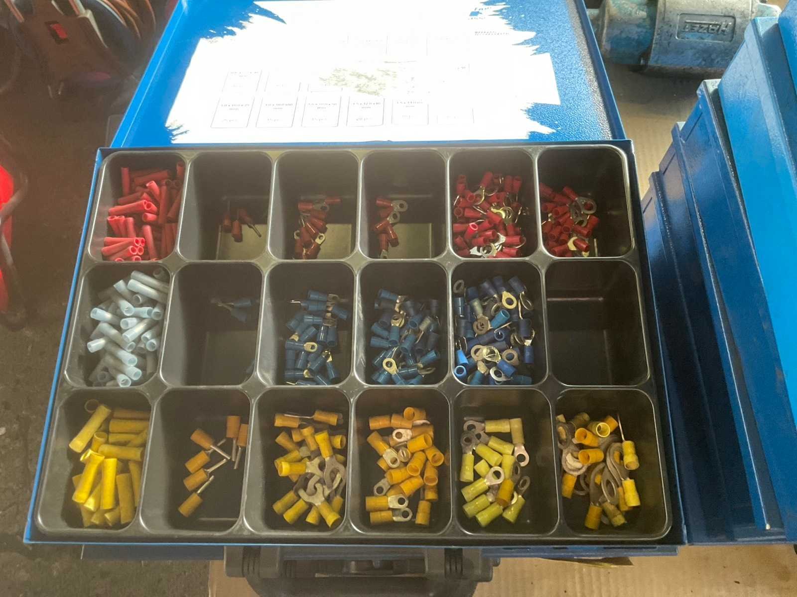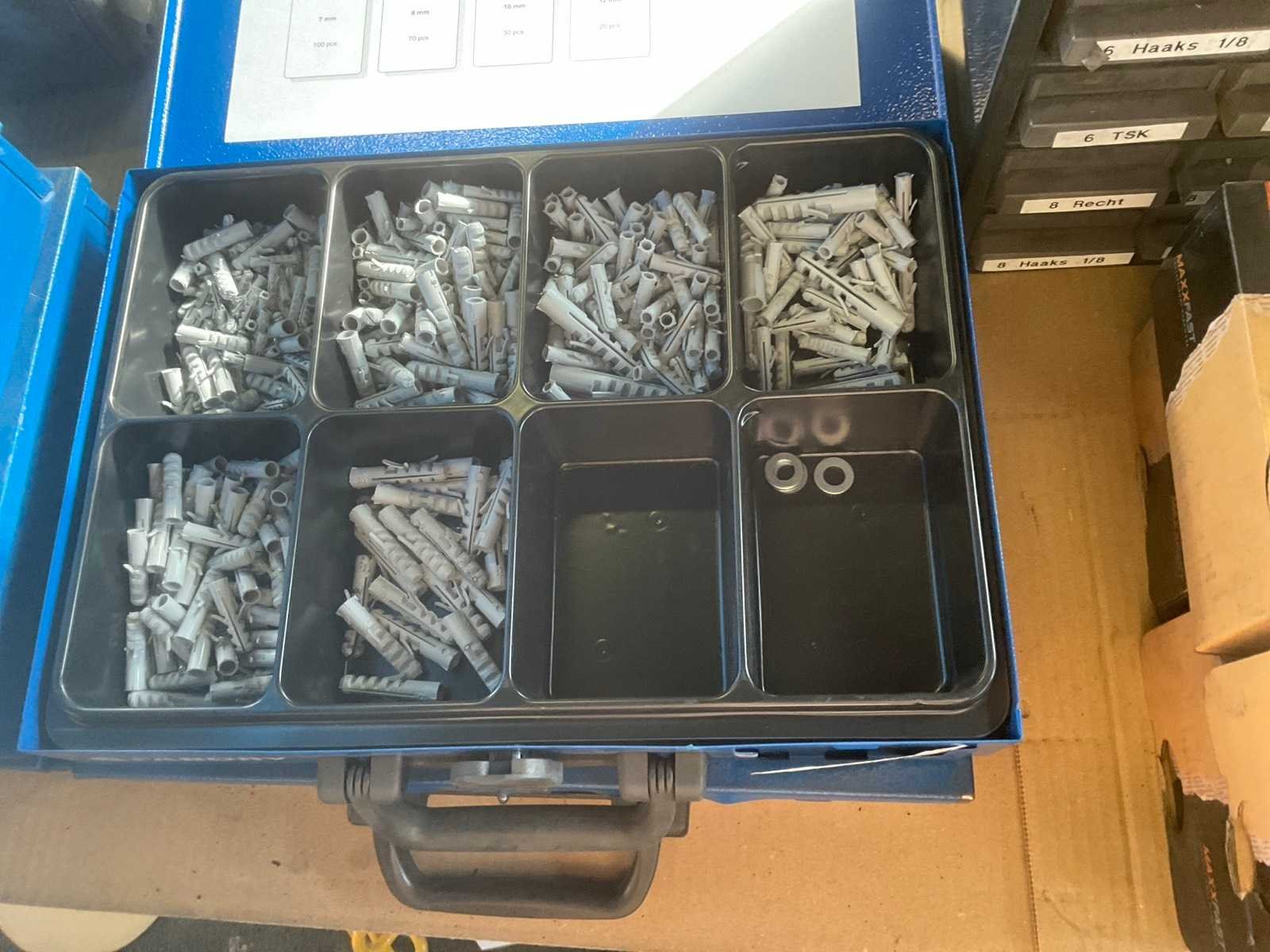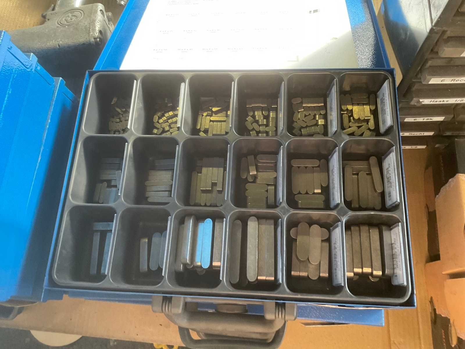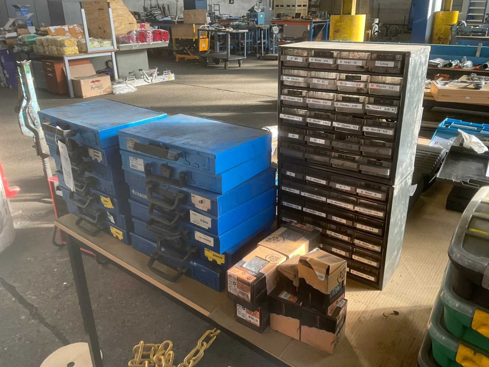 1 partij diverse bevestigingsmaterialen o.a. fabory opbergkoffers, o-ringen, vetnippels, schroeven, bouten en moeren, inlegspieën, Nee
