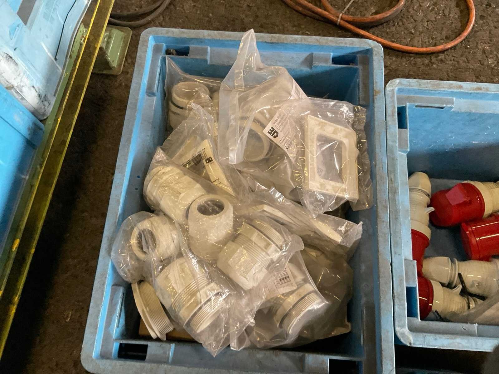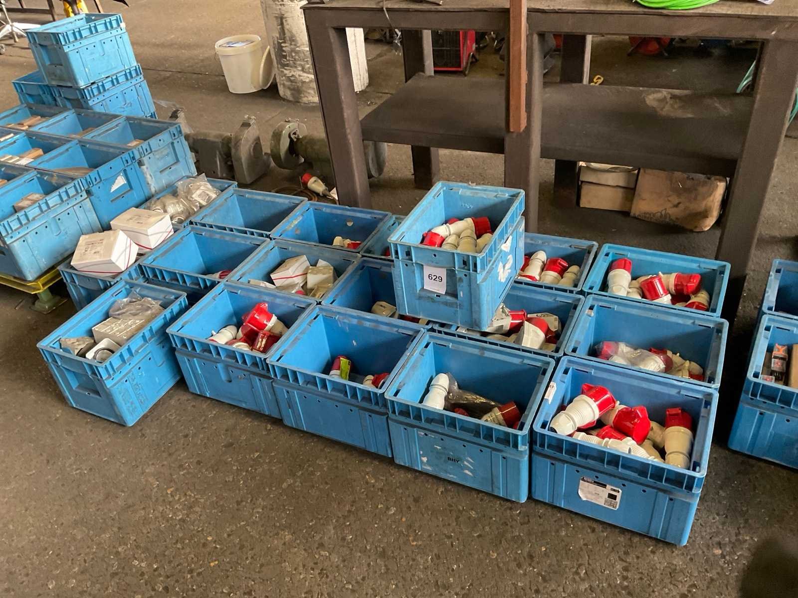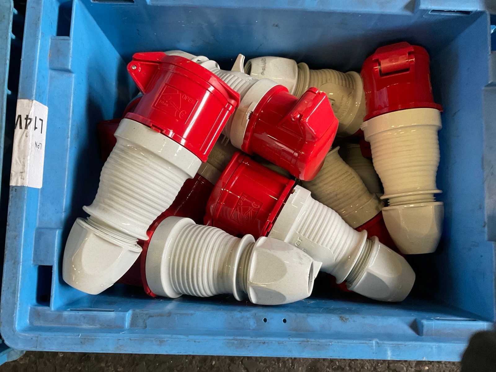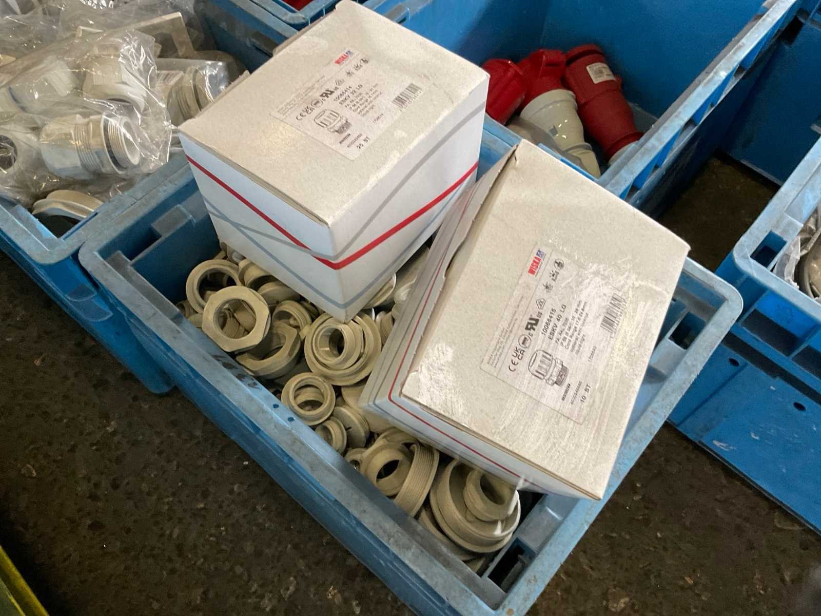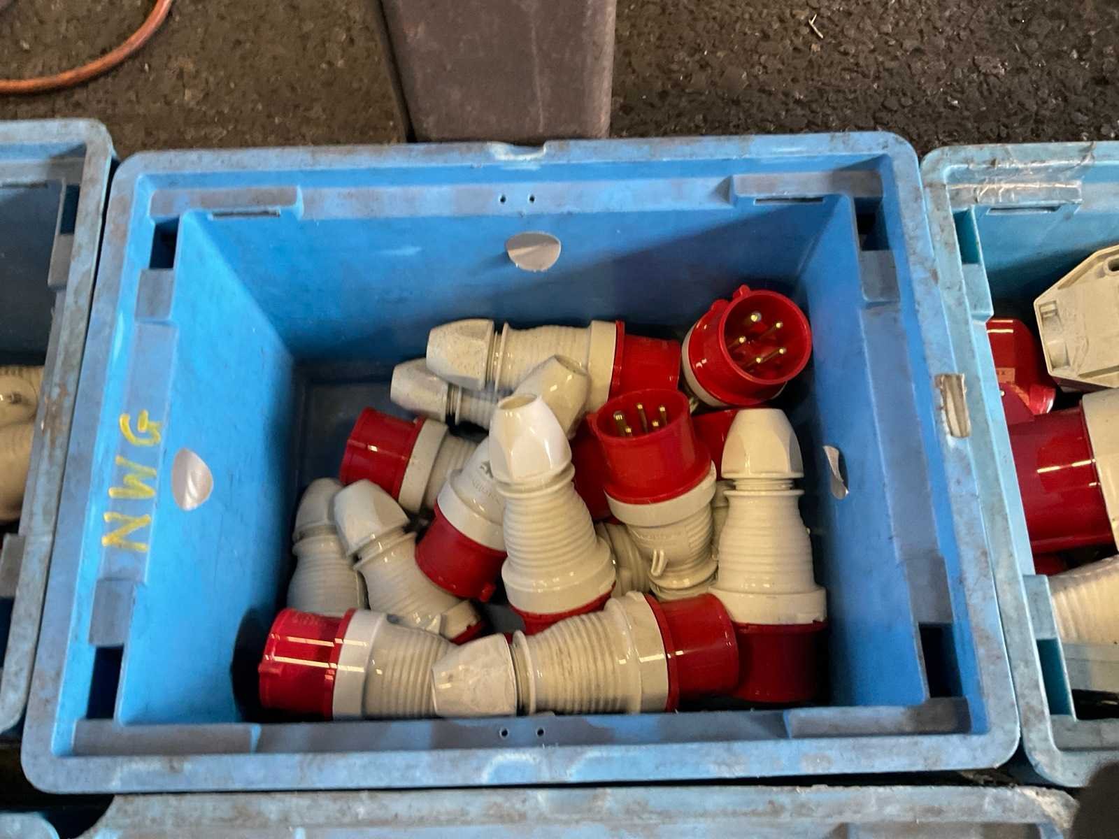 Inhoud van 18 kratten bestaande uit krachtstroomstekkers en onderdelen. Nee Merk: Walther