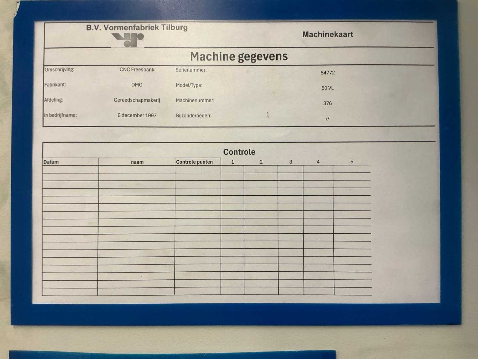 Verticaal bewerkingscentrum Voorzien van gereedschapsmagazijn met in totaal 24 (2x12) posities HSK gereedschapshouder, wandgemonteerde afzuiginstallatie Draaitafel rotatie en kanteling 360 graden Spaanafvoerband Blechtechnik 104045 uur aangestaan Nee Merk: Deckel-Maho Type: DMU 50 VL Bouwjaar: 1997 Serienummer: 81241127 Opname iso: HSK Verplaatsing x-as: 500mm Verplaatsing y-as: 380mm Verplaatsing z-as: 380mm Snelheid tot n =: 30000rpm Afgelezen urenstand: 83243 CNC-besturing, merk, type: Heidenhain tnc Spanentransporteur: true Koelmiddelpomp: true Werkstuk gewicht max.: 200kg T-gleuf opspantafelafmeting B: 380mm T-gleuf opspantafelafmeting L: 500mm -assig: 5 Motorvermogen (kW): 15kW Aansluiting: 400V Totale afmeting Hoogte: 2500mm Totale afmeting Breedte: 3600mm Totale afmeting L: 4400mm Machinegewicht: 7000kg