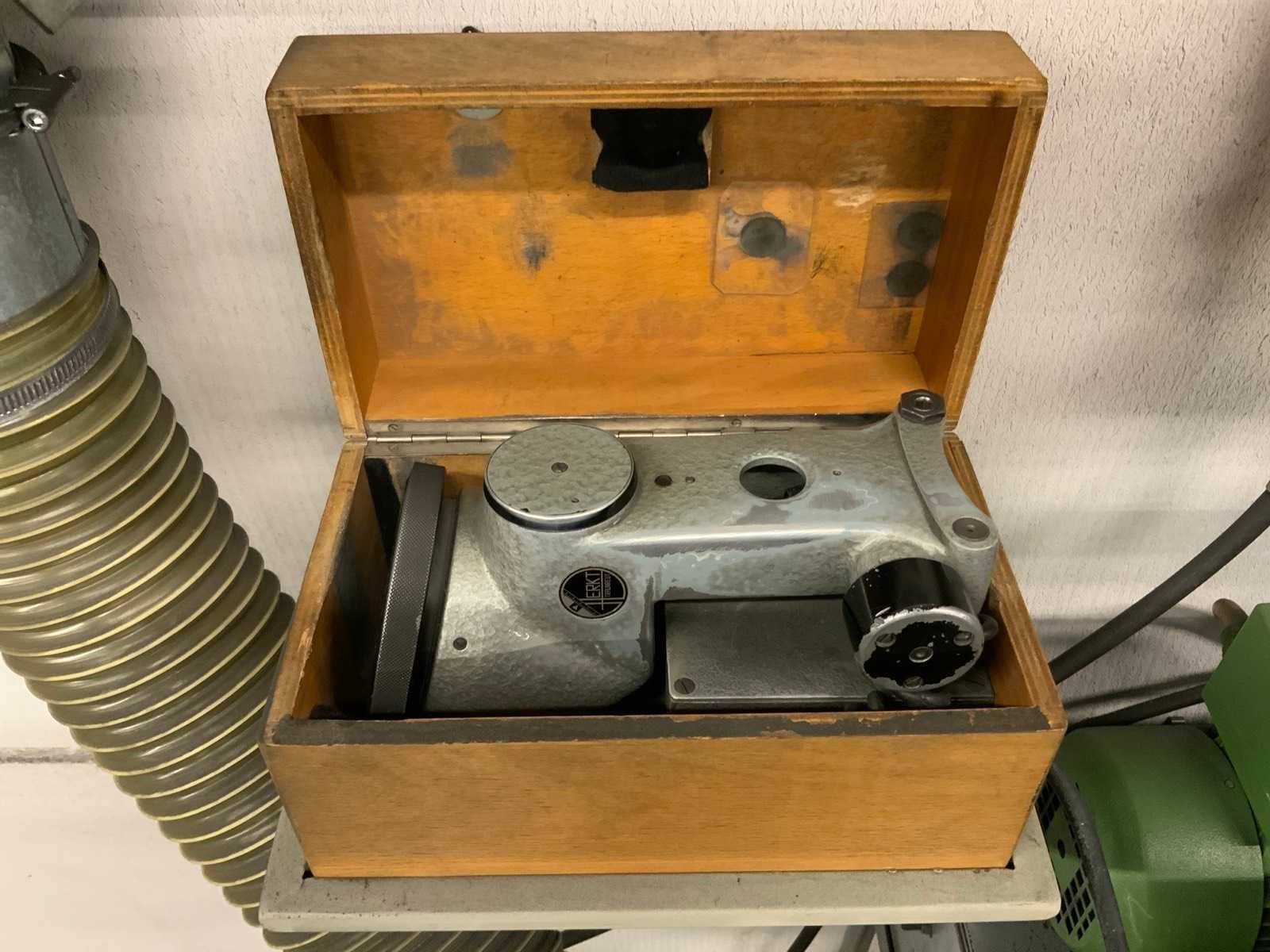 Slijphoek 0-180 graden Incl. Inhoud kast diverse spantangen en slijpstenen Alsmede projectie meetapparaat in houten kist Af te koppelen bij eerste afsluiter, slechts de flexibele buis hoort bij het kavel Nee Merk: Deckel Type: SOE Serienummer: 7077 Slijpbereik: 90mm Snelheid tot n =: 2800rpm Afmeting l: 500mm Afmeting b: 400mm Afmeting h: 1500mm