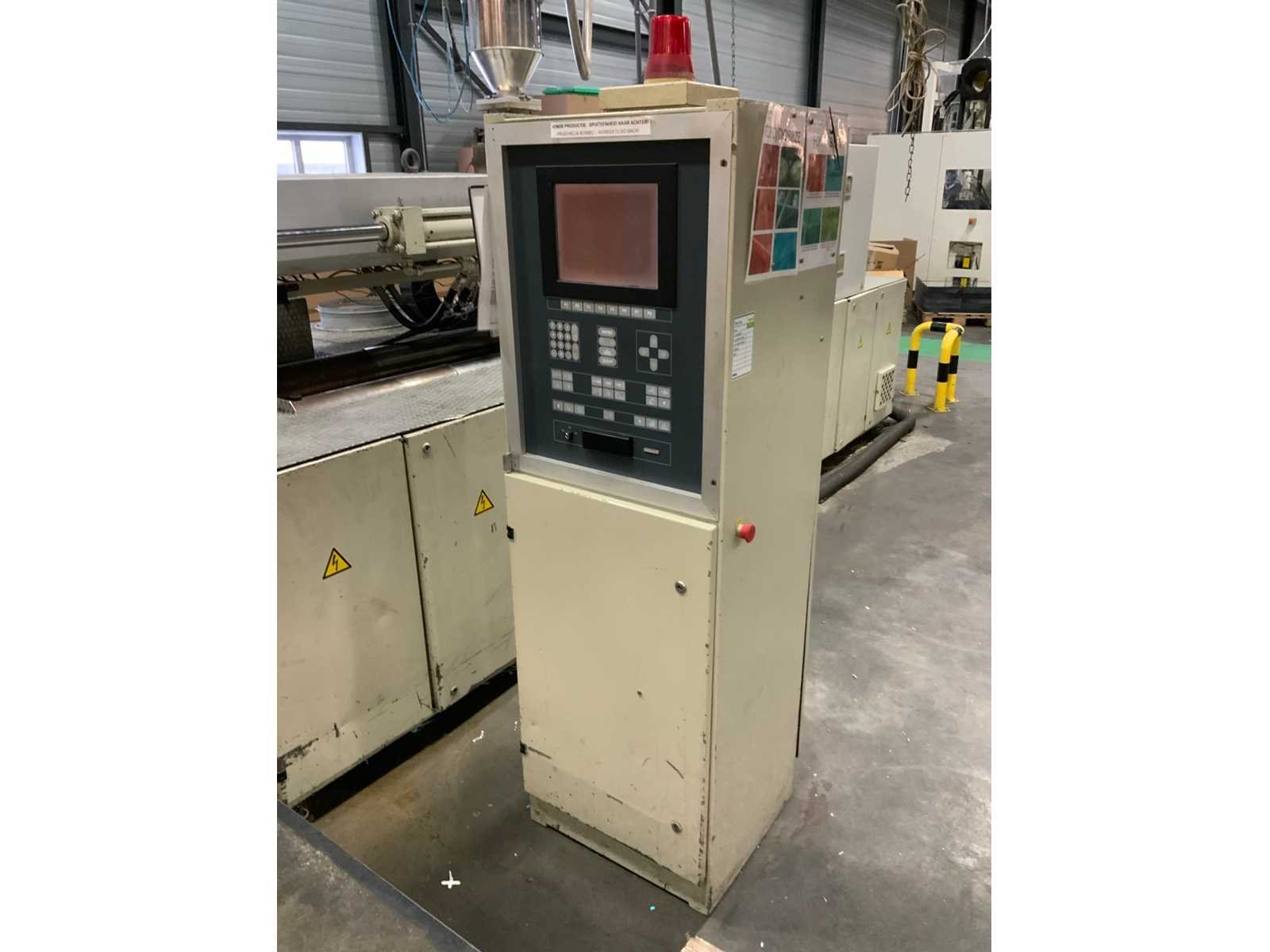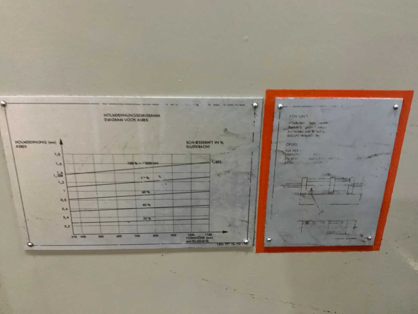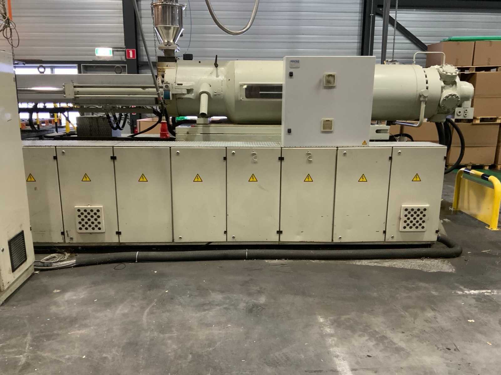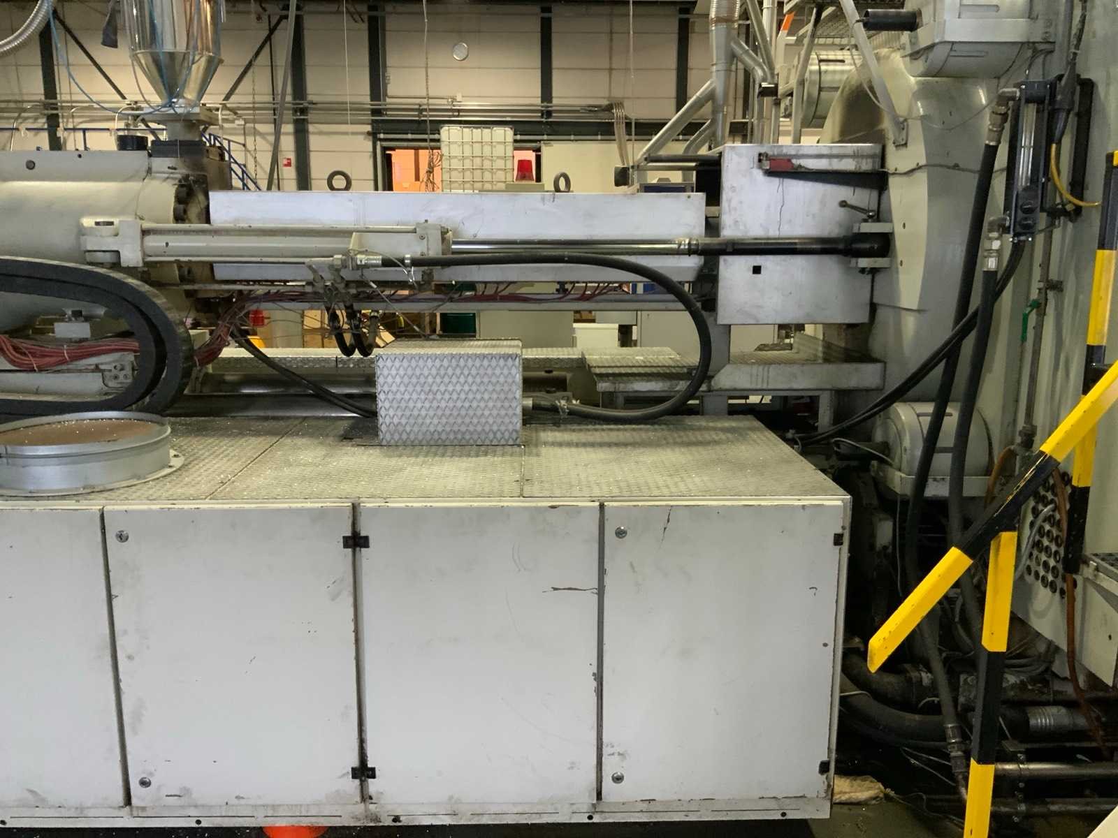 Kniehefboom machine Sluitkracht 1200 ton Open loopweg max 1100 mm Inbouwhoogte min 350 mm max 1100 mm Afstand tussen holmen horizontaal 1080 mm verticaal 1080 mm Afmeting opspanplaat 1690x1690 mm Diameter centreerring 175 (250) mm Centreerring adapterplaat 175 mm Kerntrekkers 3 Theor. Max. inspuitvolume 4156 cm3 Max shotgewicht in PS 3741 (4275) g Max. specifieke spuitdruk 1600 bar Plastificeercapaciteit in PS 335 kg/h Schroeftype conventioneel Hydraulische druk 140 bar Neusaandrukkracht 15 ton Neusradius R39 mm Productgewichten Min shotgewicht (1/2D) 464 gr Gewicht 1D 927 gr 2D 1855 gr Max. shotgewicht 3D 2782 Min toerental schroef 11,4 omw/min Incl. Bordessen, trappen en aanrijdbeveiliging Let op; Motan vacuüm transporteur met cycloon afscheider niet inbegrepen, deze wordt gedemonteerd Nee Merk: Engel Type: ES 7000/1200 (1300) Bouwjaar: 1989 Serienummer: 19082 Schroefdiameter: 105mm Injectiedruk: 140bar Uitwerpslag: 300mm Afgelezen urenstand: 31928 Aansluiting: 400V Machinegewicht: 85500kg Totale afmeting L: 13200mm Totale afmeting Breedte: 9500mm Totale afmeting Hoogte: 3400mm