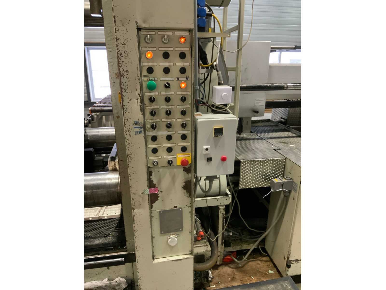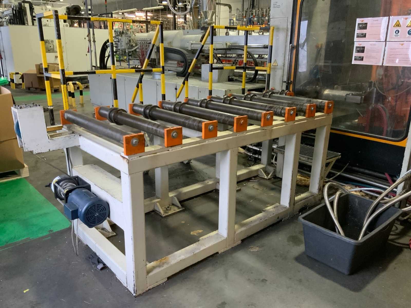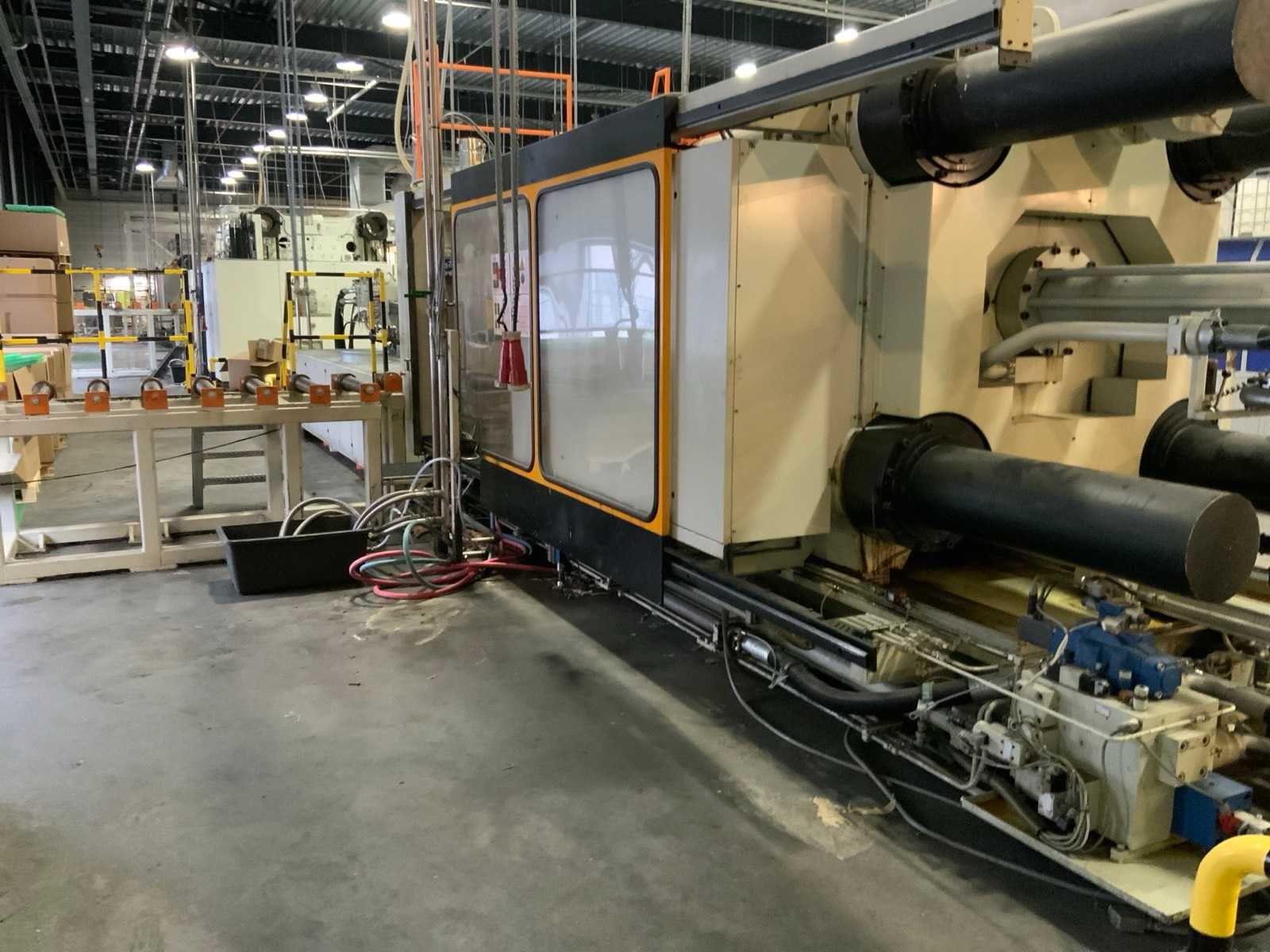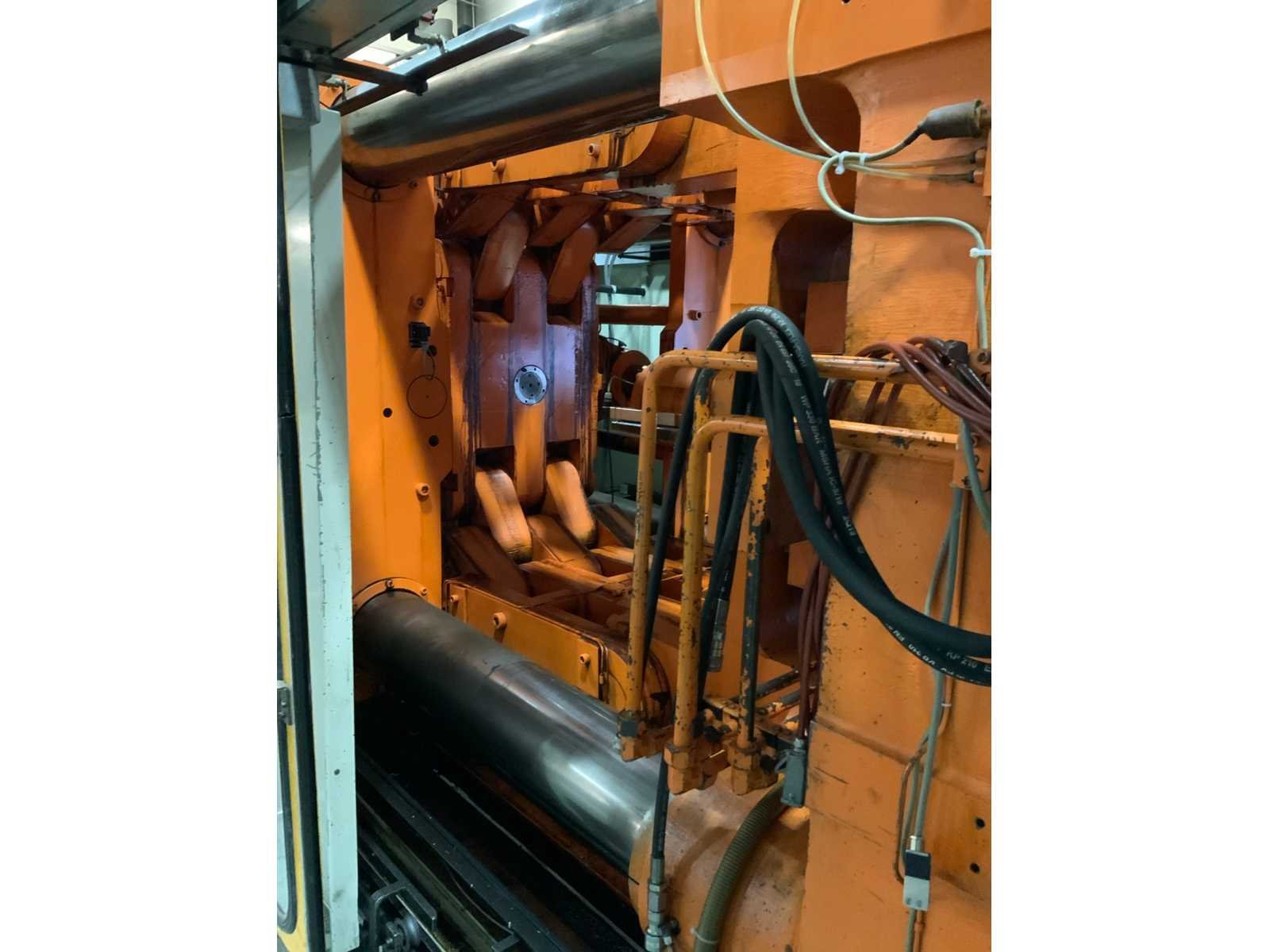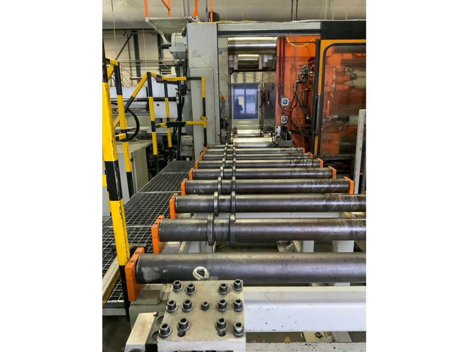 Kniehefboom machine Sluitkracht 1200 ton Open loopweg max 1100 mm Inbouwhoogte min 350 mm max 1100 mm Afstand tussen holmen horizontaal 1080 mm verticaal 1080 mm Afmeting opspanplaat 1690x1690 mm Diameter centreerring 175 (250) mm Centreerring adapterplaat 175 mm Kerntrekkers 3 Theor. Max. inspuitvolume 4156 cm3 Max shotgewicht in PS 3741 (4275) g Max. specifieke spuitdruk 1600 bar Plastificeercapaciteit in PS 335 kg/h Schroeftype conventioneel Hydraulische druk 140 bar Neusaandrukkracht 15 ton Neusradius R39 mm Productgewichten Min shotgewicht (1/2D) 464 gr Gewicht 1D 927 gr 2D 1855 gr Max. shotgewicht 3D 2782 Min toerental schroef 11,4 omw/min Incl. Bordessen, trappen en aanrijdbeveiliging Let op; Motan vacuüm transporteur met cycloon afscheider niet inbegrepen, deze wordt gedemonteerd Nee Merk: Engel Type: ES 7000/1200 (1300) Bouwjaar: 1989 Serienummer: 19082 Schroefdiameter: 105mm Injectiedruk: 140bar Uitwerpslag: 300mm Afgelezen urenstand: 31928 Aansluiting: 400V Machinegewicht: 85500kg Totale afmeting L: 13200mm Totale afmeting Breedte: 9500mm Totale afmeting Hoogte: 3400mm
