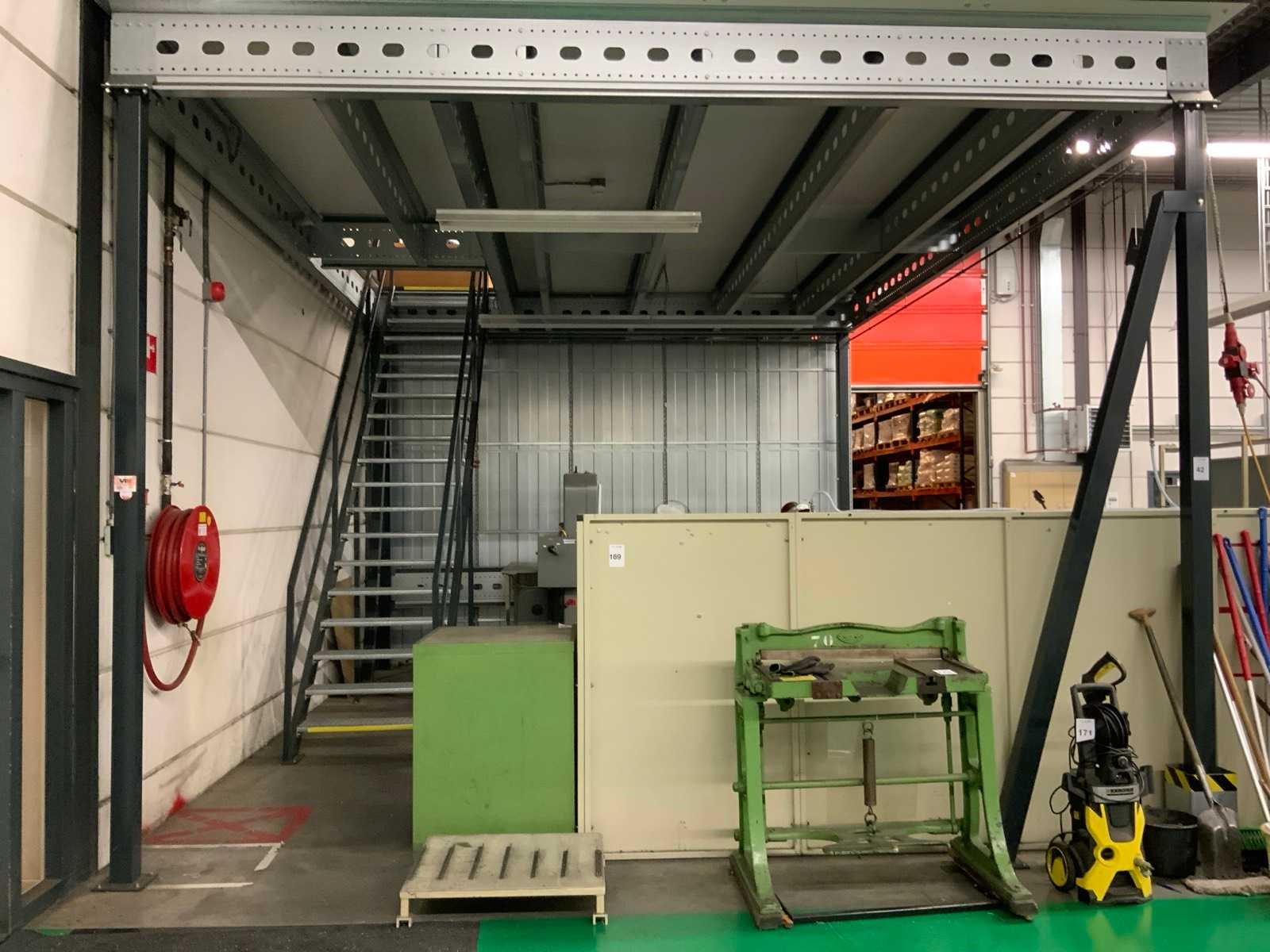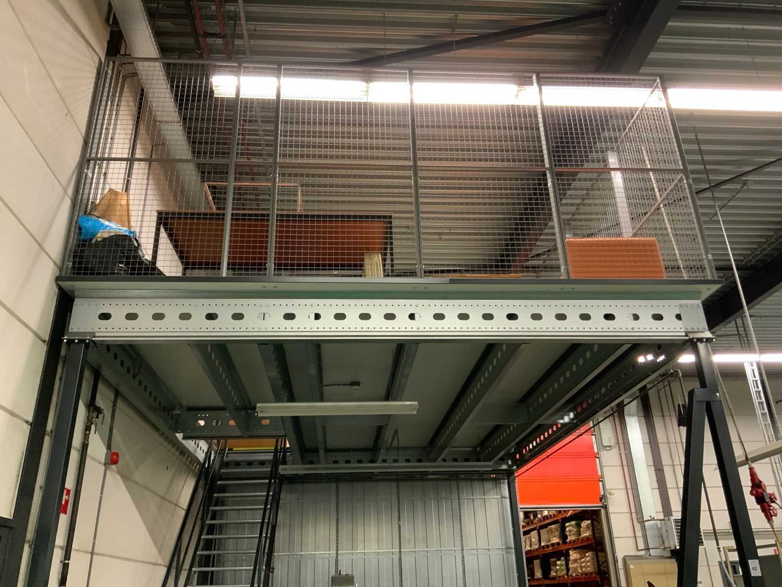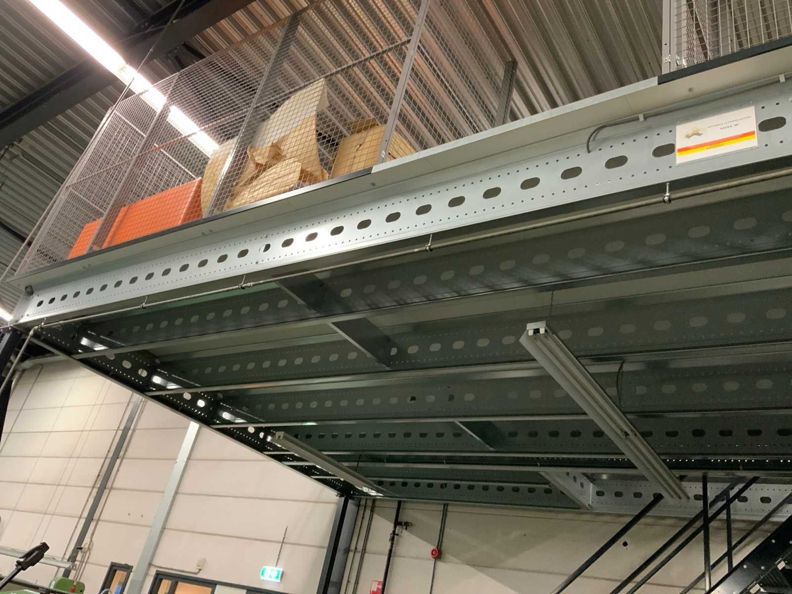 Voorzien van gaasstalen wanden Trap met 18 treden breedte ca. 90 cm TL verlichting Railing met stroompunten (electra dient afgedopt te worden) Max 500 kg/m2 Zaken op en onder de entresol niet inbegrepen Nee Totale afmeting L: 12500mm Totale afmeting Breedte: 5000mm Vloerhoogte: 3950mm Houten vloer: true Met trap: true