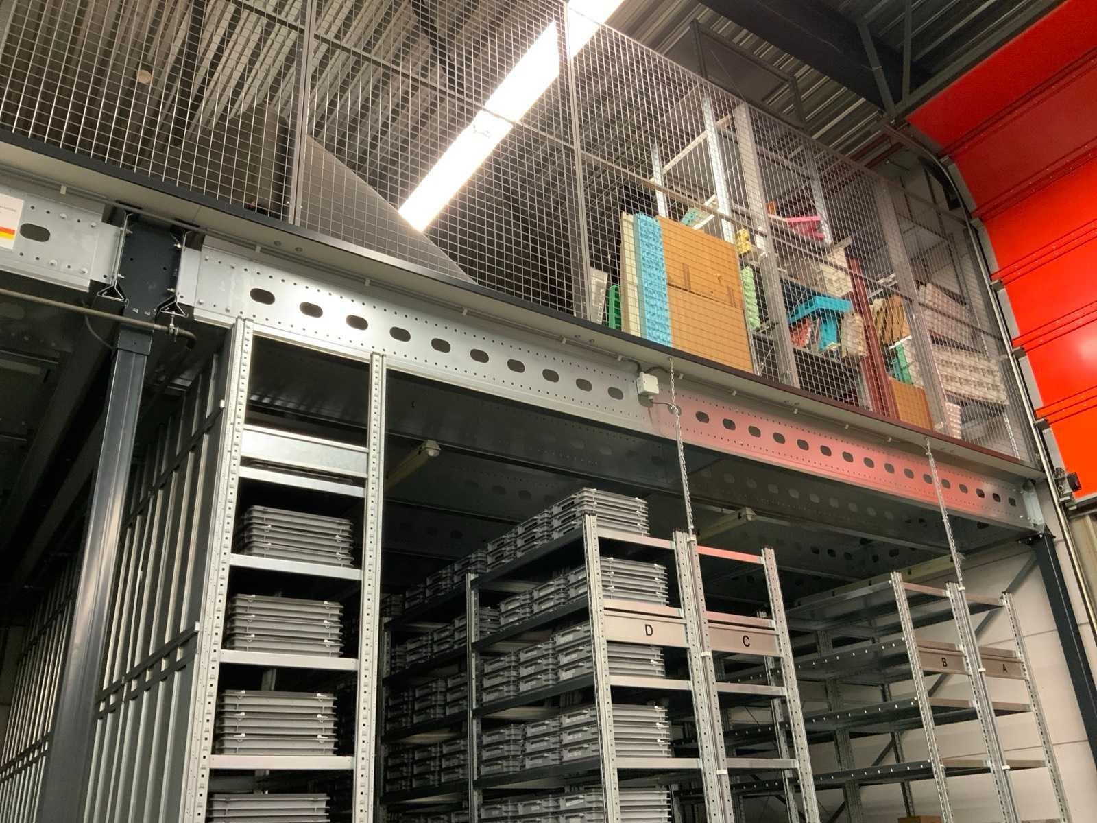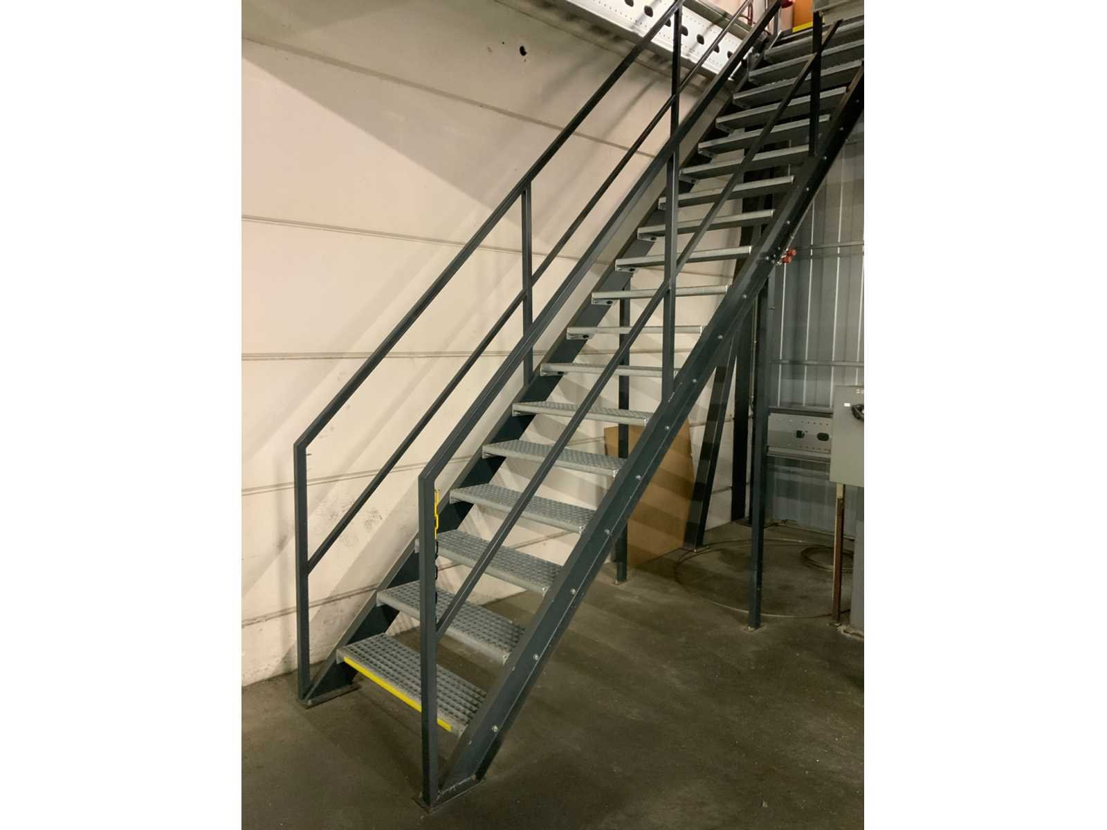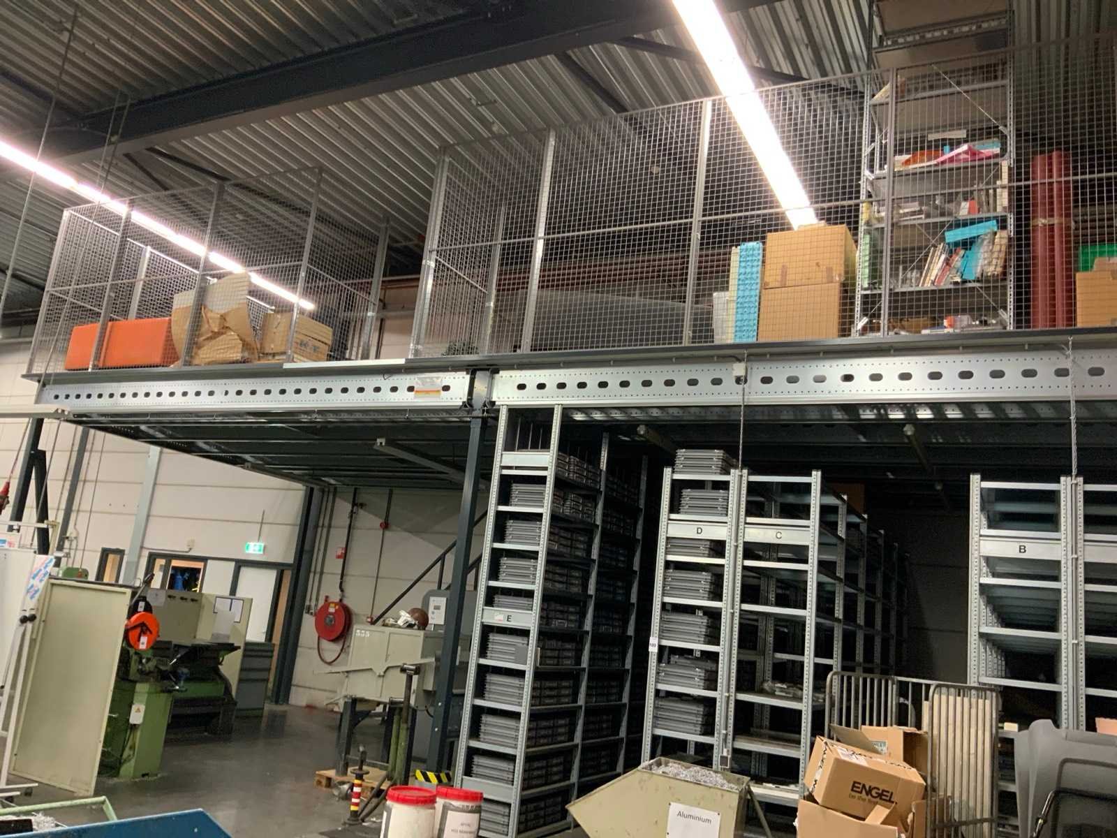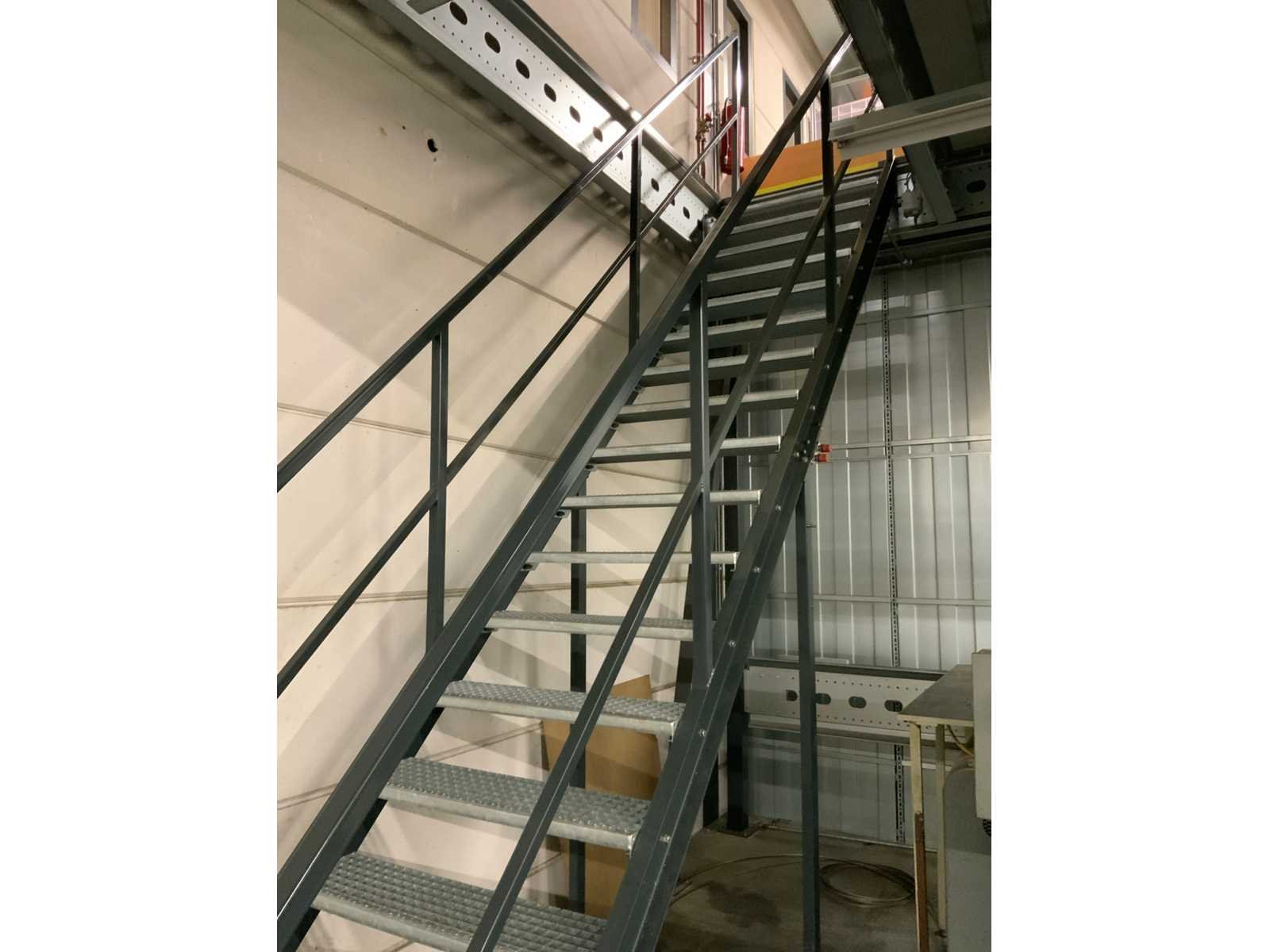 Voorzien van gaasstalen wanden Trap met 18 treden breedte ca. 90 cm TL verlichting Railing met stroompunten (electra dient afgedopt te worden) Max 500 kg/m2 Zaken op en onder de entresol niet inbegrepen Nee Totale afmeting L: 12500mm Totale afmeting Breedte: 5000mm Vloerhoogte: 3950mm Houten vloer: true Met trap: true