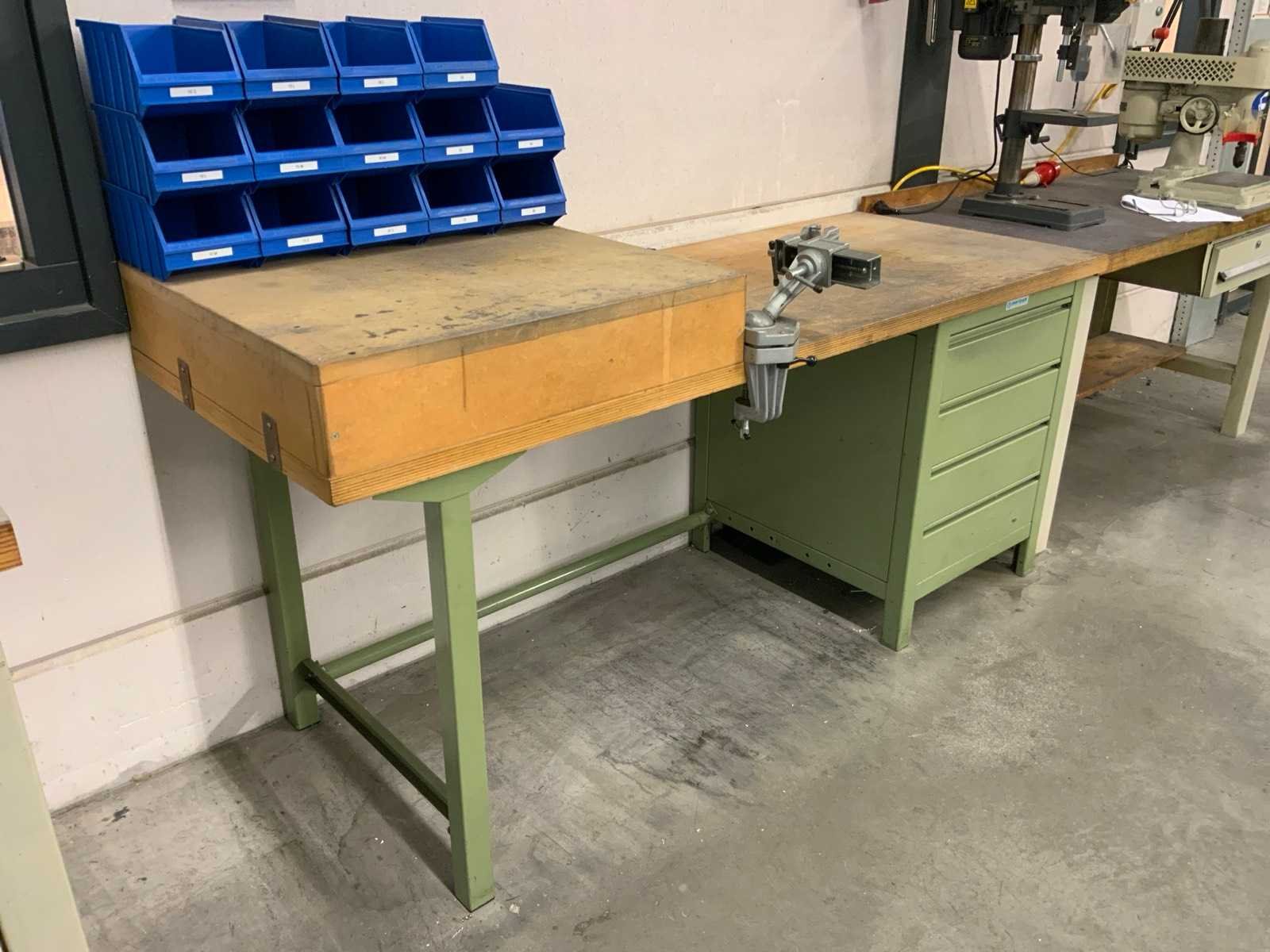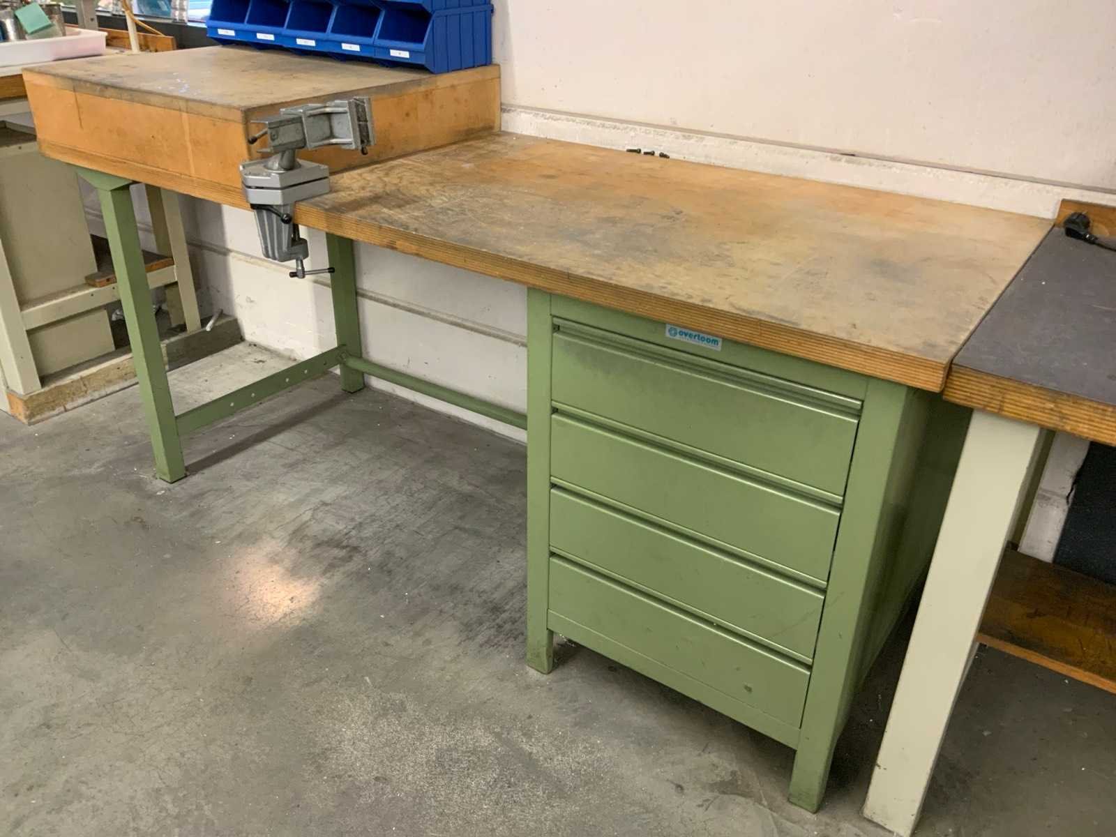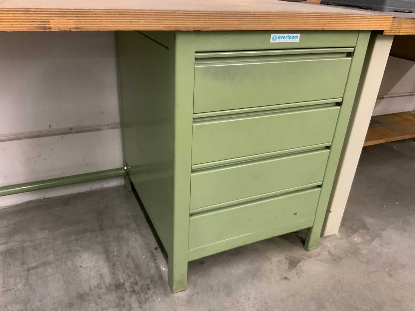Voorzien van 4 laden met inhoud, bankschroef, houten opbouw en 14 kunststof grijpvoorraad bakken Werkblad dikte ca. 4 cm Nee Merk: Overtoom Breedte: 750mm Lengte: 2000mm Hoogte: 855mm