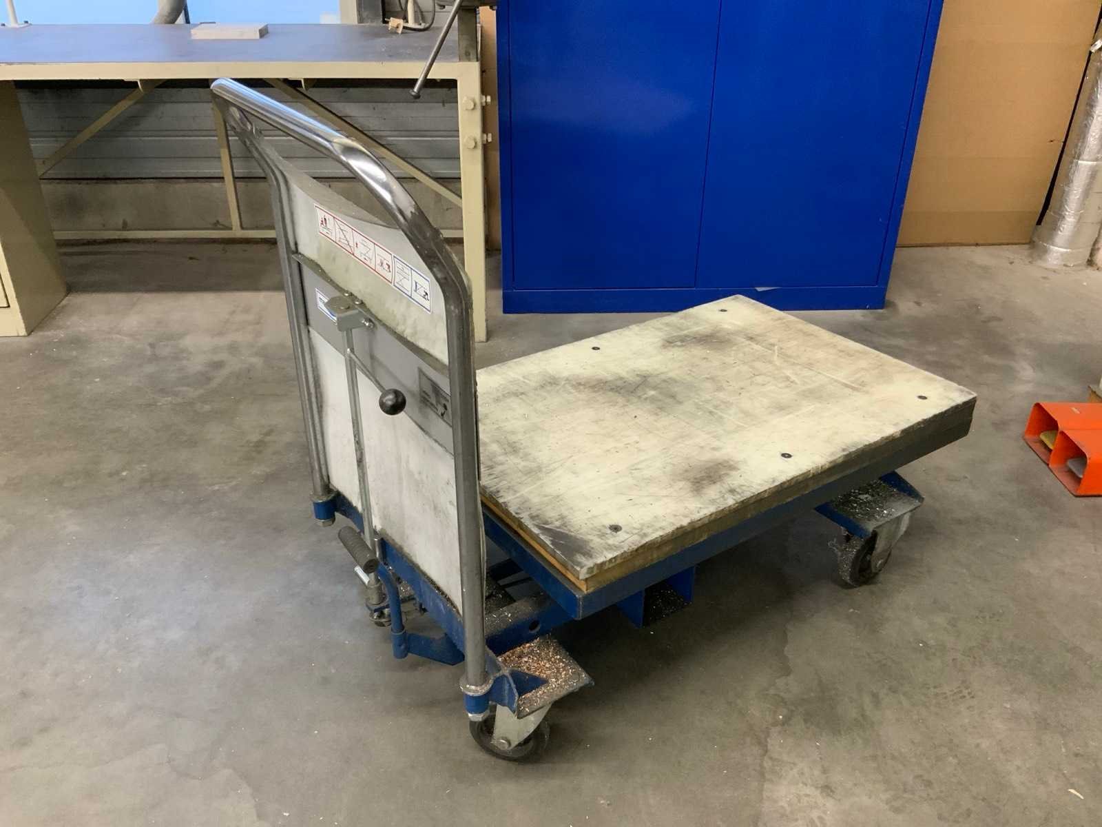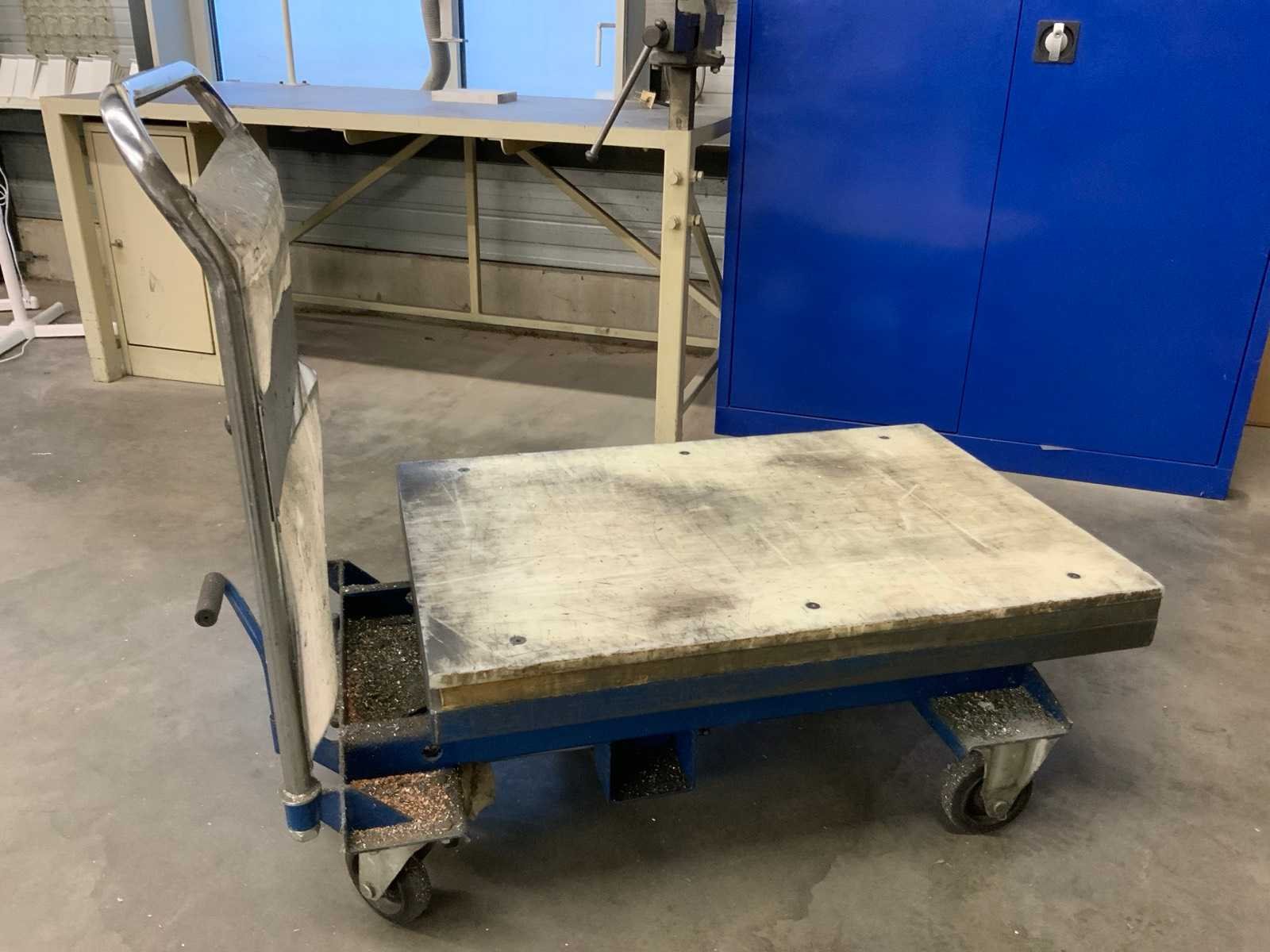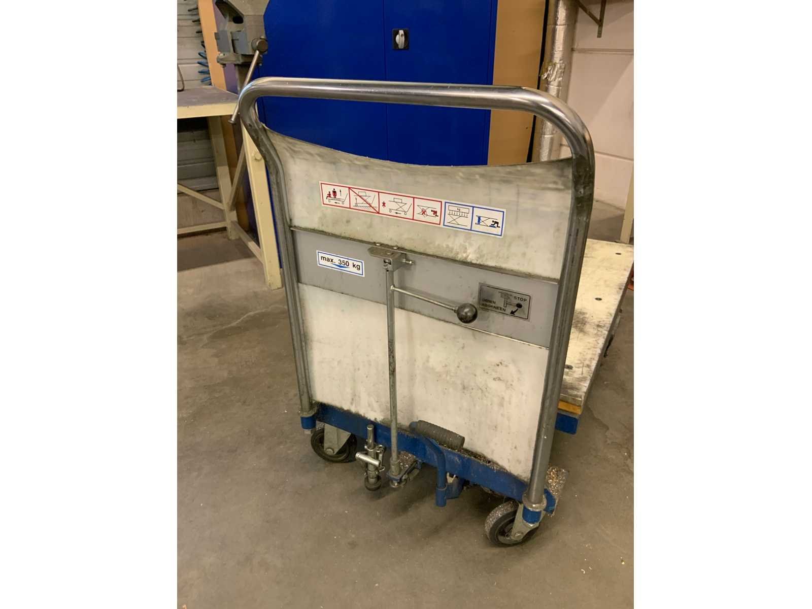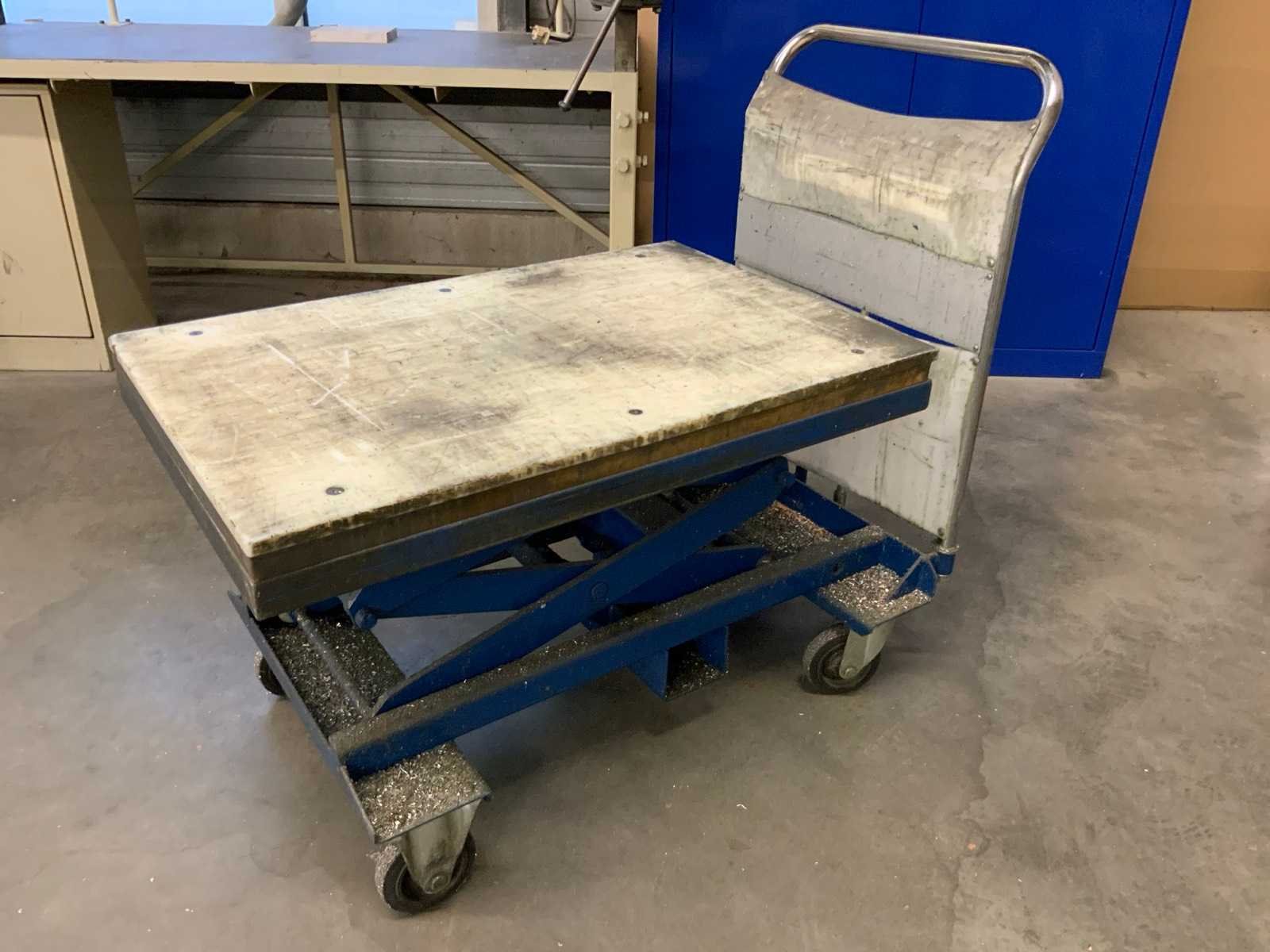 Mobiele schaarheftafel, max hoogte ca. 128 cm Nee Plateau afm. l: 910mm Plateau afm. b: 600mm Capaciteit.: 350kg Totale afmeting L: 1100mm Totale afmeting Breedte: 600mm Totale afmeting Hoogte: 960mm