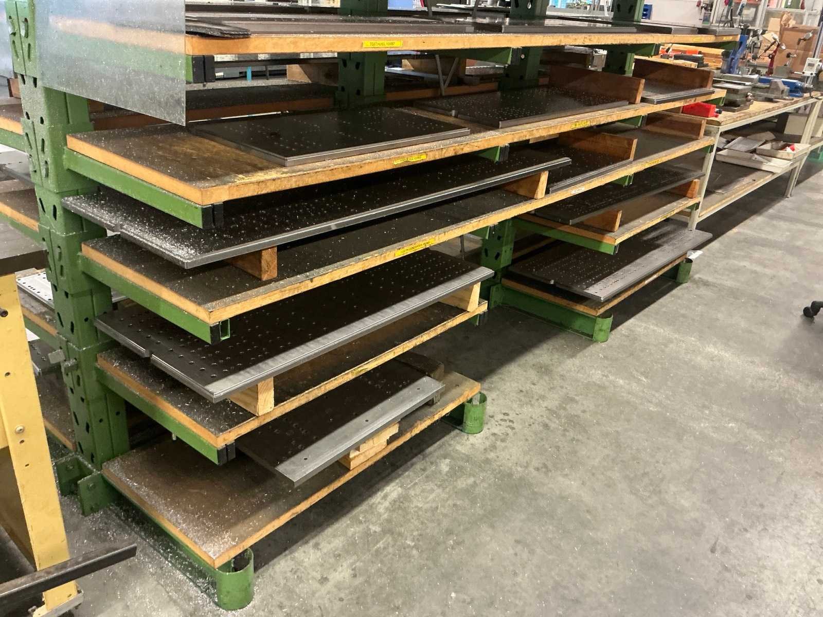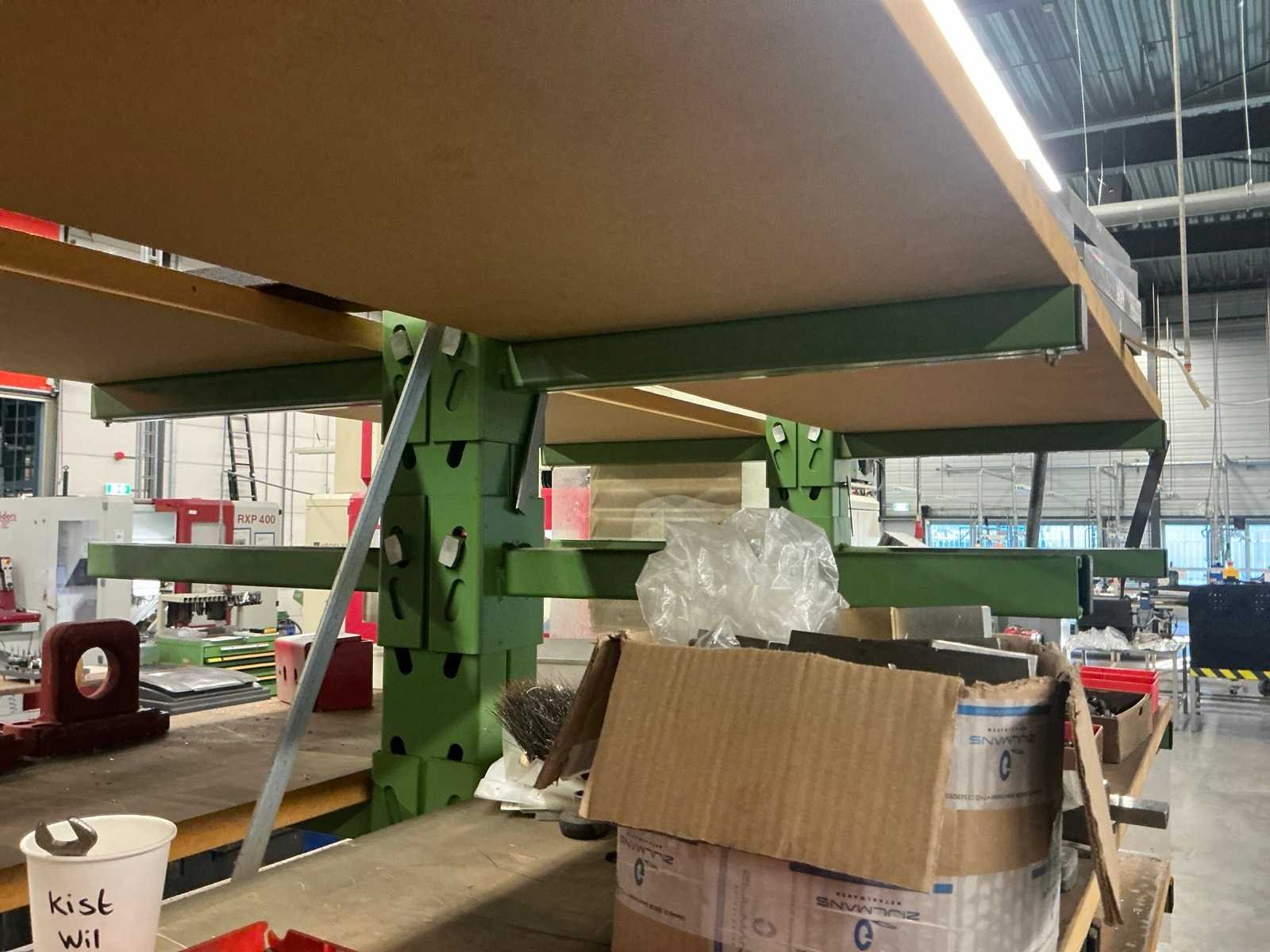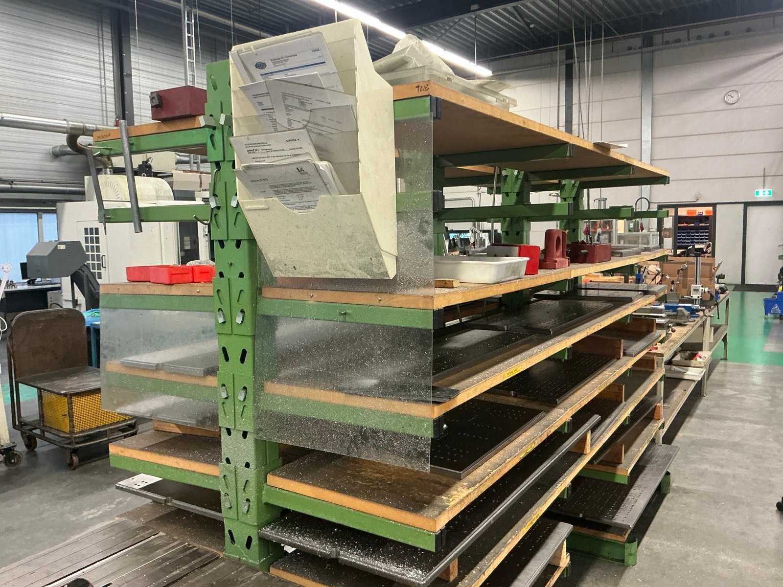 Stalen stelling voorzien van houten legborden. Let op: inhoud hoort niet bij het kavel. Nee Aantal staanders: 4 Totale afmeting L: 305cm Totale afmeting Breedte: 116cm Totale afmeting Hoogte: 210cm