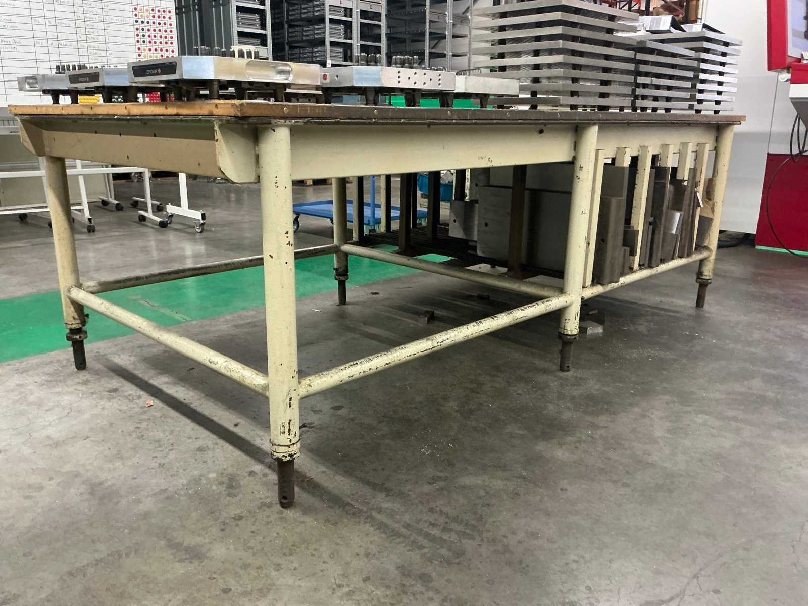 Voorzien van vakverdeling Apart verkavelde items op tafel horen niet bij het kavel. Metaal in vakverdeling niet inbegrepen Nee Lengte: 250cm Breedte: 126cm Hoogte: 85cm Materiaal: Stalen onderstel met houten werkblad