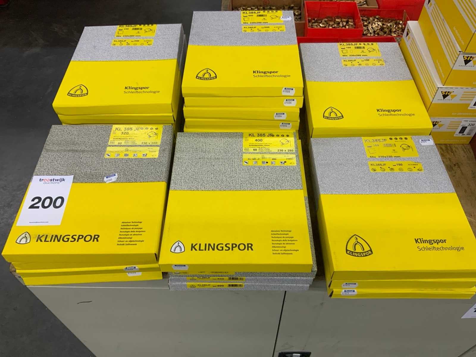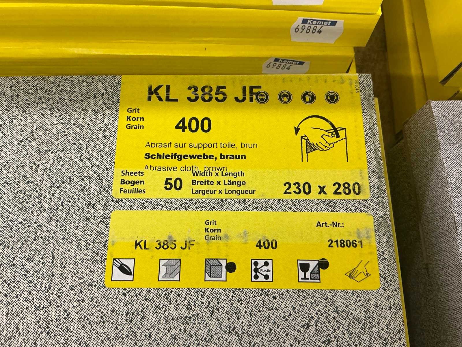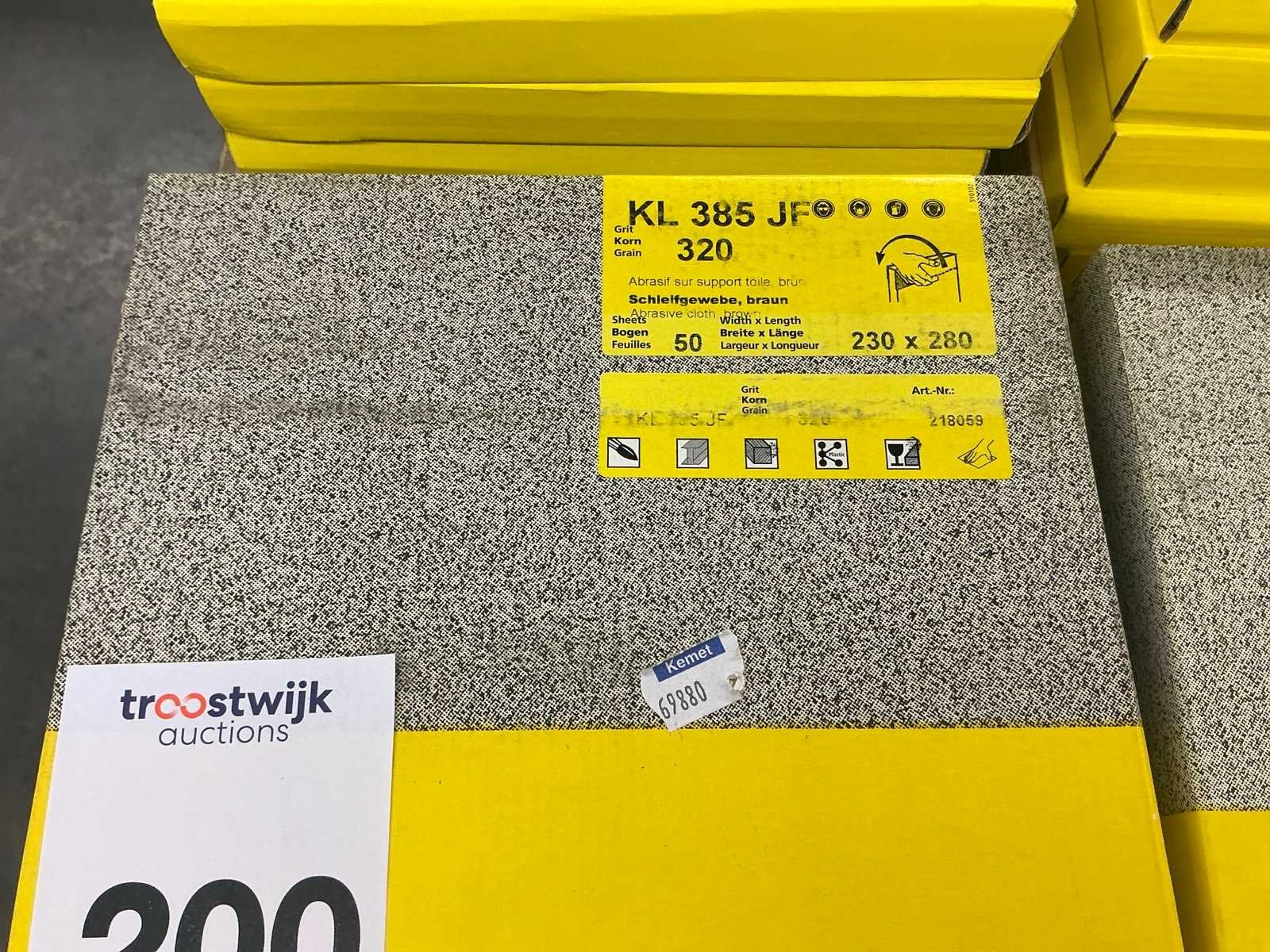 Diverse korrelgrootte o.a. 100, 150, 240,320, 400, 500 en 600 Nee Merk: Klingspor, Sia, 3M Model: KL385JF Lengte: 2800 Breedte: 2300