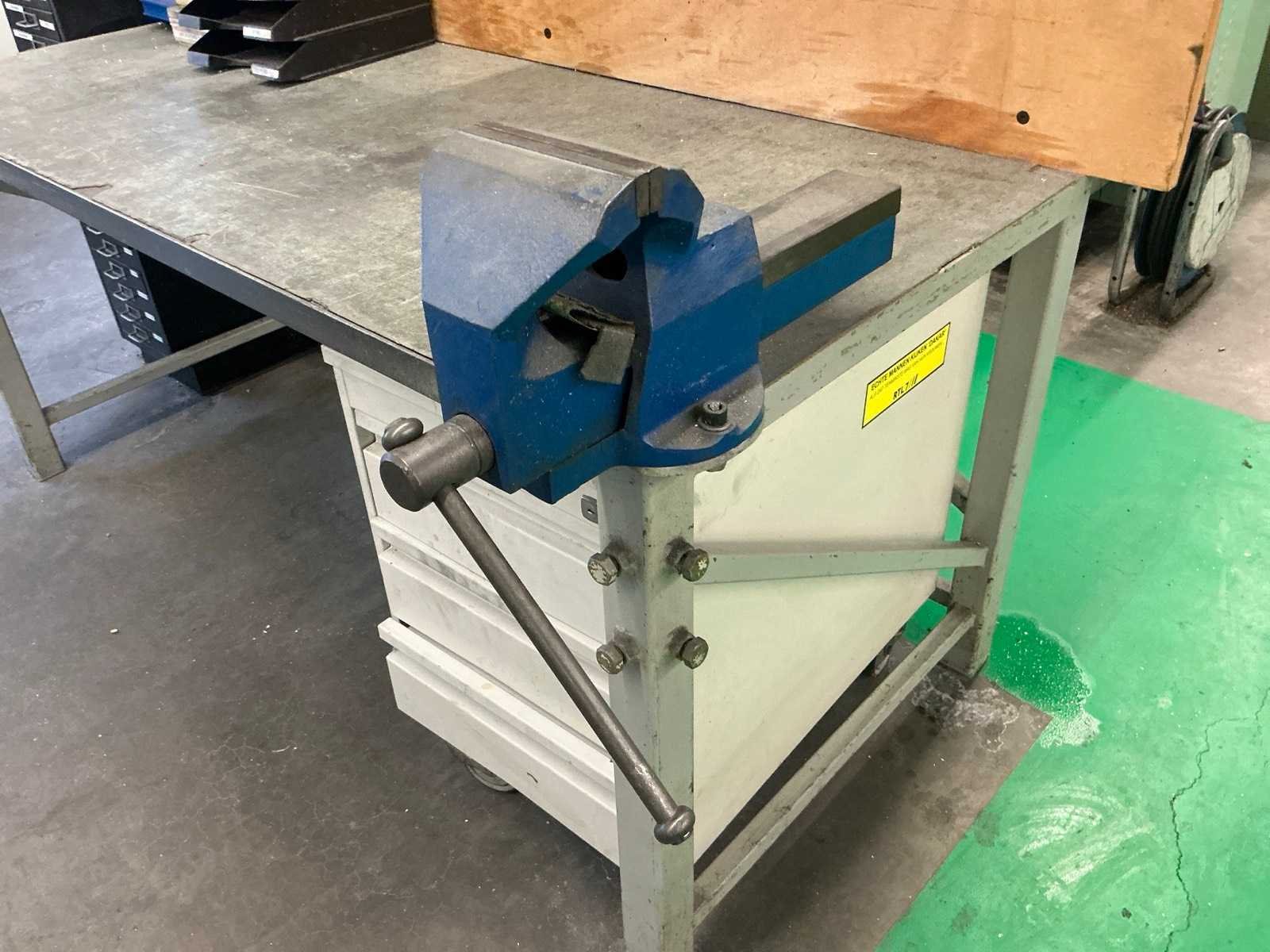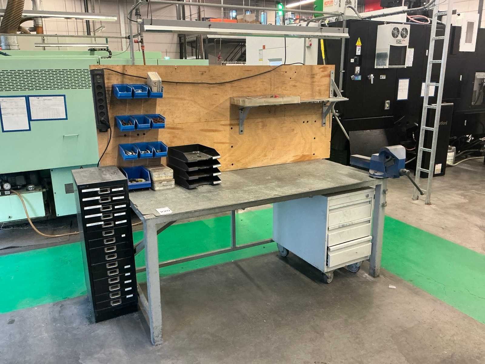 Voorzien van houten achterwand met lichtbalk, ladenblok, bankschroef, stalen ladenkast en diverse werkplaats materialen, schuurpapier en gereedschap Nee Totale afmeting L: 1800mm Totale afmeting Breedte: 800mm Totale afmeting Hoogte: 1900mm