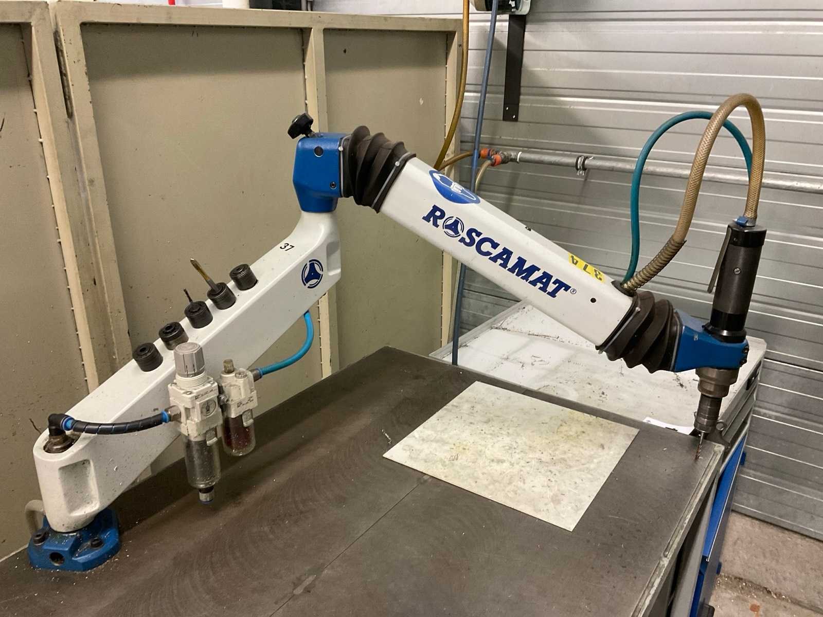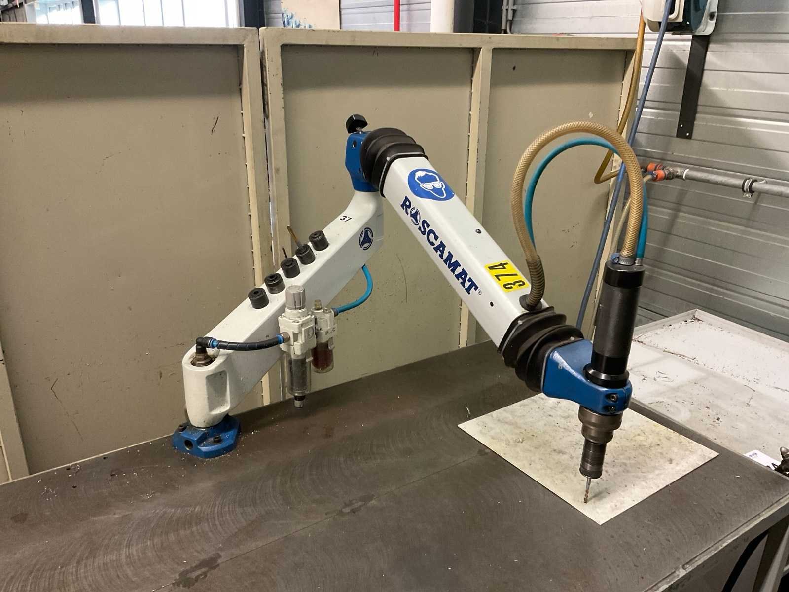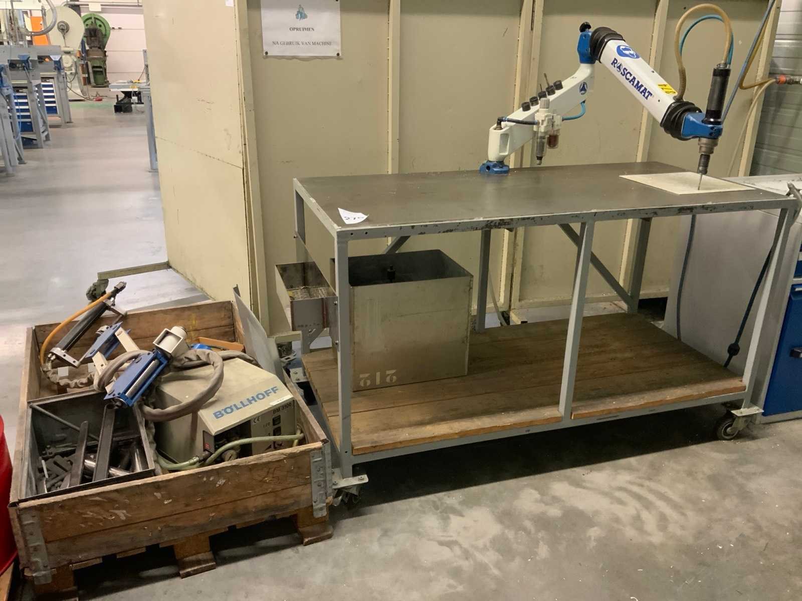 Panthograafarm tapmachine, op luchtdruk, inclusief werkbank van metaal op wielen, afmeting ca. 150 x 70 x 90 cm, werkbank niet demonteerbaar, tevens blaaspistool op haspel. Alsmede Böllhoff BM 3100 Nee Merk: Roscamat Type: 300 Serienummer: 11