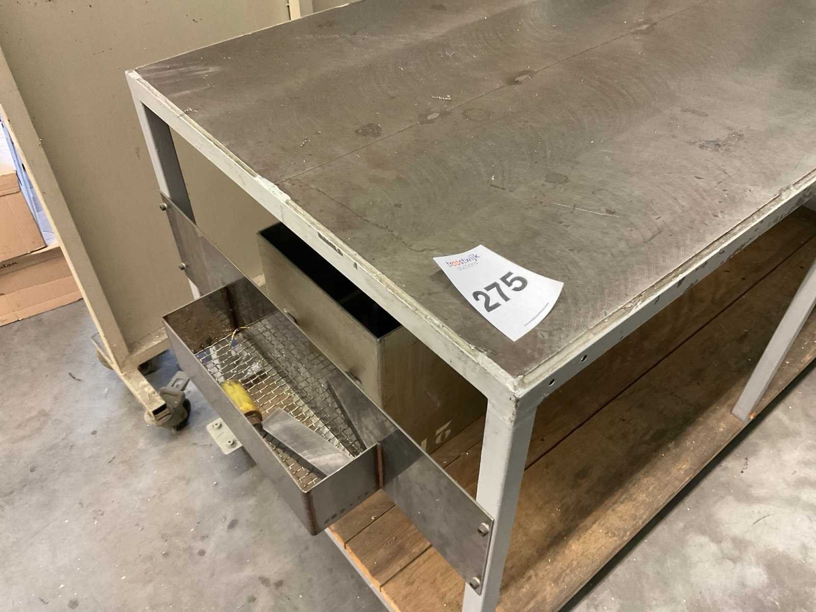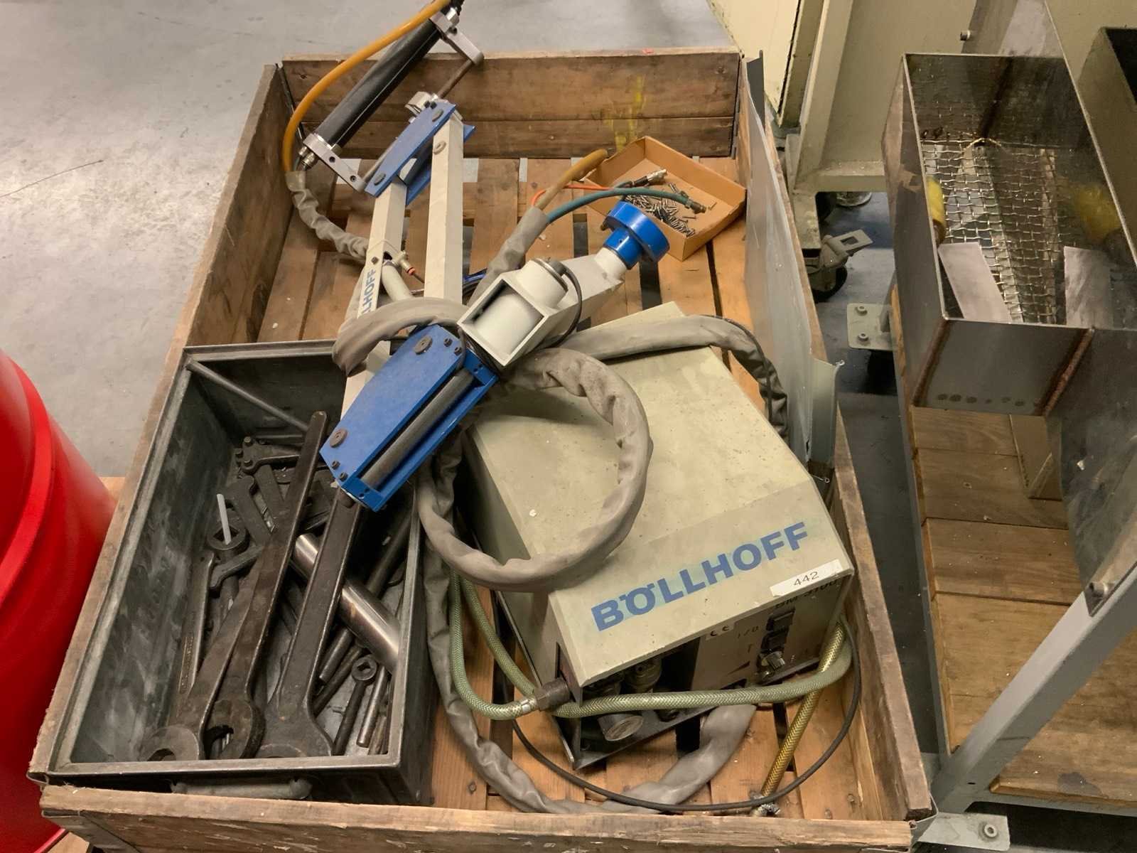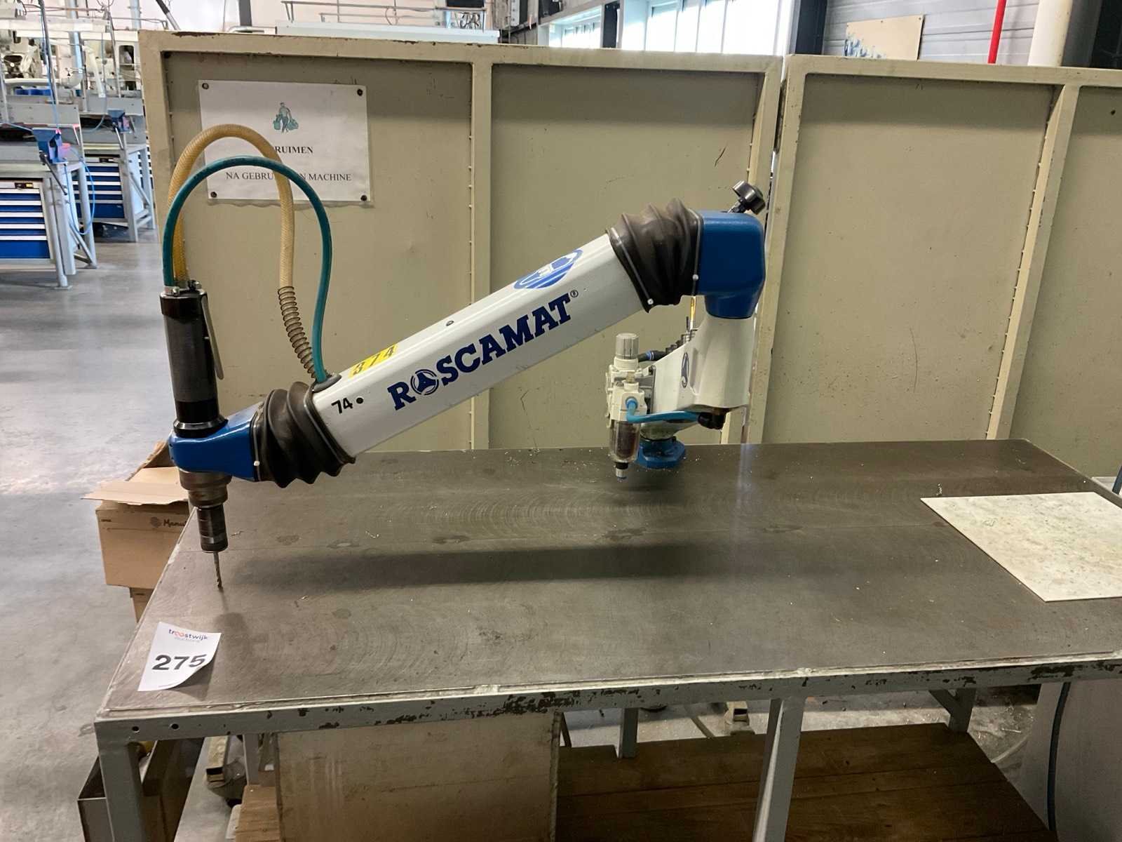 Panthograafarm tapmachine, op luchtdruk, inclusief werkbank van metaal op wielen, afmeting ca. 150 x 70 x 90 cm, werkbank niet demonteerbaar, tevens blaaspistool op haspel. Alsmede Böllhoff BM 3100 Nee Merk: Roscamat Type: 300 Serienummer: 11