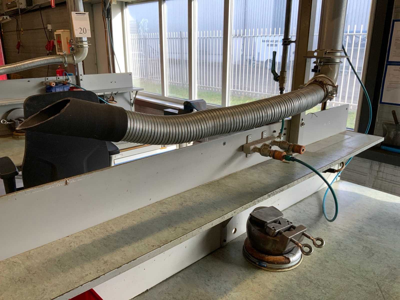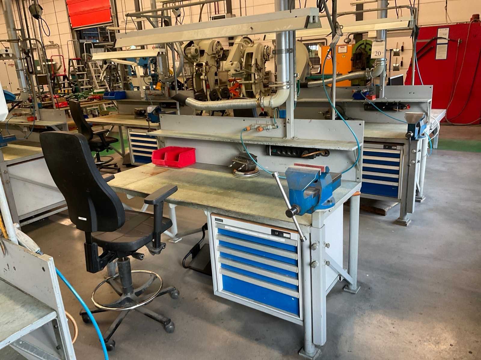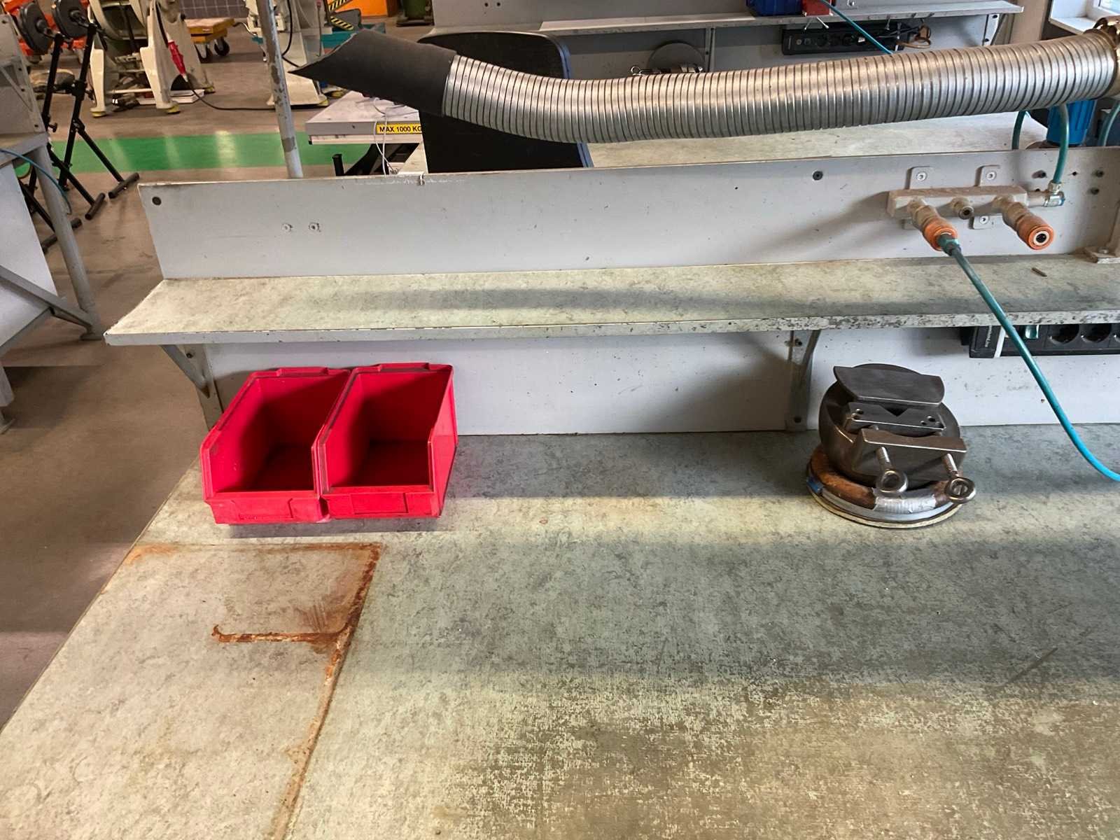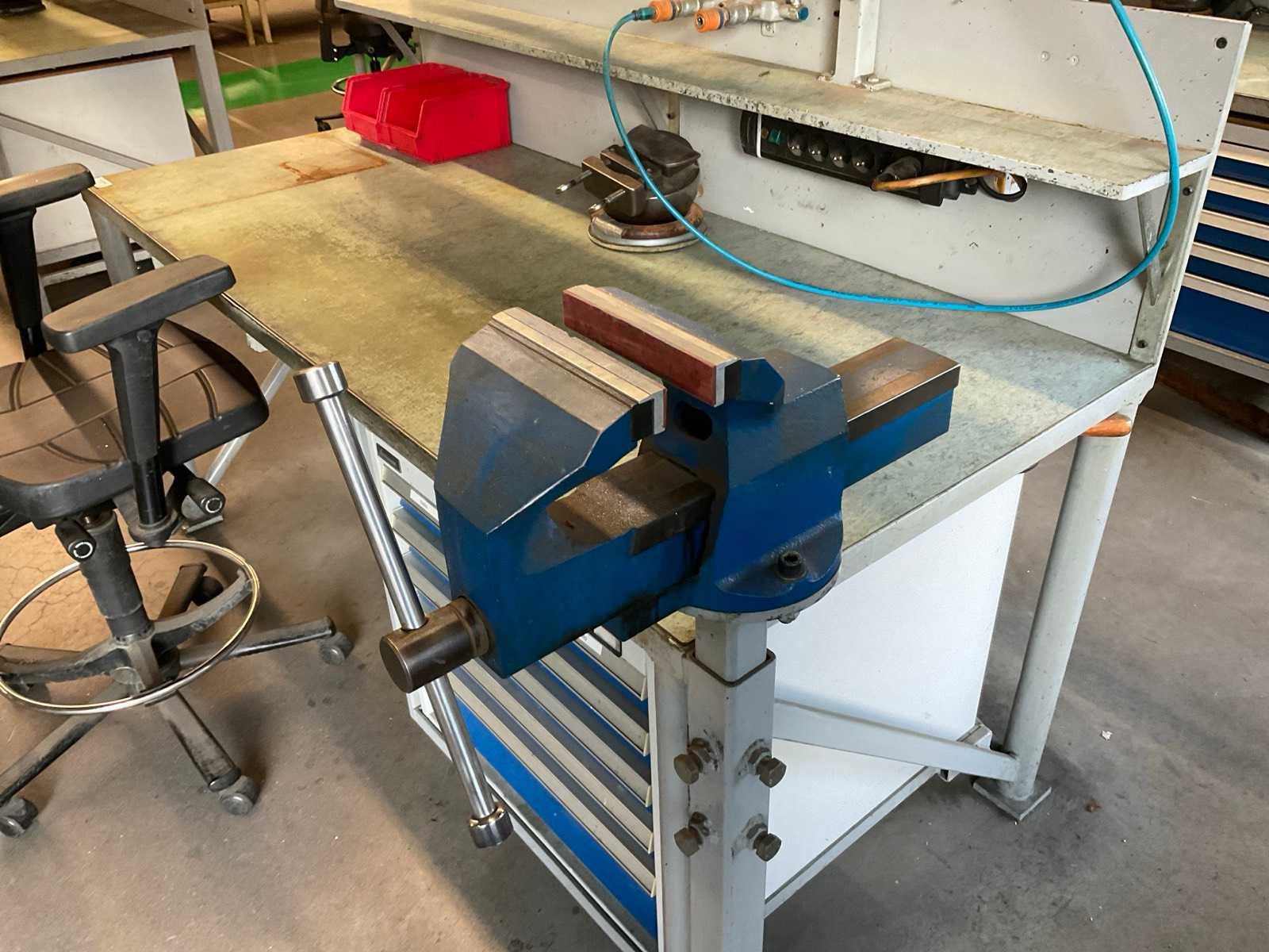 Metalen werkbank met verlichtingsbalk, bureaustoel en voetensteun, inclusief ladenblok met inhoud, inclusief gereedschap klem en bankschroef voorzien van perslucht welke koper los dient te koppelen voor aanvang wandgemonteerde buis. (Overige deel dient in het pand achter te blijven) Alsmede luchtafvoersysteem, welke koper los dient te koppelen net voor de aanvang van de wandgemonteerde buis Nee Merk: Garant Breedte: 810mm Lengte: 1880mm Hoogte: 2000mm Materiaal: Metaal