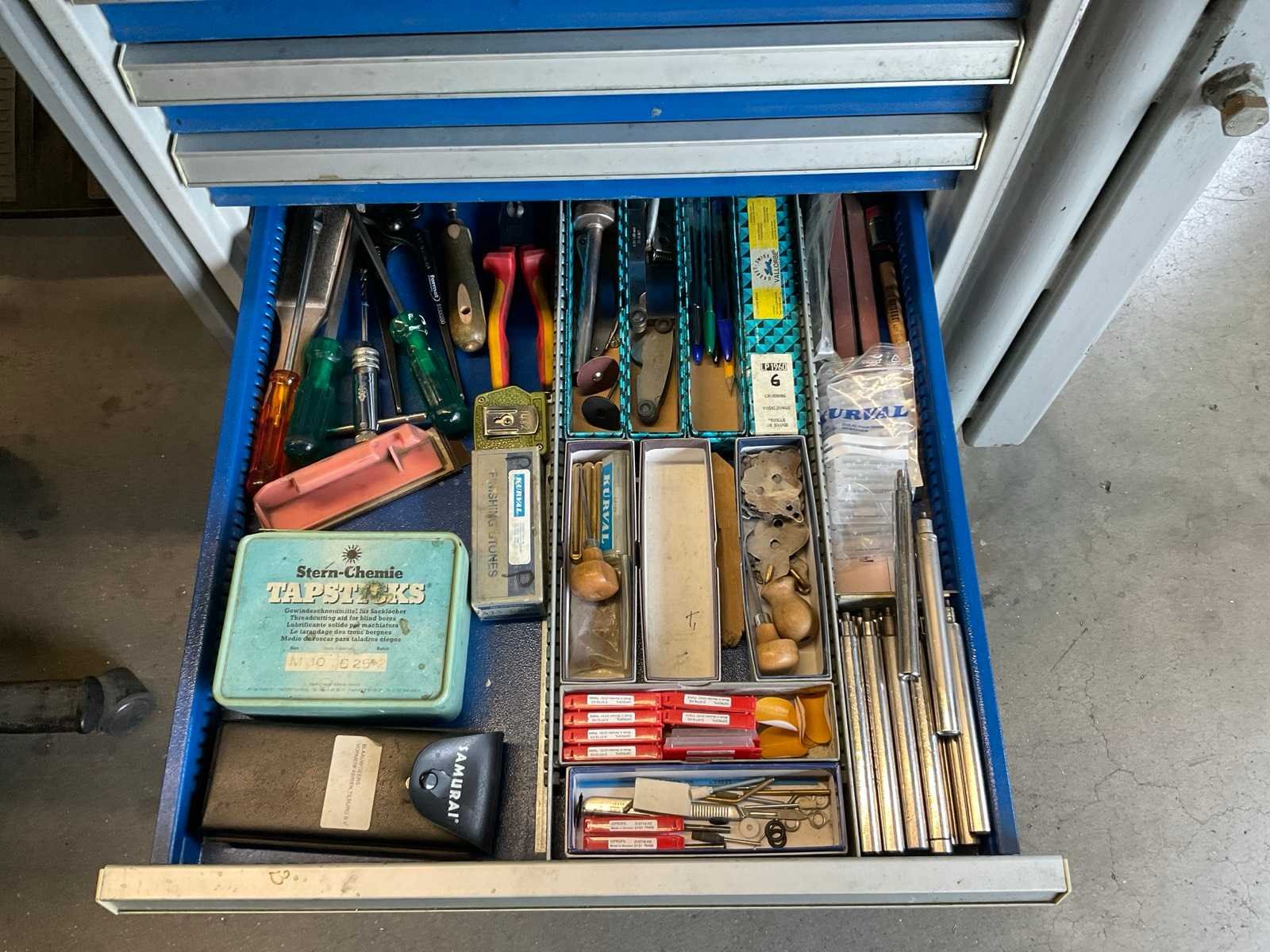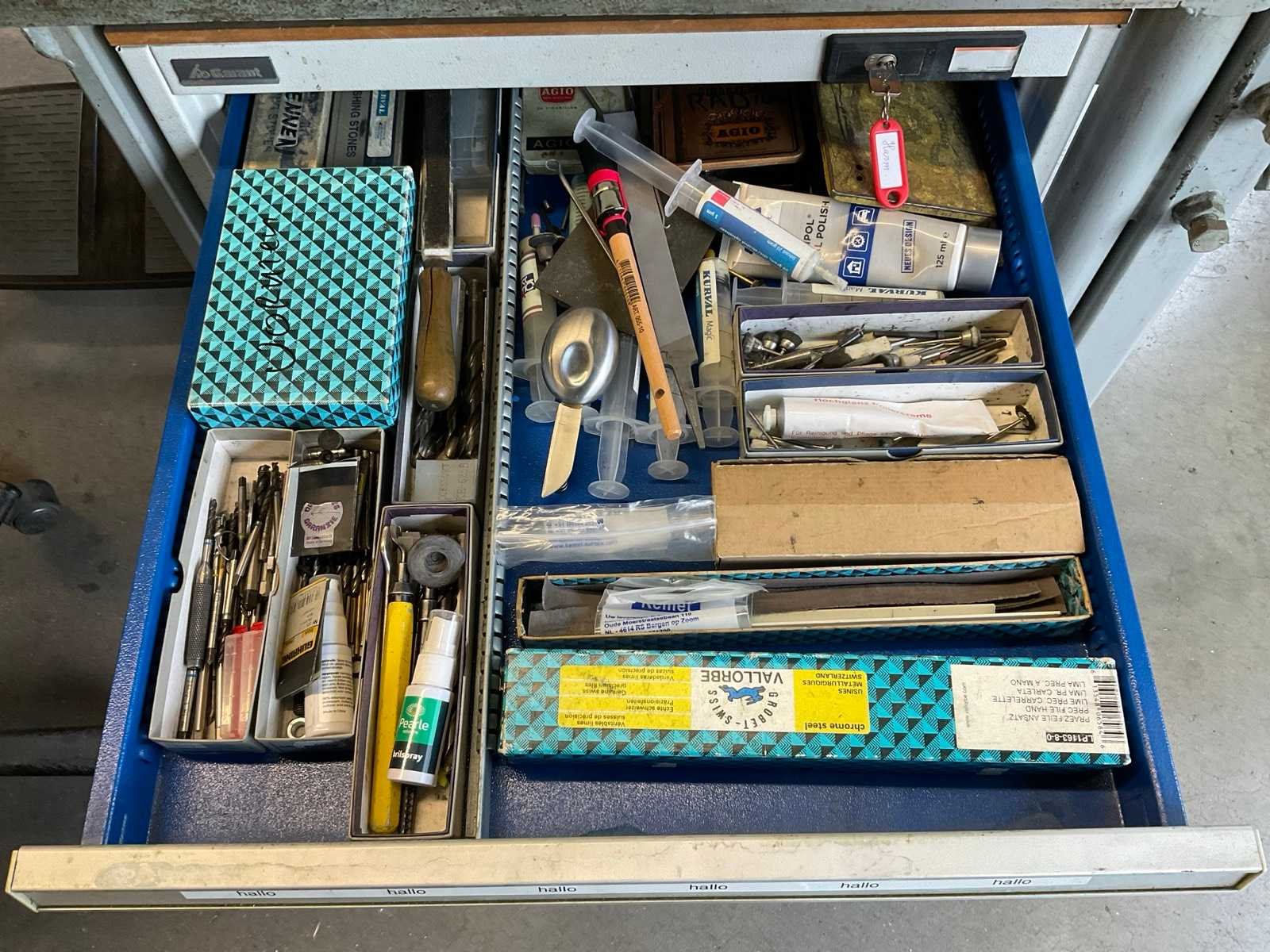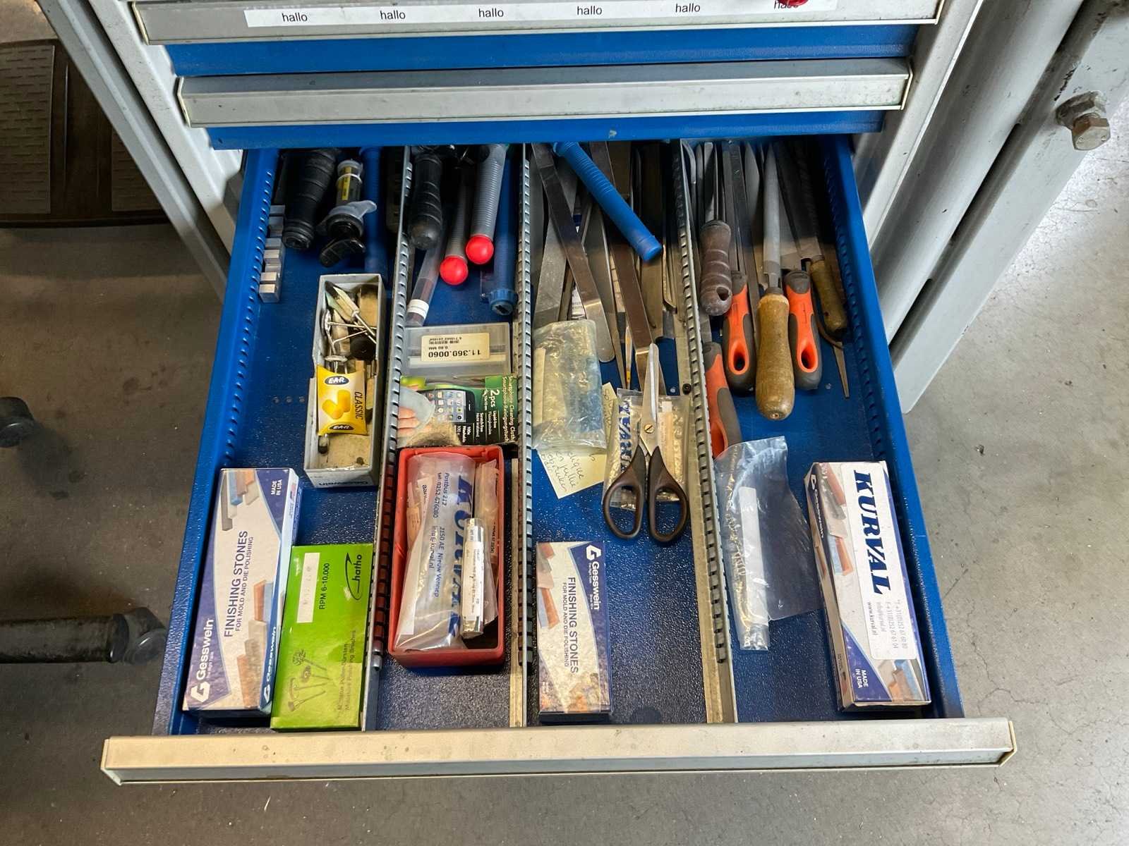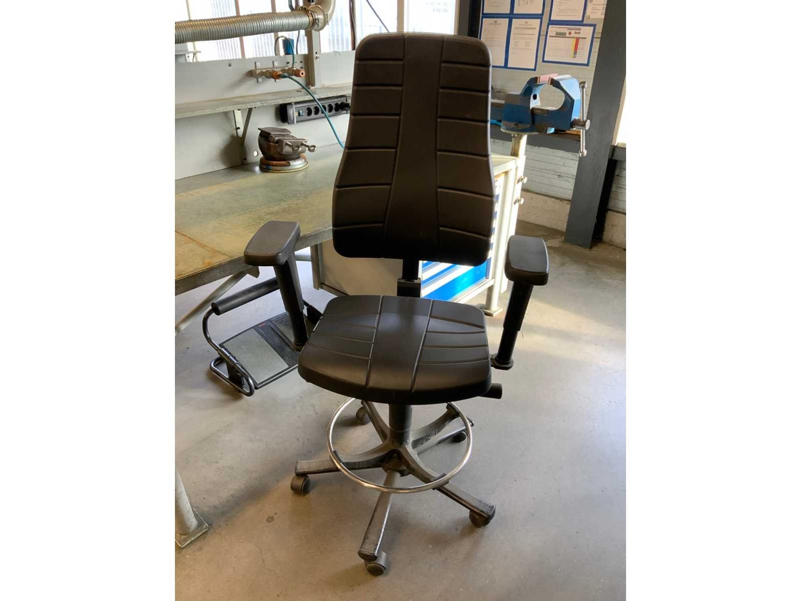Metalen werkbank met verlichtingsbalk, bureaustoel en voetensteun, inclusief ladenblok met inhoud, inclusief gereedschap klem en bankschroef voorzien van perslucht welke koper los dient te koppelen voor aanvang wandgemonteerde buis. (Overige deel dient in het pand achter te blijven) Alsmede luchtafvoersysteem, welke koper los dient te koppelen net voor de aanvang van de wandgemonteerde buis Nee Merk: Garant Breedte: 810mm Lengte: 1880mm Hoogte: 2000mm Materiaal: Metaal