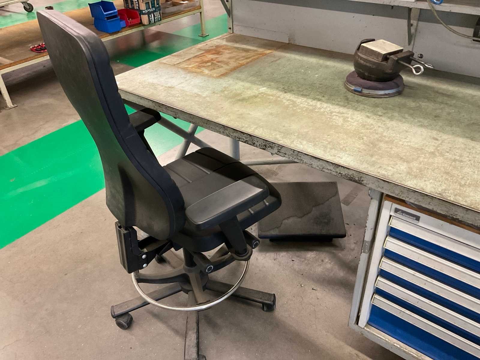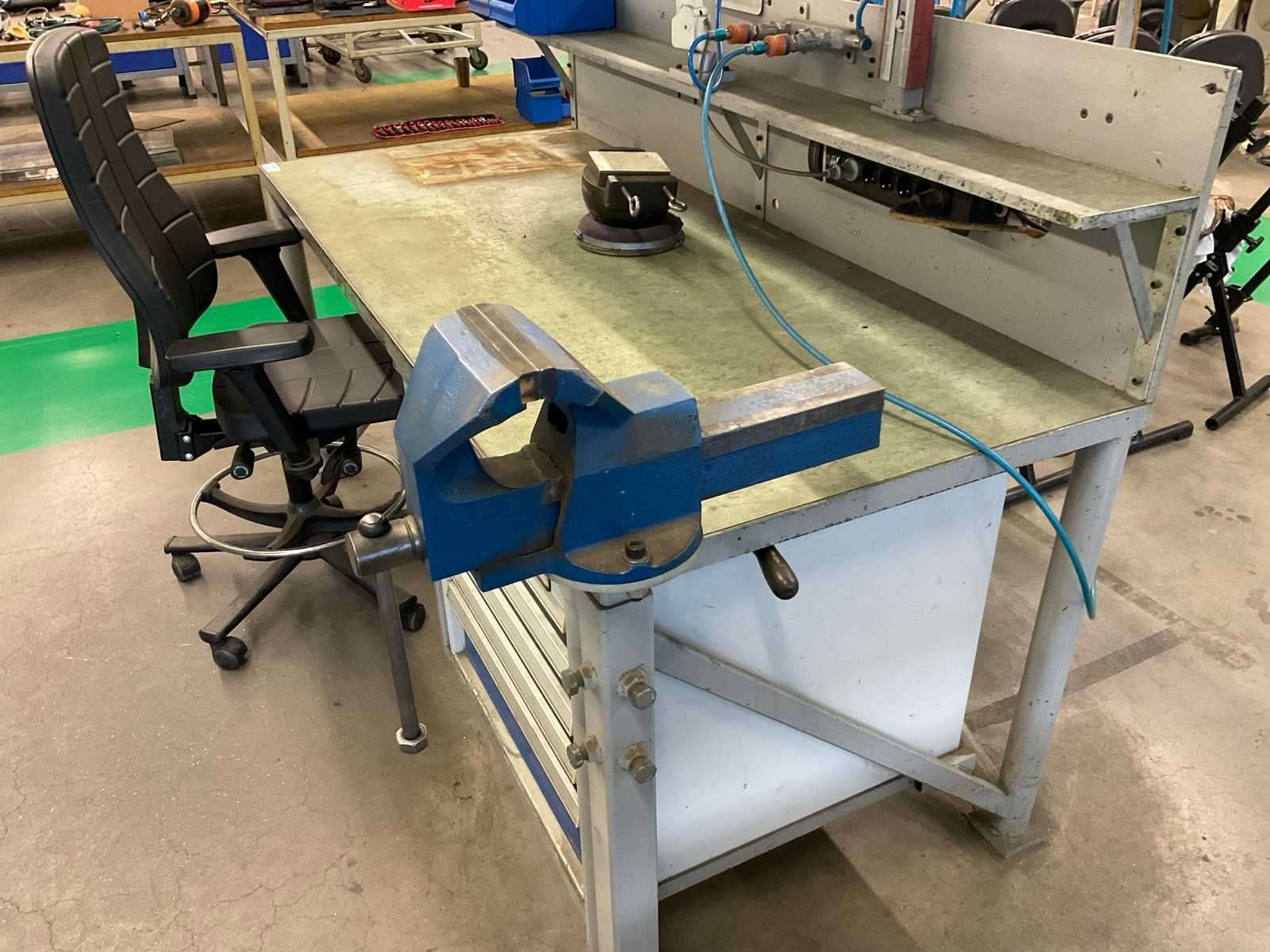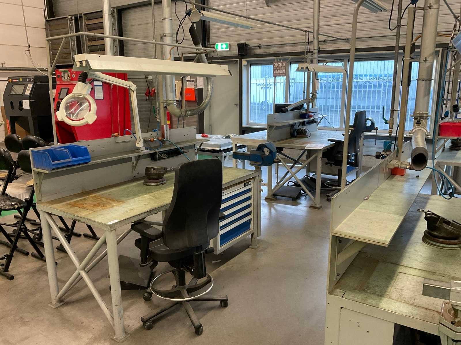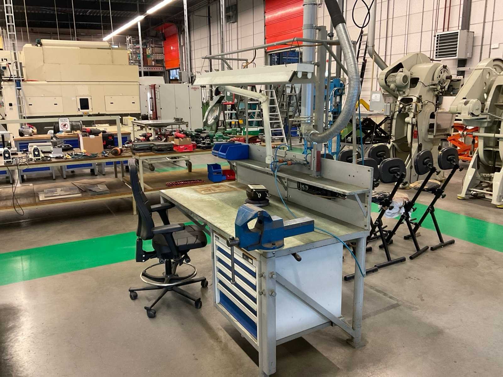 Metalen werkbank met verlichtingsbalk, bureaustoel en voetensteun, inclusief ladenblok met inhoud, inclusief gereedschap klem, loep op statief en bankschroef Voorzien van perslucht welke koper los dient te koppelen voor aanvang verticale buis welke toebehoort aan kavel 283 Alsmede luchtafvoersysteem, welke koper los dient te koppelen net voor de aanvang van de verticale buis Nee Merk: Garant Breedte: 810mm Lengte: 1880mm Hoogte: 2000mm Materiaal: Metaal