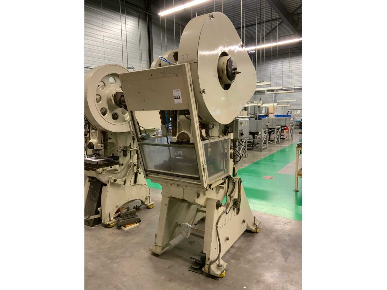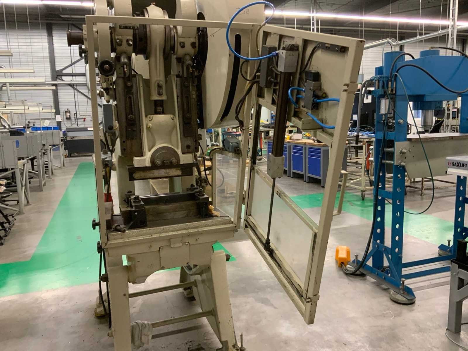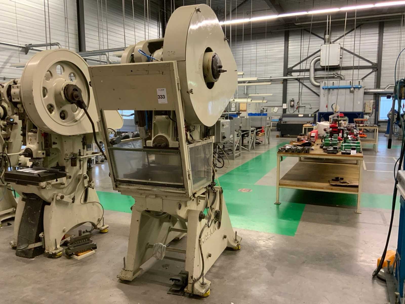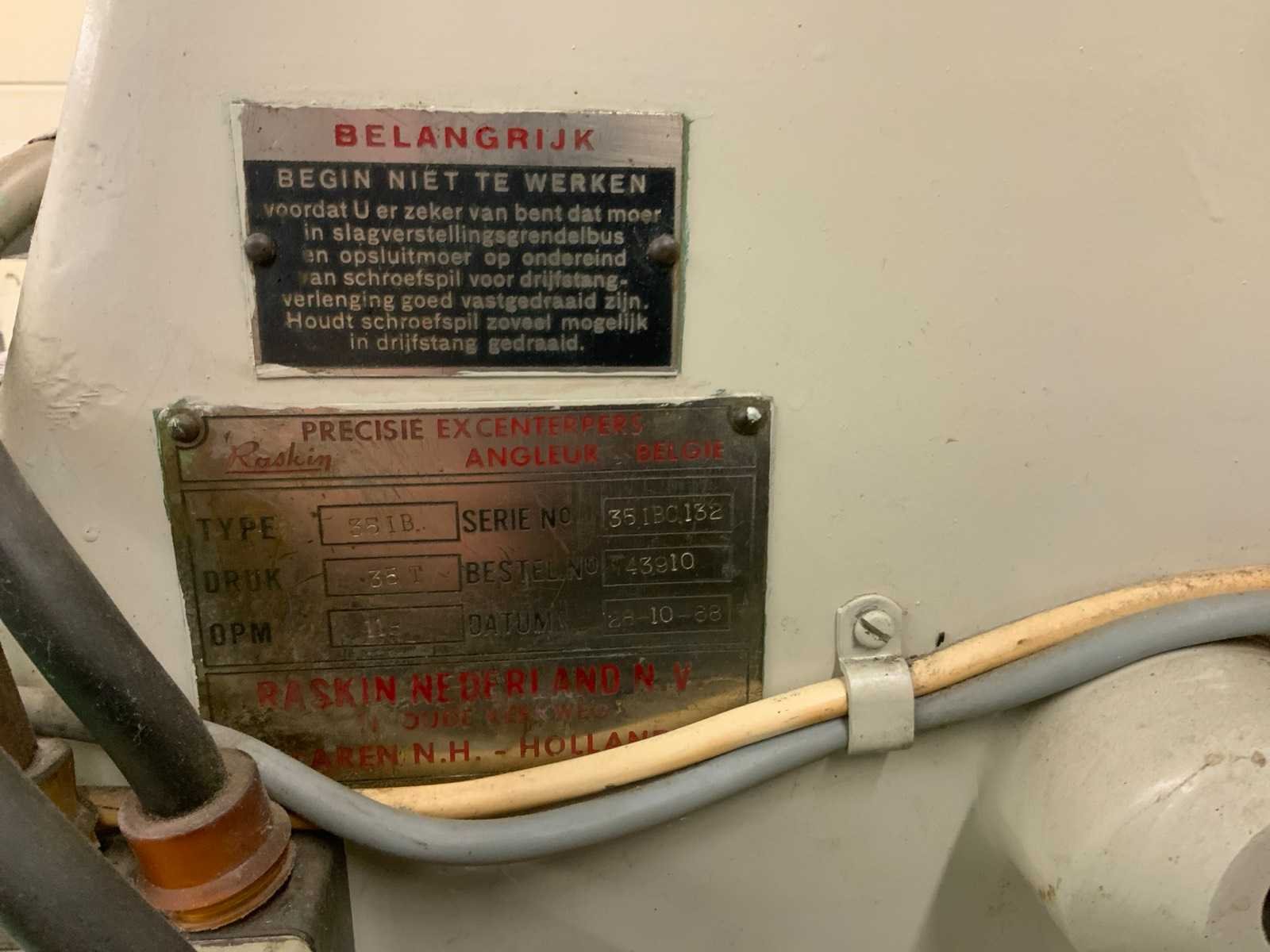 Raskin precisie excenterpers, type 351B, aansluiting 380v, tafelafmeting 60 x 40 cm Nee Merk: Raskin Type: 351B Serienummer: 351BO132 Capaciteit.: 35t Tafel afmeting l: 400mm Tafel afmeting b: 600mm Aansluiting: 400V Afmeting l: 950mm Afmeting b: 1600mm Afmeting h: 2300mm