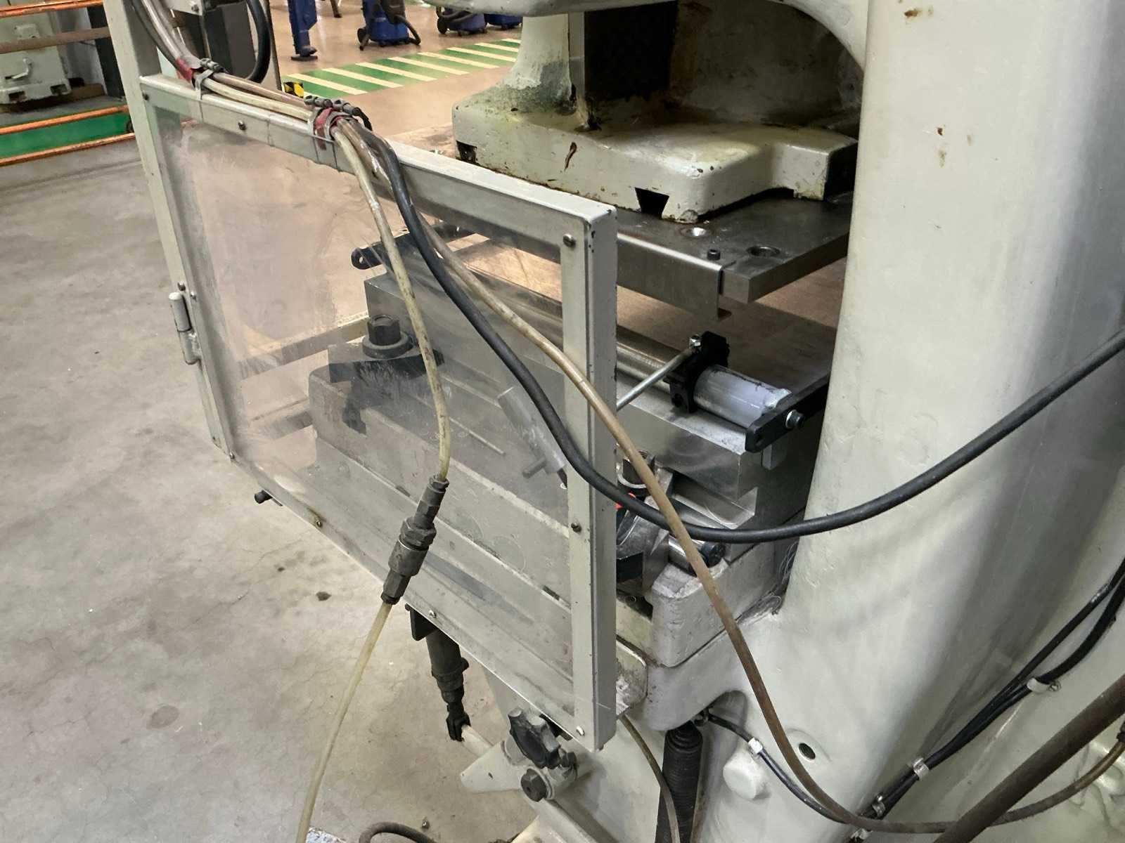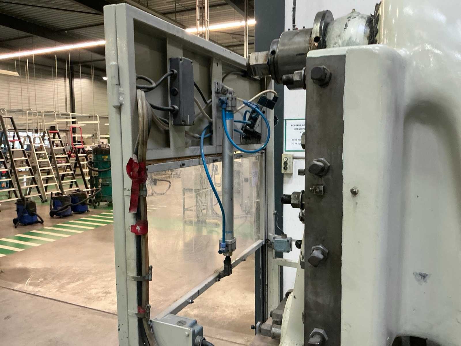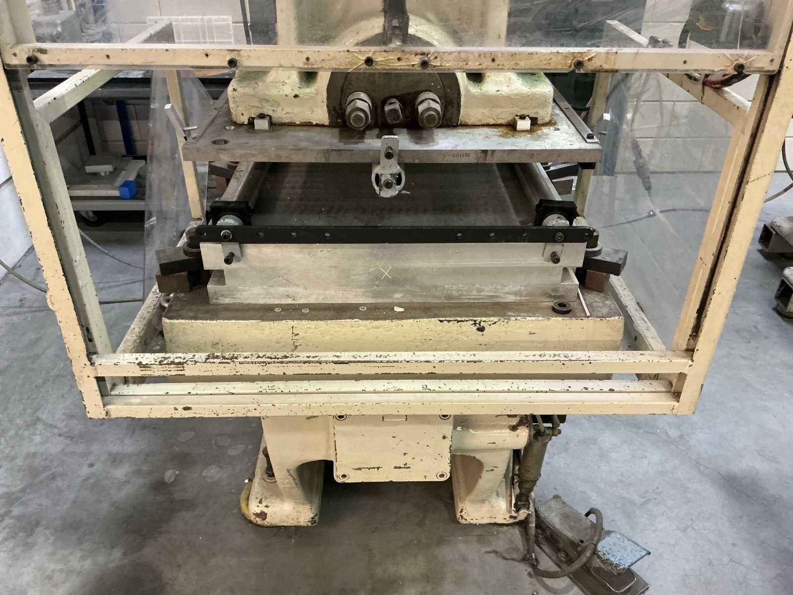 Voorzien van voetpedaal bediening, veiligheidsscherm Nee Merk: Raskin Type: R6A Bouwjaar: 1968 Serienummer: 100AH575 Capaciteit.: 100t Tafel afmeting l: 740mm Tafel afmeting b: 560mm Aansluiting: 400V Afmeting l: 2000mm Afmeting b: 950mm Afmeting h: 2300mm