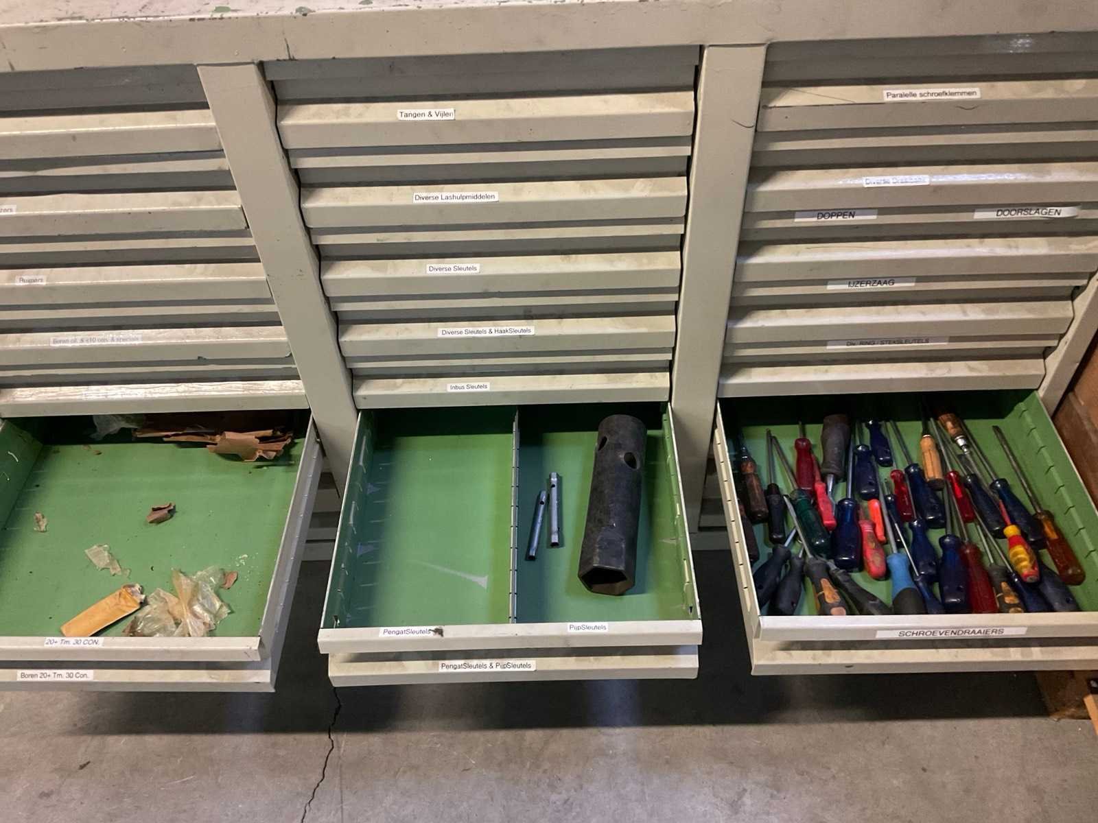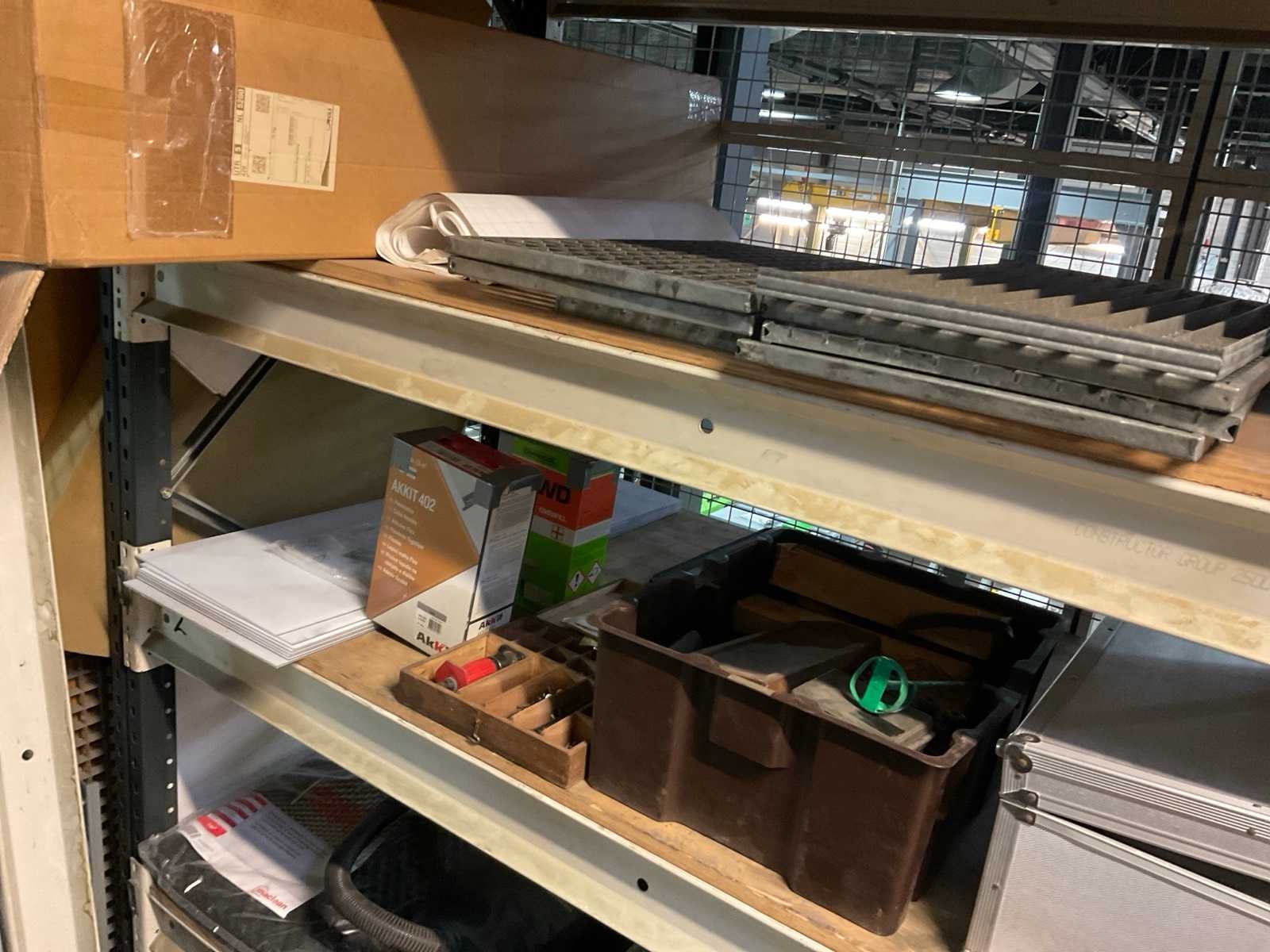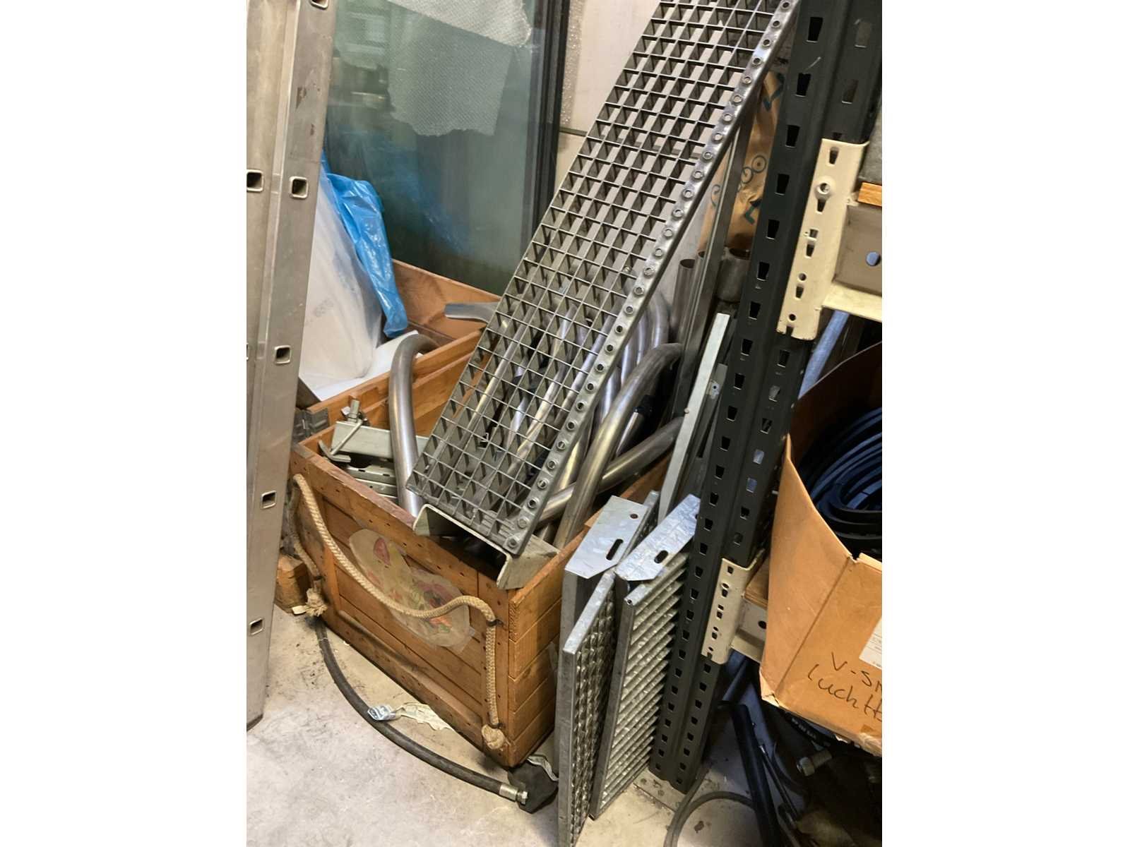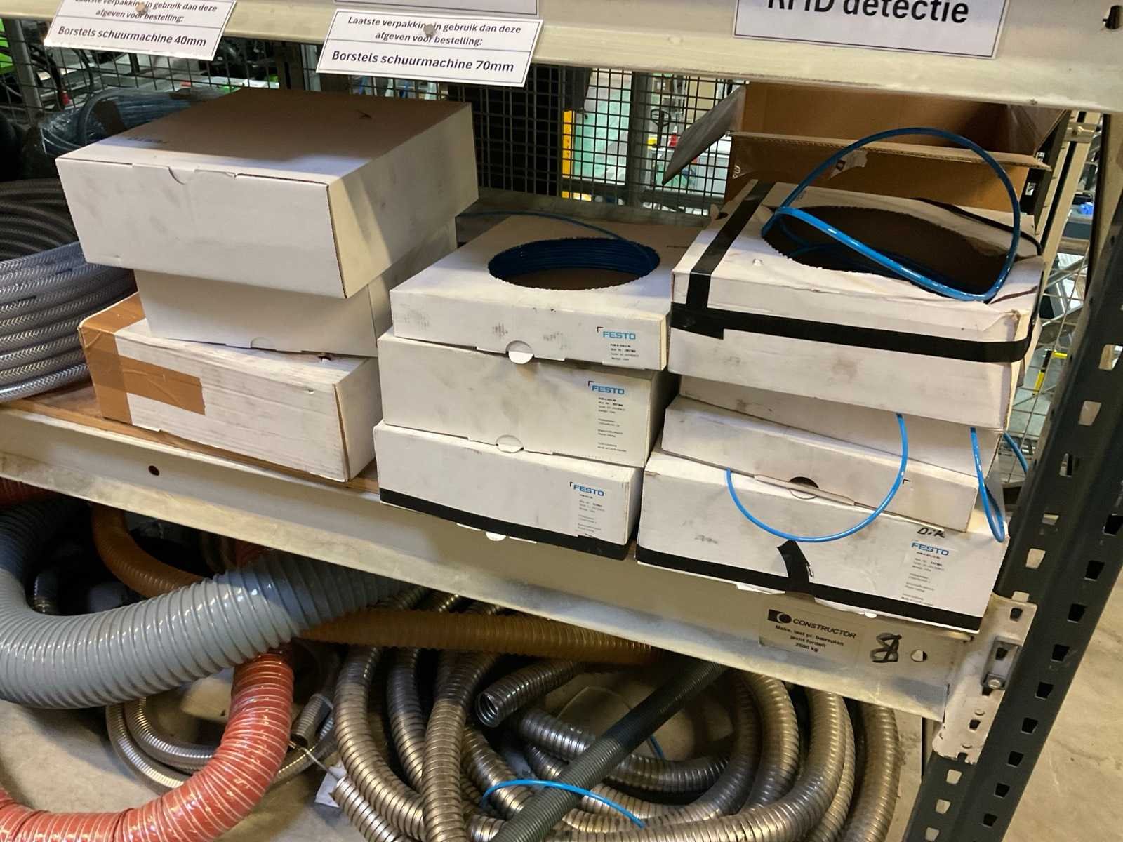 Bestaande uit diverse slangen, rollerbaan delen, ijzer, glas, hout en kunststof, rol filter, kratpallet Stalen ladekast met inhoud Stelling niet inbegrepen De koper dient het volledige kavel mee te nemen en de stelling leeg en netjes achter te laten. Nee Merk: Festo