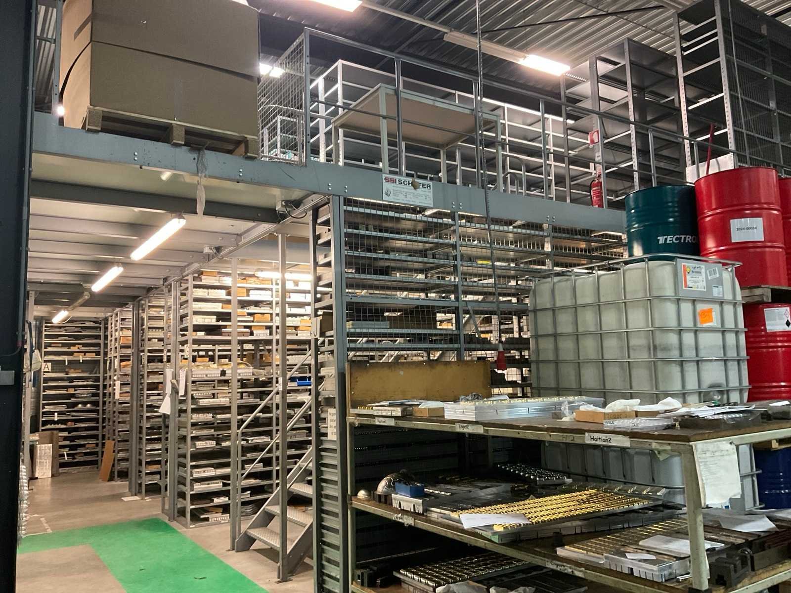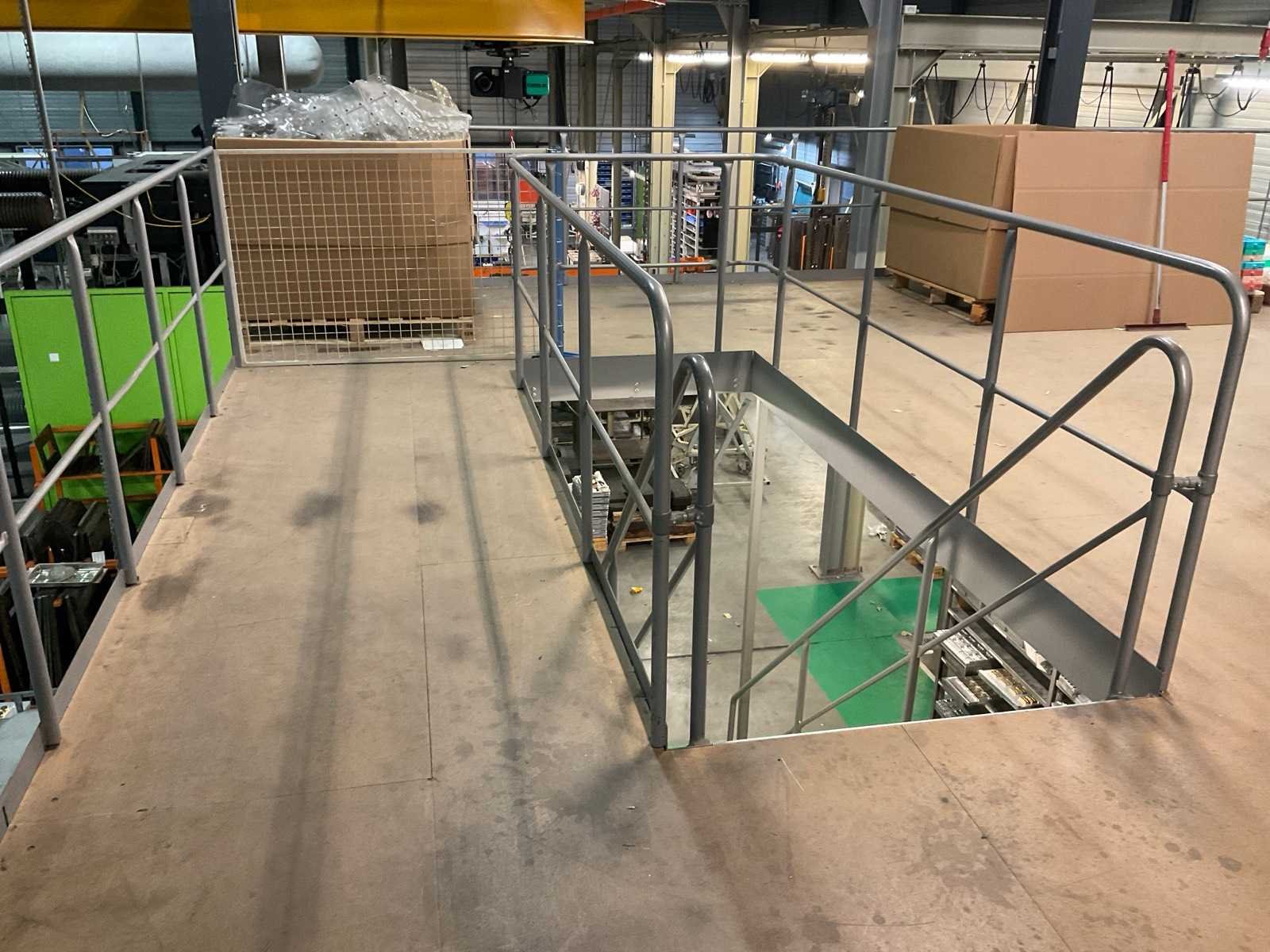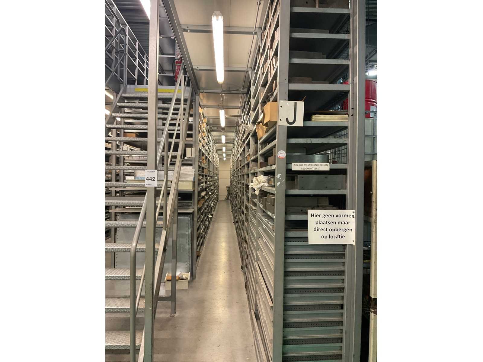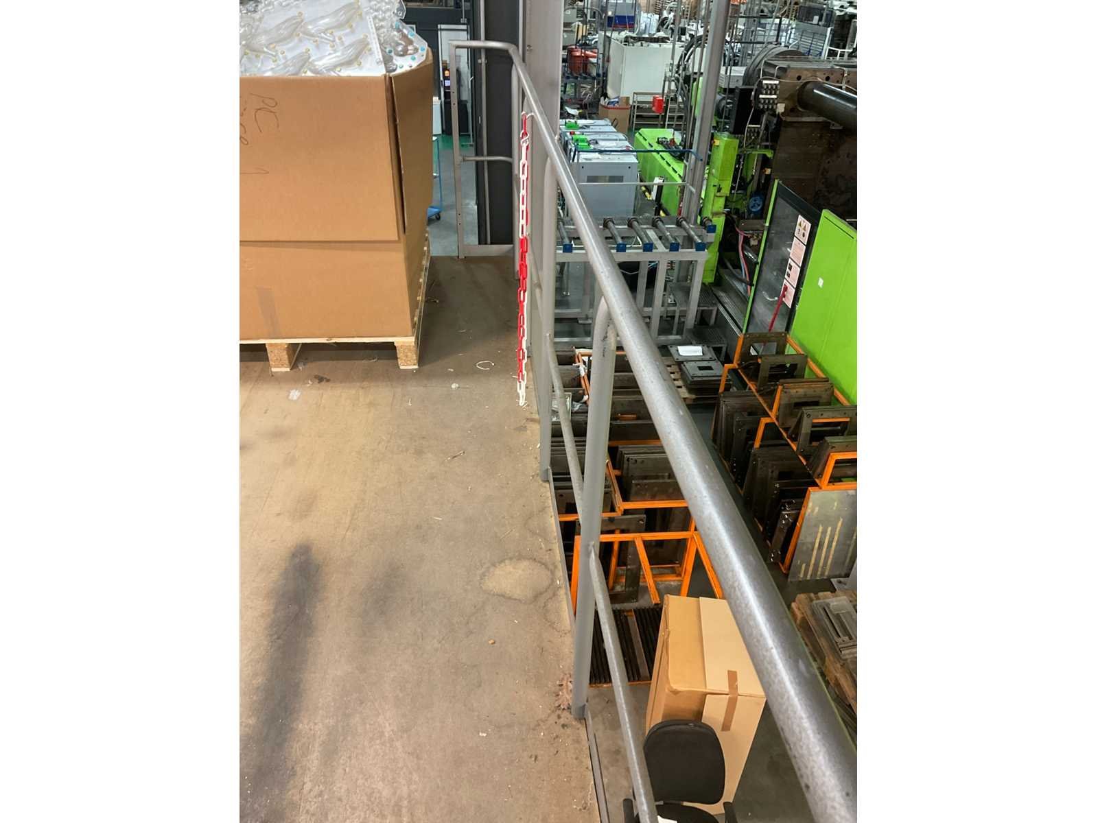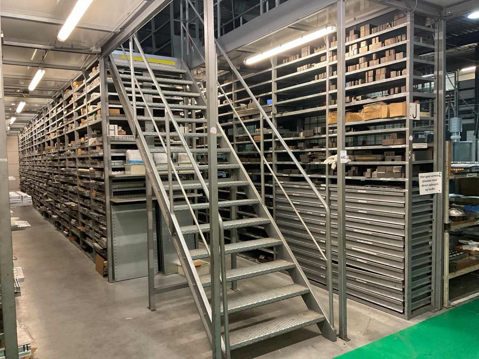 Bestaande uit bordesvloer 22x11 meter Belastbaarheid 500 kg/m2 Voorzien van verlichting Stalen trap voorzien van 15 traanplaat treden breedte ca. 108 cm en 2 leuningen 10 rijen stalen stelling bestaande uit 1x rij van 19secties met legborden en 22 laden 1x dubbele rij stelling van 16 secties (2x16) met legborden 3x dubbele rij stelling van 19 secties (2x19) met legborden 1x rij van 20 secties met legborden 1x rij van 4 secties met legborden Bovenkant entresol voorzien van leuningen Enkele stut palen, overige is gefixeerd aan de stellingen De inhoud is niet inbegrepen. Stellingen en overige zaken op de entresol niet inbegrepen Nee Merk: Schäfer Type: R4000 Bouwjaar: 2002 Totale afmeting L: 21500mm Totale afmeting Breedte: 10500mm Totale afmeting Hoogte: 4000mm Vloerhoogte: 2980mm Houten vloer: true Met trap: true