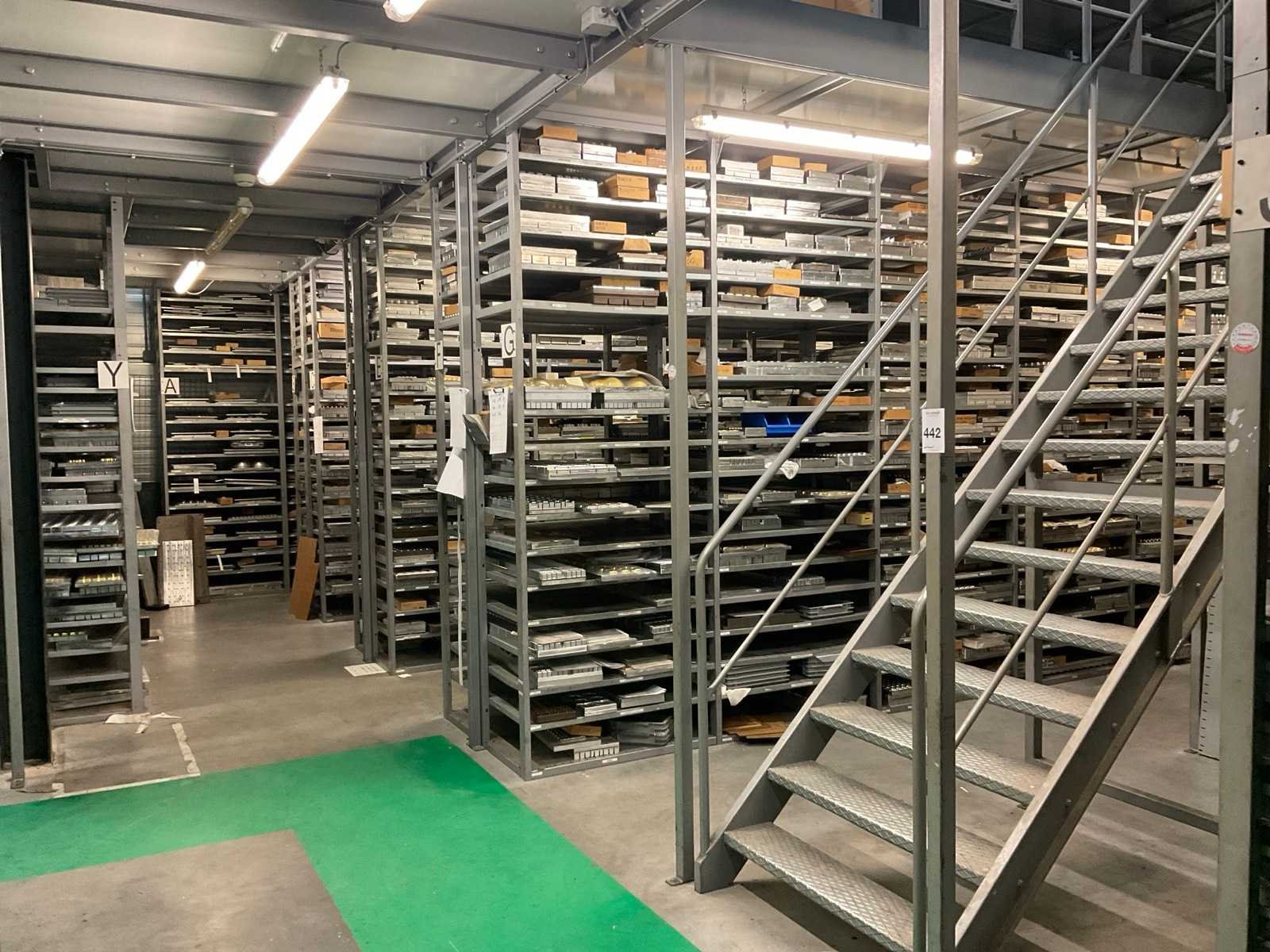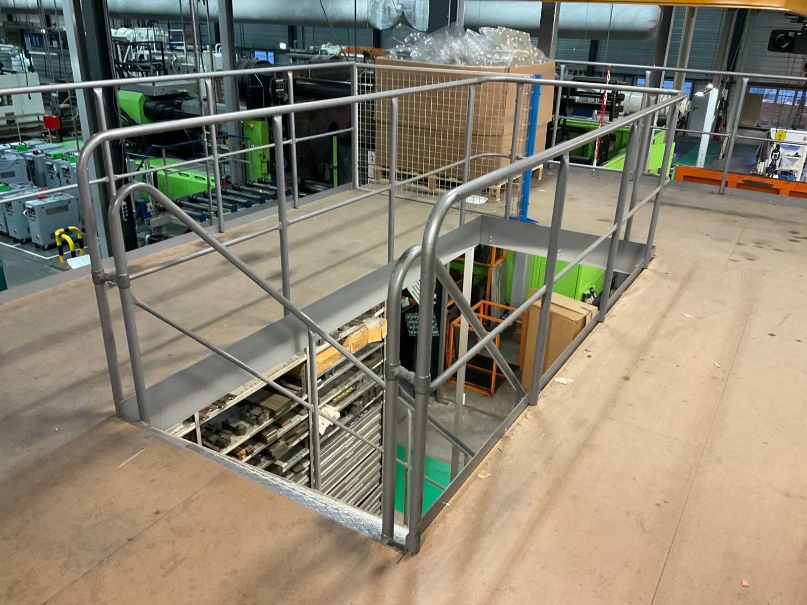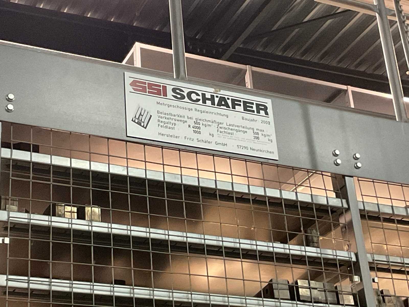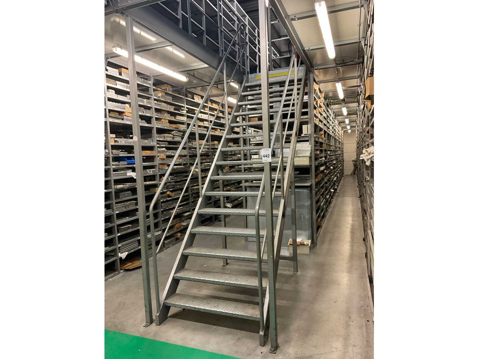 Bestaande uit bordesvloer 22x11 meter Belastbaarheid 500 kg/m2 Voorzien van verlichting Stalen trap voorzien van 15 traanplaat treden breedte ca. 108 cm en 2 leuningen 10 rijen stalen stelling bestaande uit 1x rij van 19secties met legborden en 22 laden 1x dubbele rij stelling van 16 secties (2x16) met legborden 3x dubbele rij stelling van 19 secties (2x19) met legborden 1x rij van 20 secties met legborden 1x rij van 4 secties met legborden Bovenkant entresol voorzien van leuningen Enkele stut palen, overige is gefixeerd aan de stellingen De inhoud is niet inbegrepen. Stellingen en overige zaken op de entresol niet inbegrepen Nee Merk: Schäfer Type: R4000 Bouwjaar: 2002 Totale afmeting L: 21500mm Totale afmeting Breedte: 10500mm Totale afmeting Hoogte: 4000mm Vloerhoogte: 2980mm Houten vloer: true Met trap: true