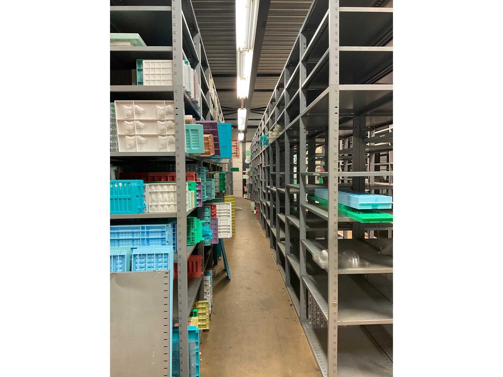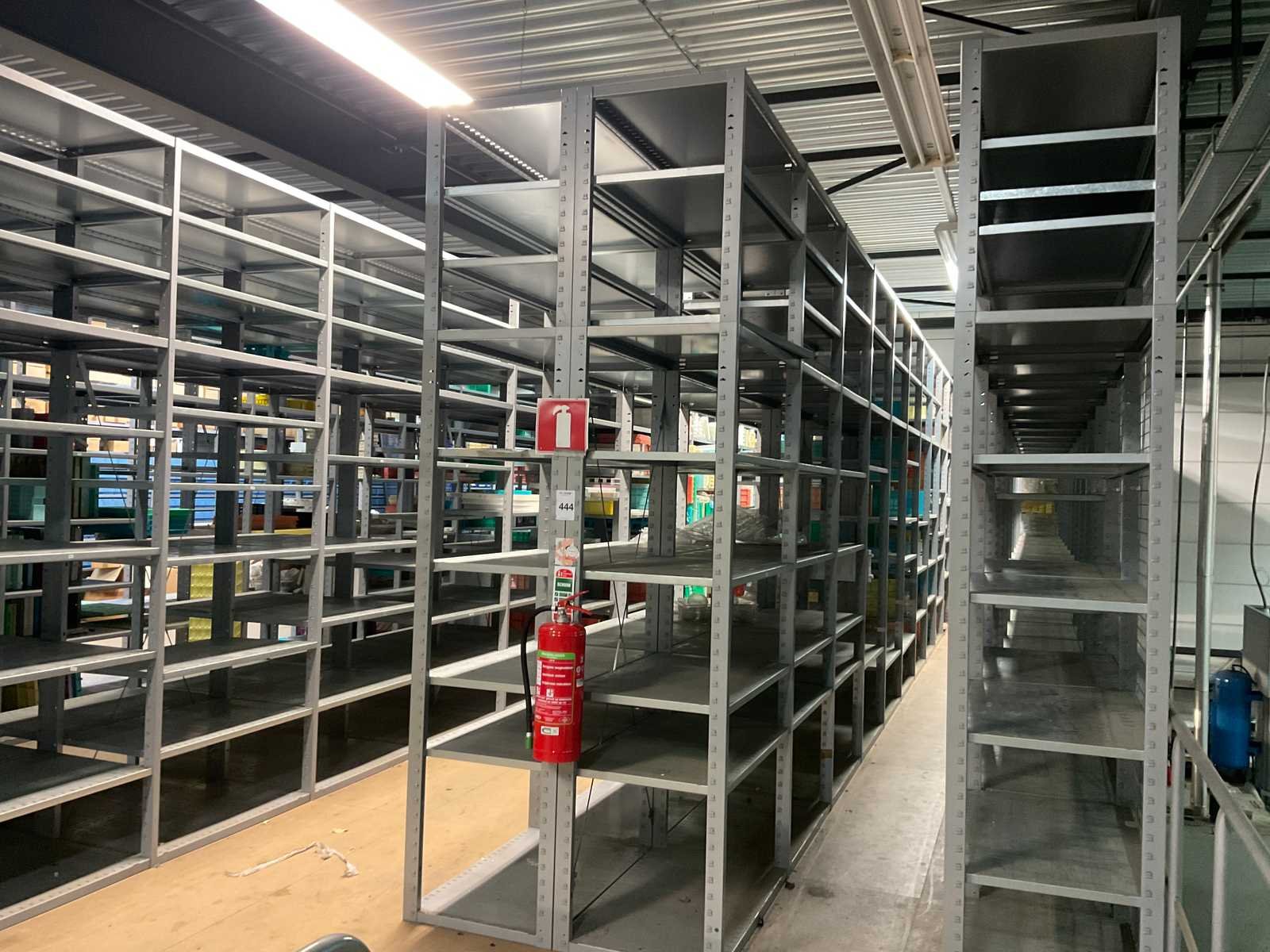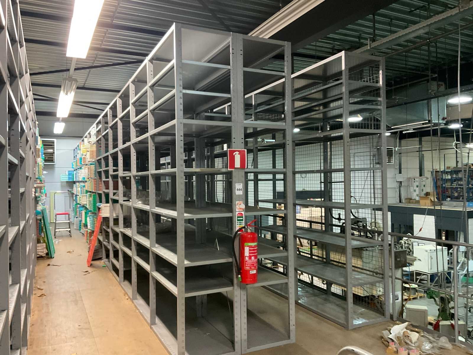 Inhoud op entresol bestaande uit 3 rijen van 14 secties met legborden 2 rijen van 17 secties met legborden 1 rij van 12 secties met legborden en bakjes 1 stelling van 3 secties met legborden 3 tafels En draadgaaswand Let op; inhoud van de stellingen is niet inbegrepen De koper dient het volledige kavel mee te nemen en de entresol leeg en netjes achter te laten. Nee Aantal secties: 91