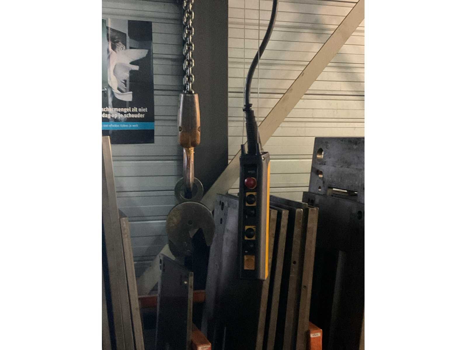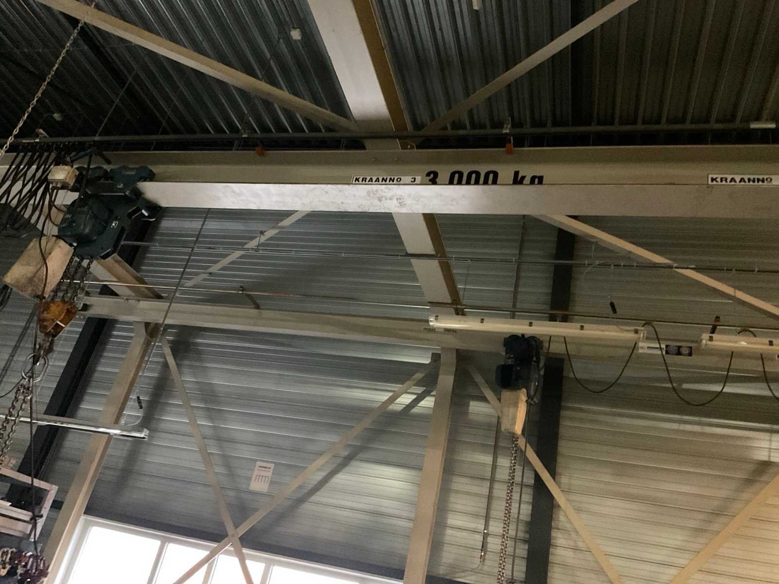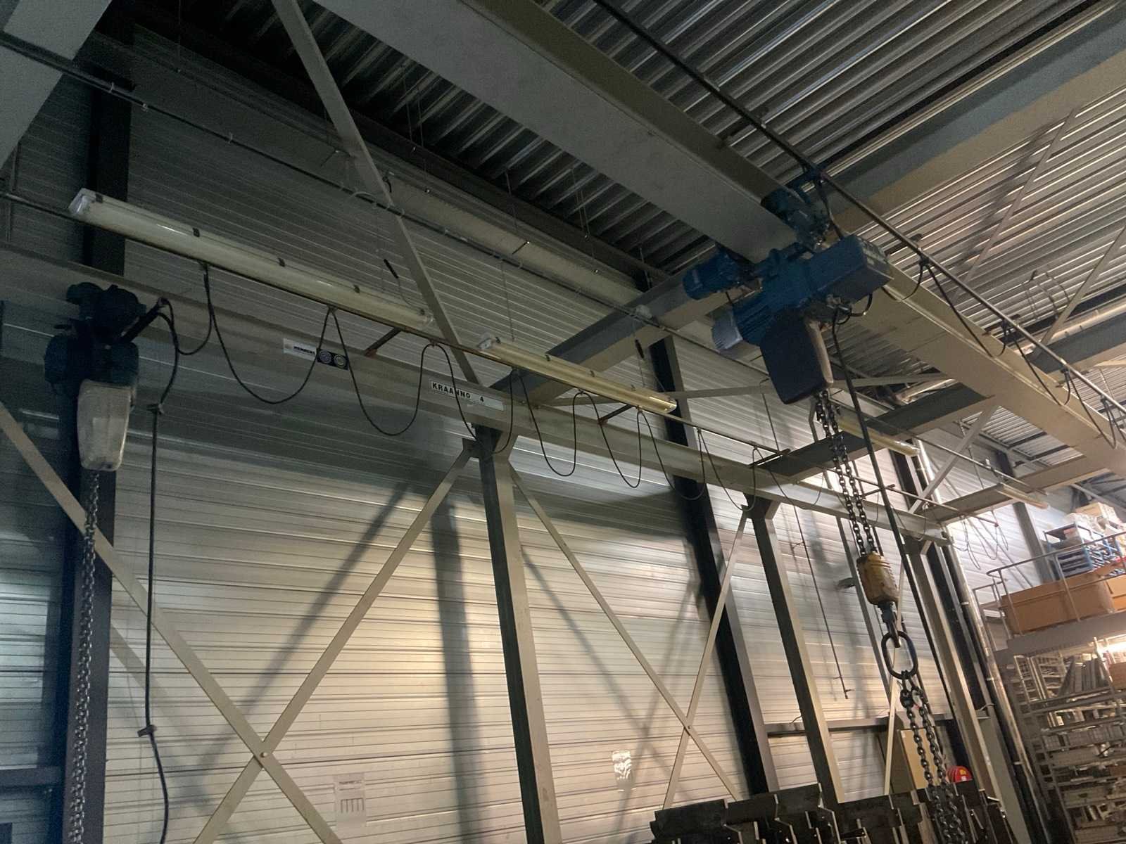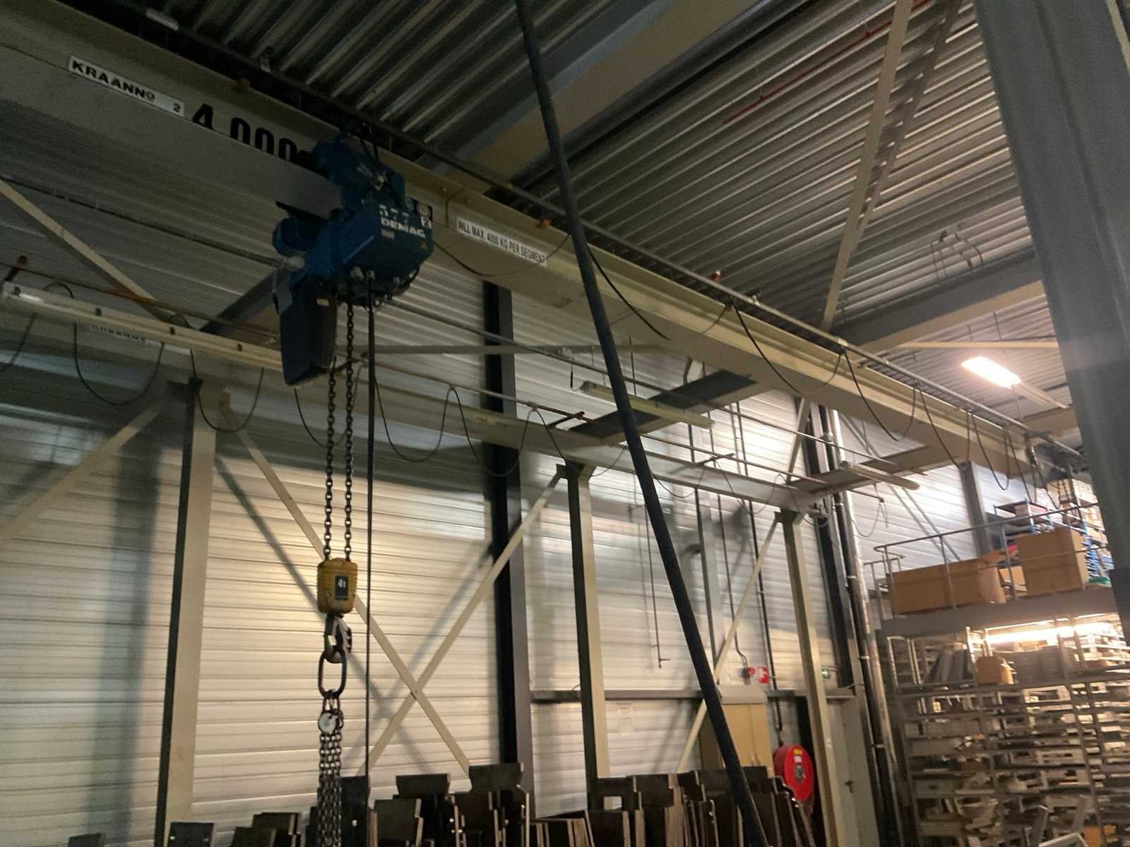 Bestaande uit portaal bestaande uit 10 kolommen voorzien van 1 elektro kettingtakel Demag cap. 3 ton met rijmotor 1 elektro kettingtakel Demag cap. 4 ton met rijmotor op middenrail 1 monorail met kettingtakel Demag cap. 2 ton met rijmotor Nee Merk: Demag Overspanning: 1600m Hijsvermogen: 4000kg Totale afmeting L: 16000mm Totale afmeting Breedte: 5800mm Totale afmeting Hoogte: 5500mm